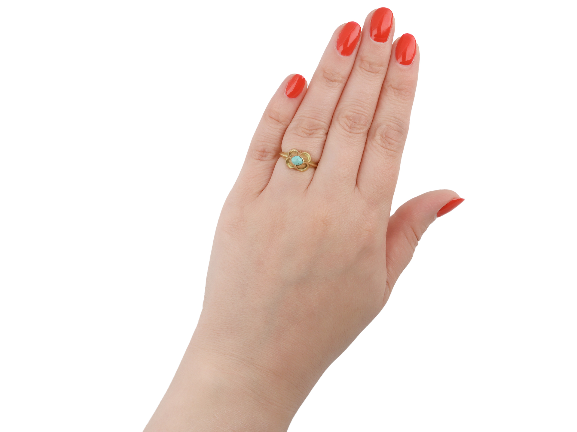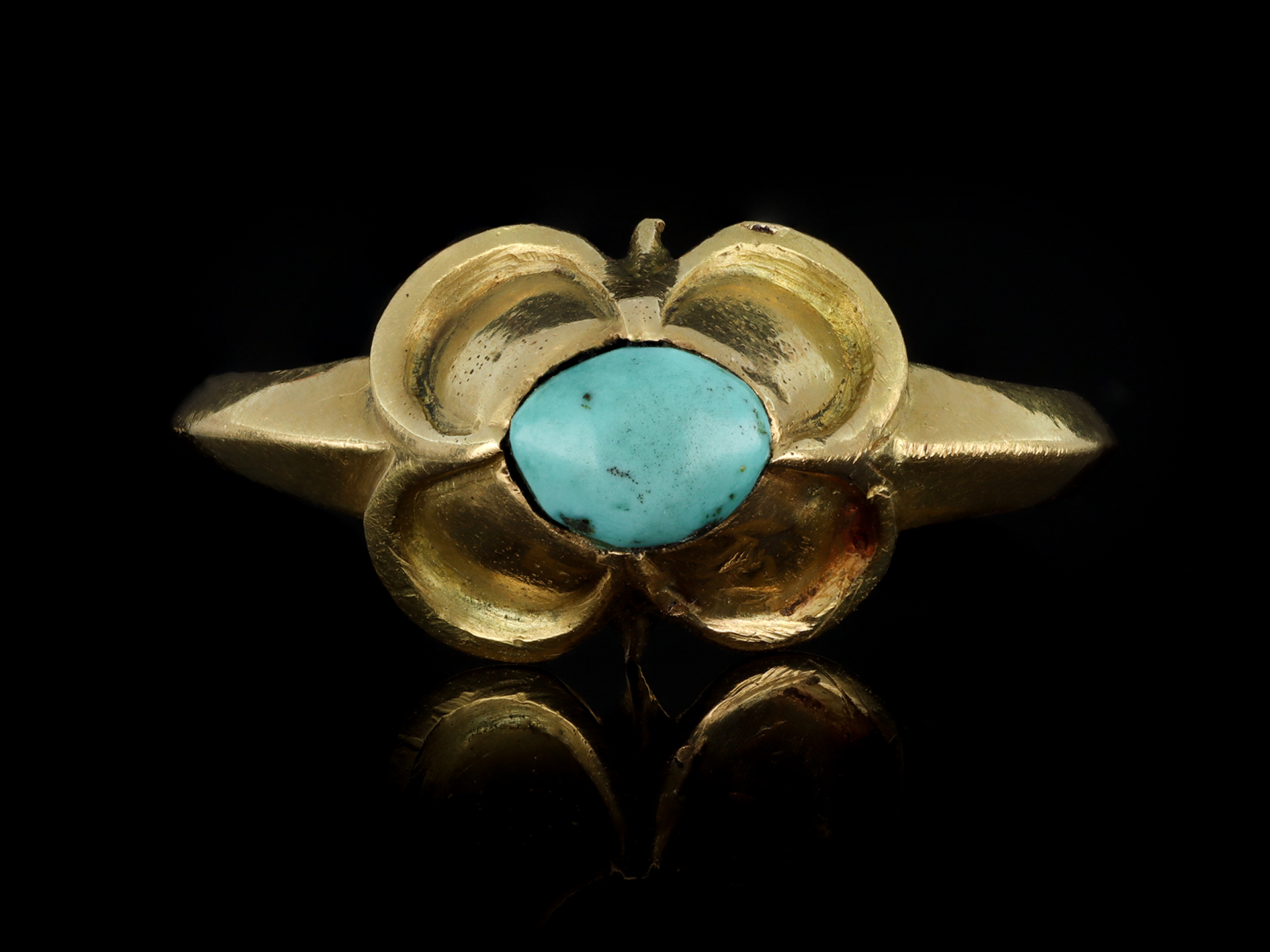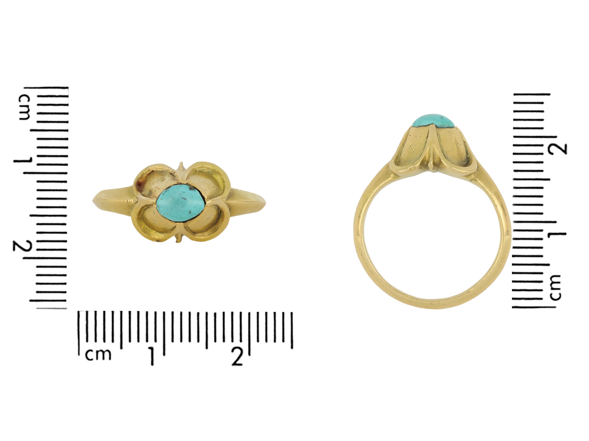Medieval turquoise stirrup ring. Set with an oval cabochon natural turquoise in a closed back rubover and claw setting, to an impressive stirrup design featuring a raised bezel with a quatrefoil design, a carved gallery and closed backholing, leading to tapering chamfered shoulders and flowing through to a solid shank. Tested yellow gold, circa 15th century.