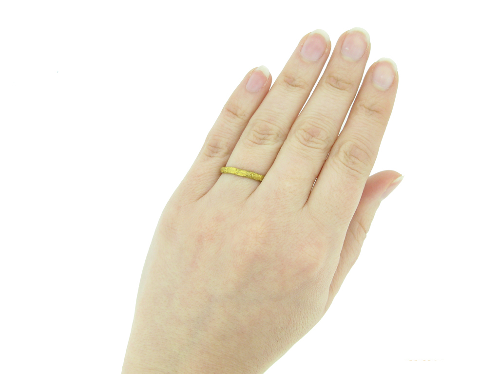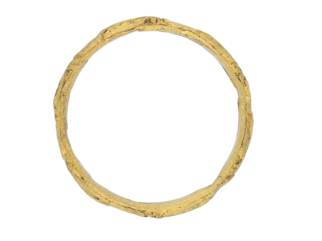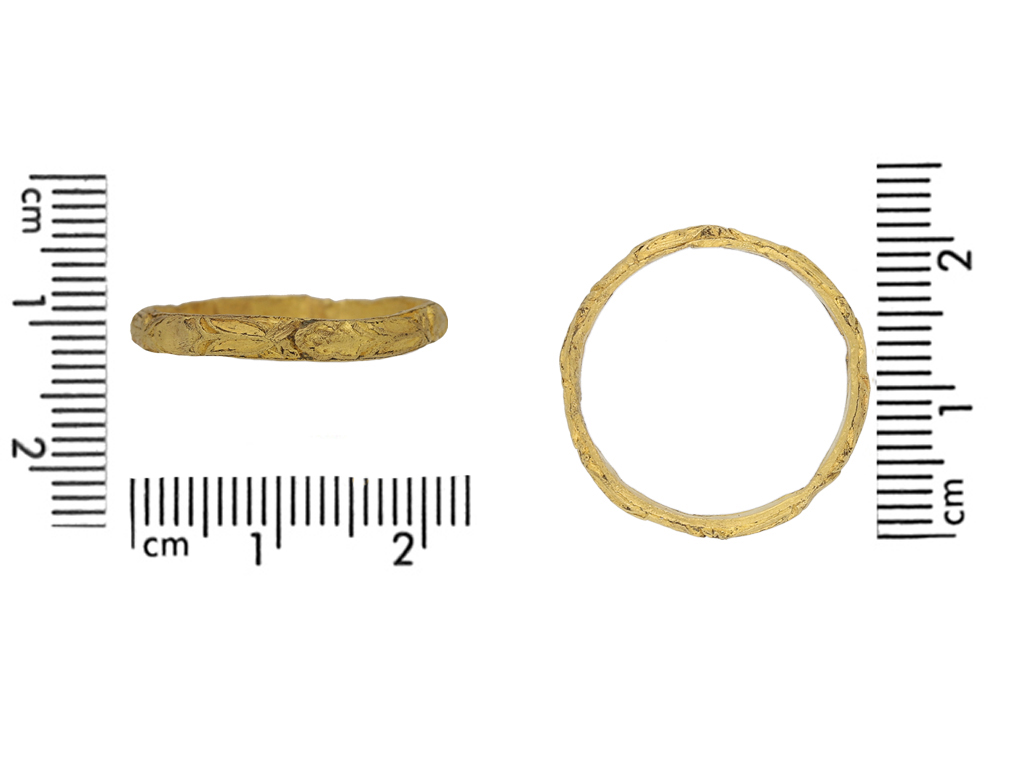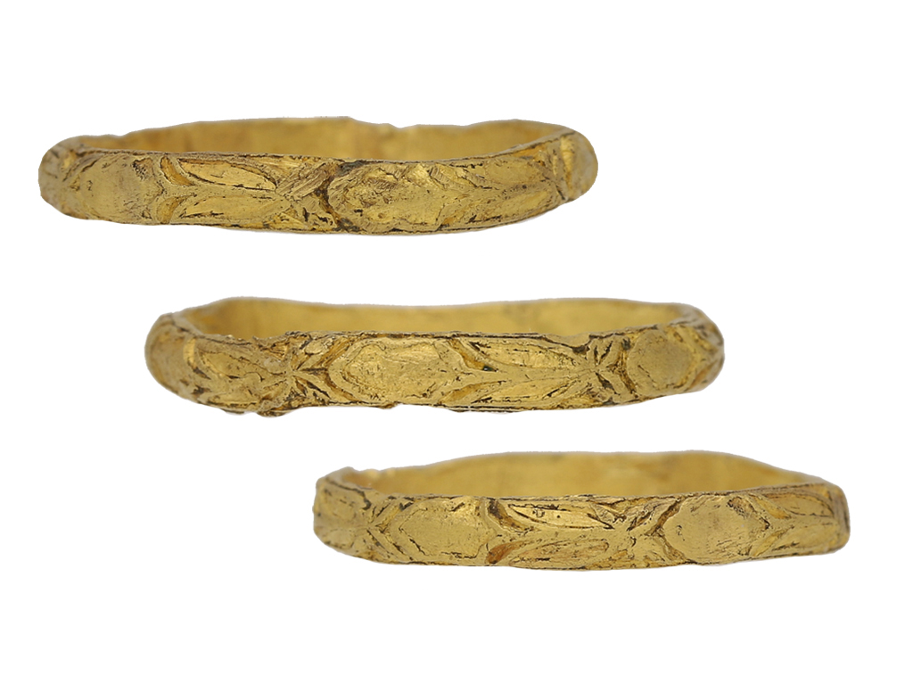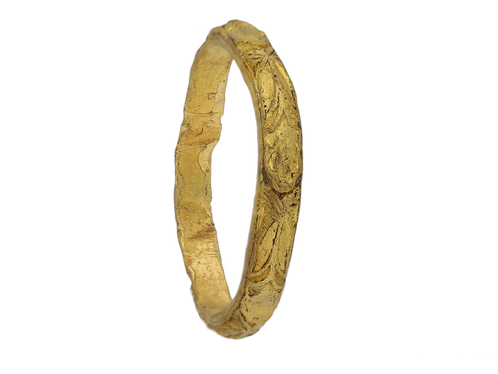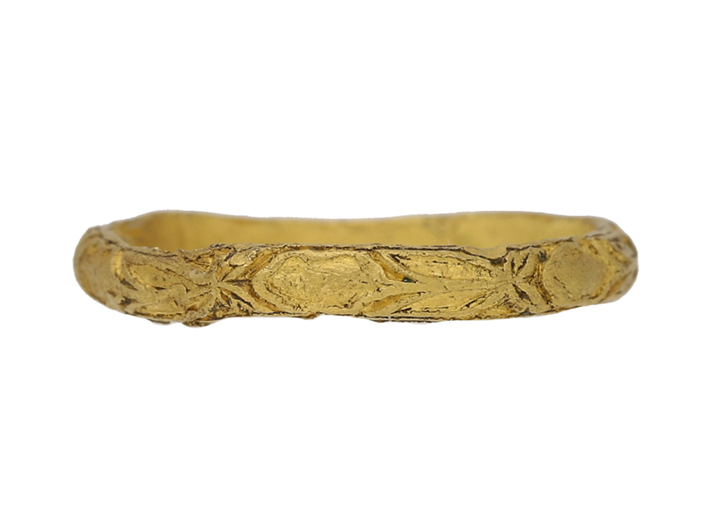 Ornately carved gold ring. A smoothly conforming D-shape yellow gold band, elaborately carved around the full circumference with stylised foliate motifs, approximately 2.5mm in width. Tested yellow gold, approximately 2.59 grams in weight, circa 16th century.