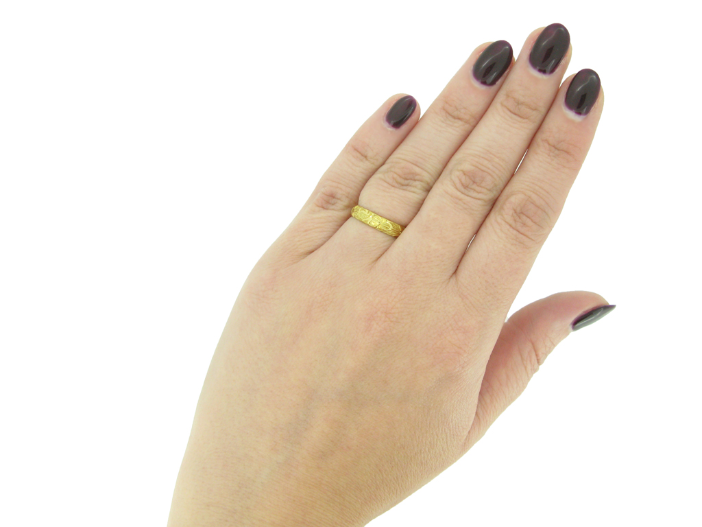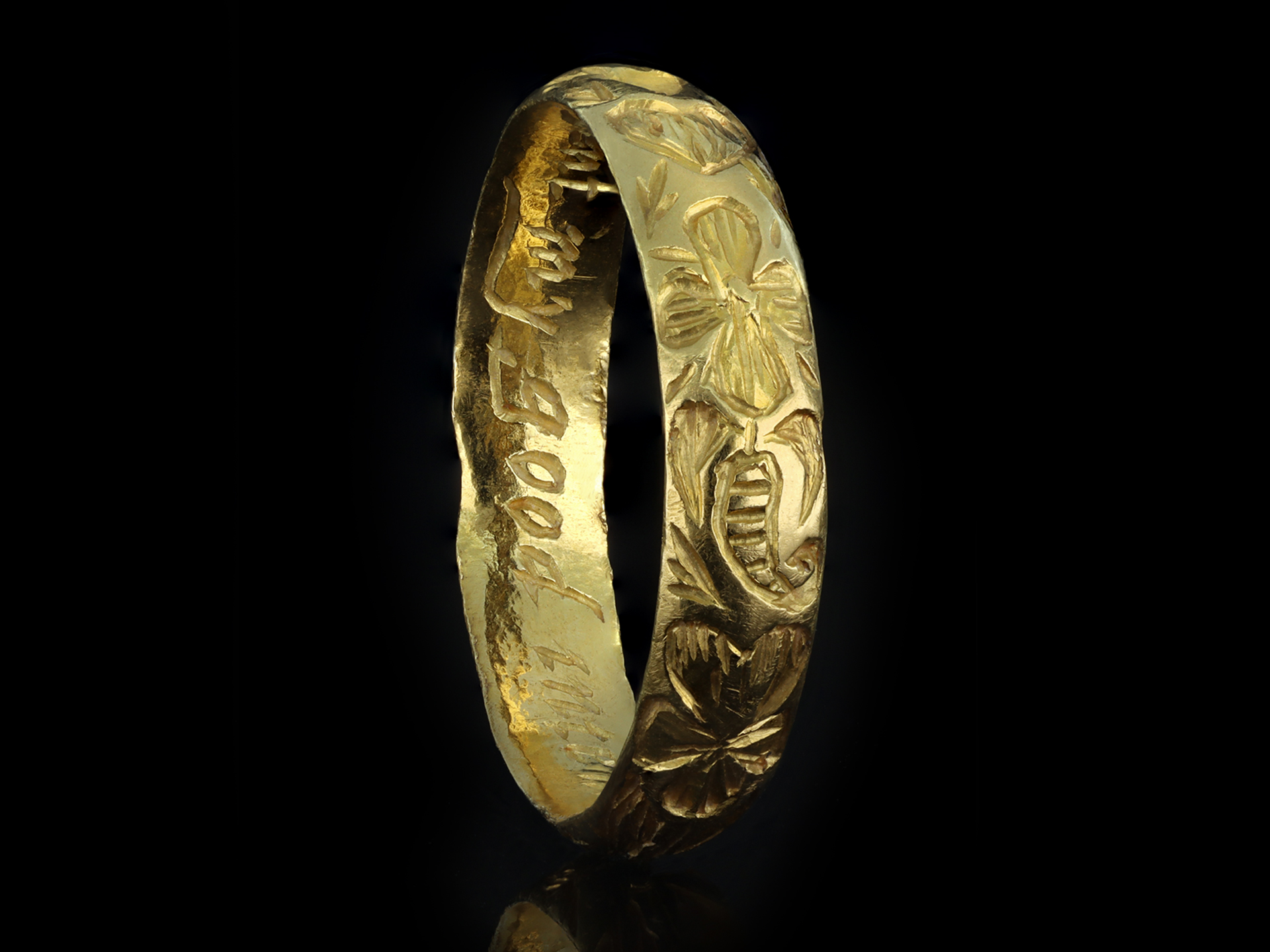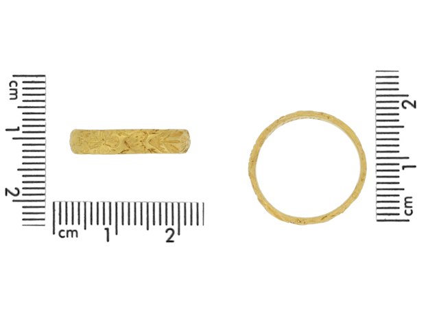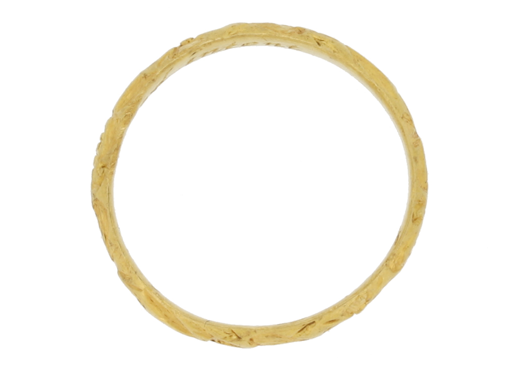 Post Medieval engraved posy ring 'Let this present my good intent'. A rare ring, the exterior of the D-shape band intricately engraved with hearts pierced with arrows and flower motifs, the interior inscribed in italic script 'Let this present my good intent', approximately 3.6mm in width. Tested yellow gold, approximately 2.3 grams in weight, circa 17th century.