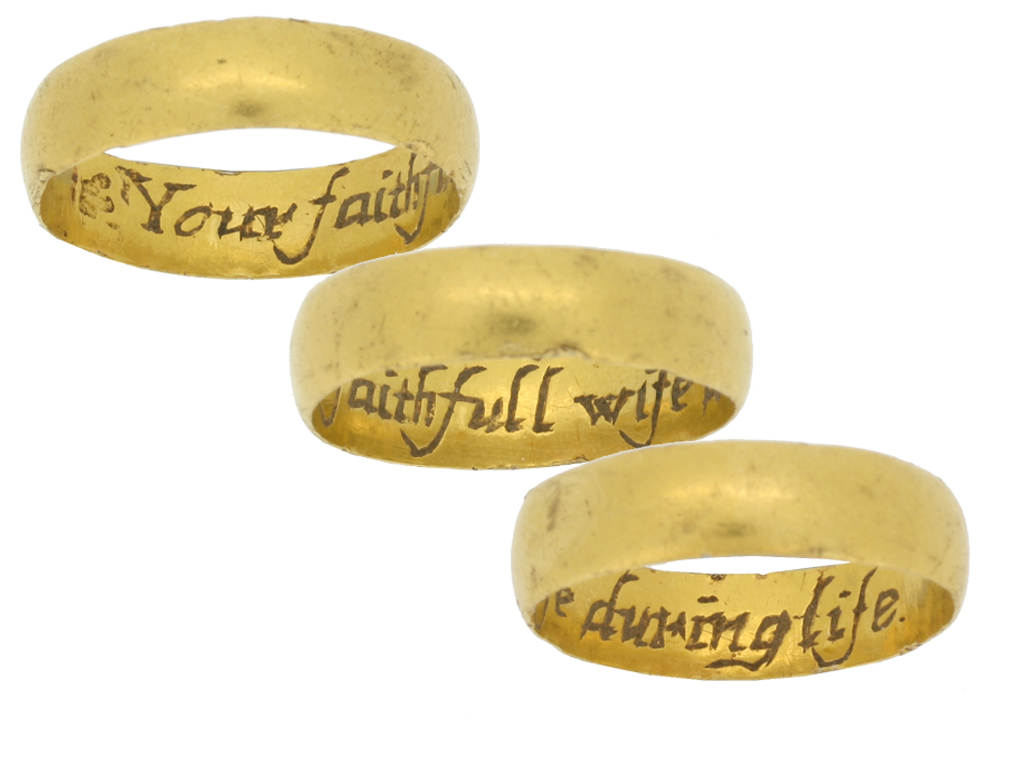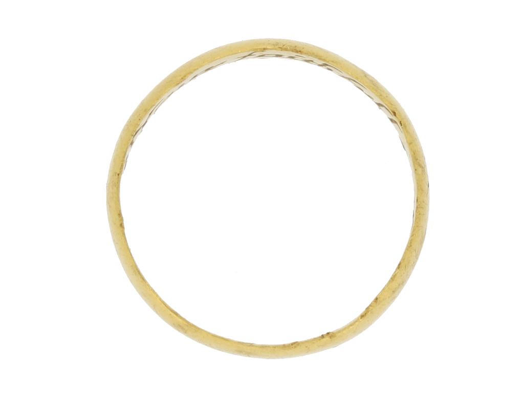Post Medieval posy ring 'Your faithfull wife during life'. The plain D-shape band inscribed to the interior in italic script 'Your faithfull wife during life', approximately 4.5mm in width. Tested yellow gold, approximately 4.4 grams in weight, indistinct marker's mark, circa 18th century. There is only one known example of this posy- with different spelling of the word 'during', see Evans, J. 'English Posies and Posy Ring', p. 111. At this point in history, there was no standardisation of spelling- the introduction of Dr Johnson's Dictionary, published on 15th April 1755, brought about radical change and started the process of regularising spelling. Formerly part of the Eldridge collection.