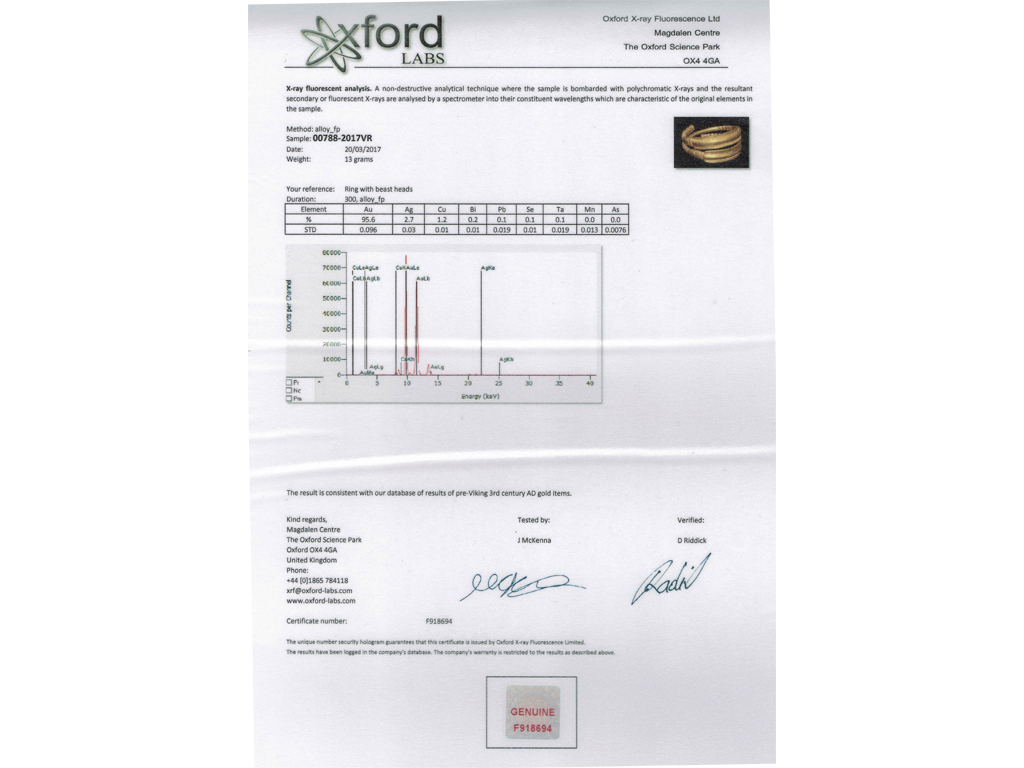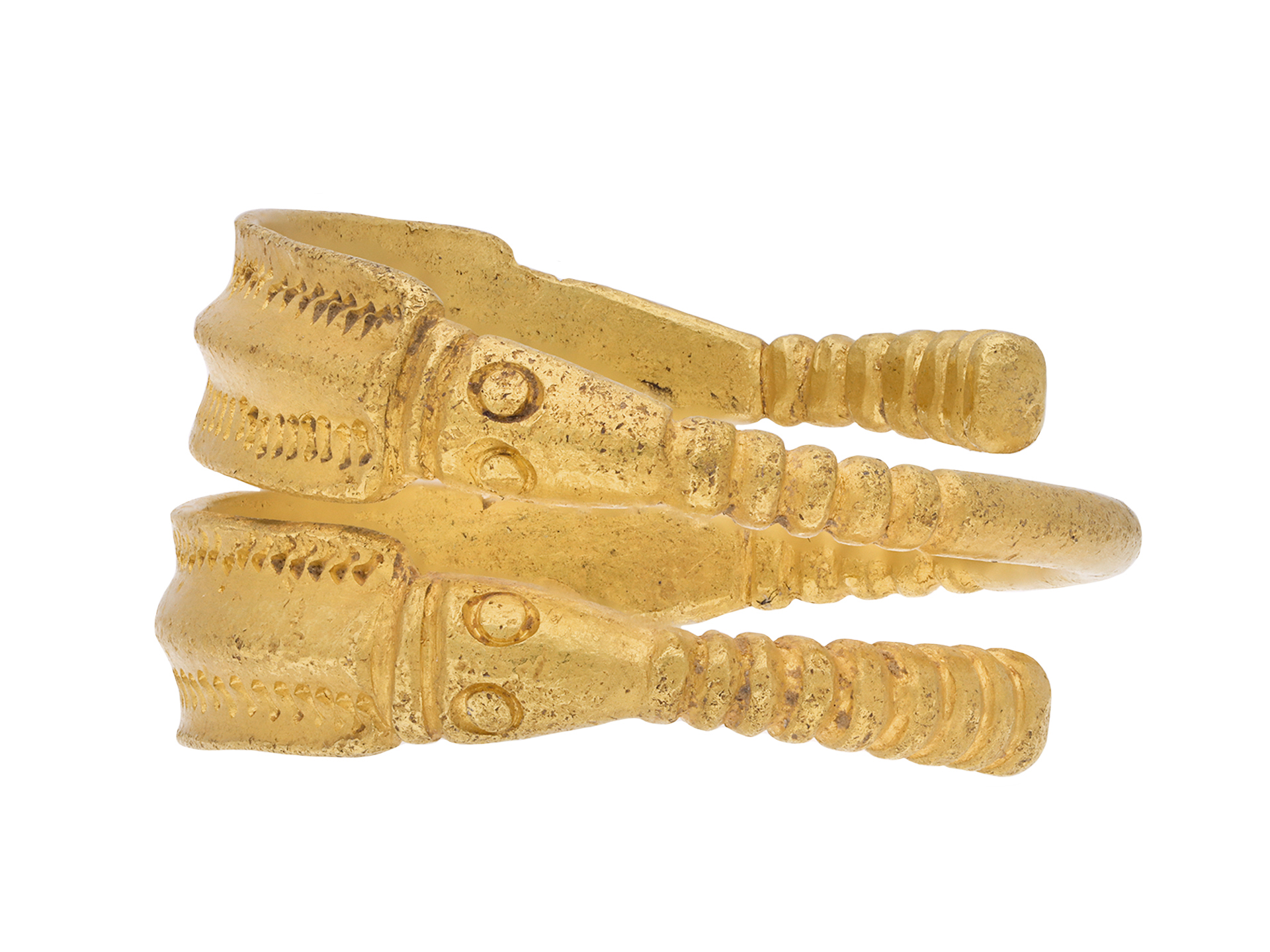Proto-Viking gold zoomorphic ring. A yellow gold sinuous penannular ring, composed of two ridged plaques (or bodies) with incised decoration, each flanked to both sides by a pair of eyes and terminating in a ribbed shank, all smoothly spiralling around the finger. Tested yellow gold, approximately 13.46 grams in weight, circa 3rd century AD, accompanied by an Oxford Labs X-ray fluorescence report stating the composition of the metal. This rare ring is a particularly fine example of proto-Viking craftsmanship.