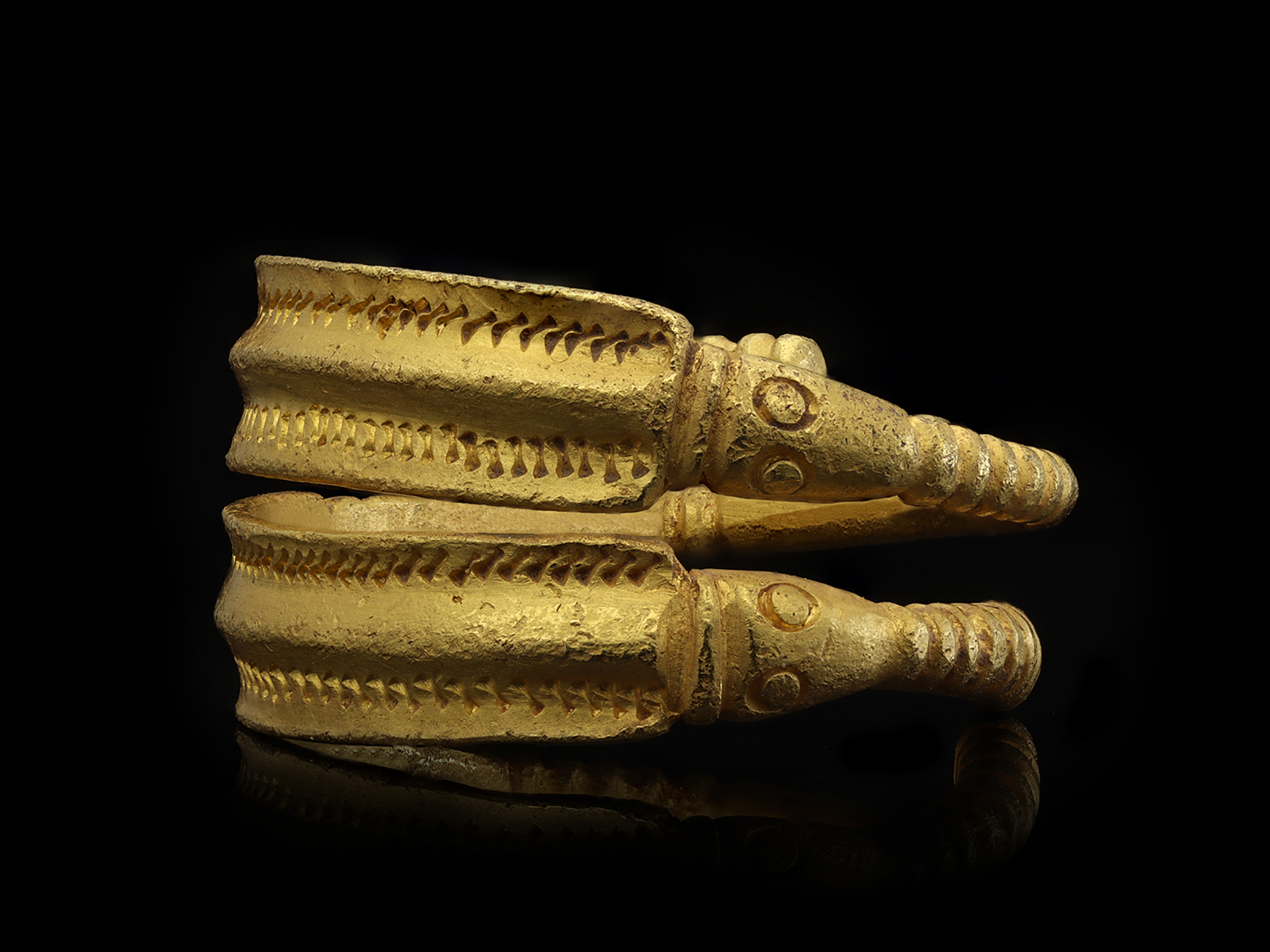 Proto-Viking gold zoomorphic ring. A yellow gold sinuous penannular ring, composed of two ridged plaques (or bodies) with incised decoration, each flanked to both sides by a pair of eyes and terminating in a ribbed shank, all smoothly spiralling around the finger. Tested yellow gold, approximately 13.46 grams in weight, circa 3rd century AD, accompanied by an Oxford Labs X-ray fluorescence report stating the composition of the metal.