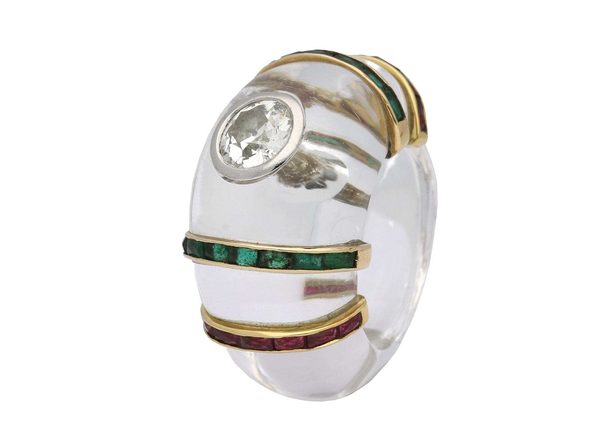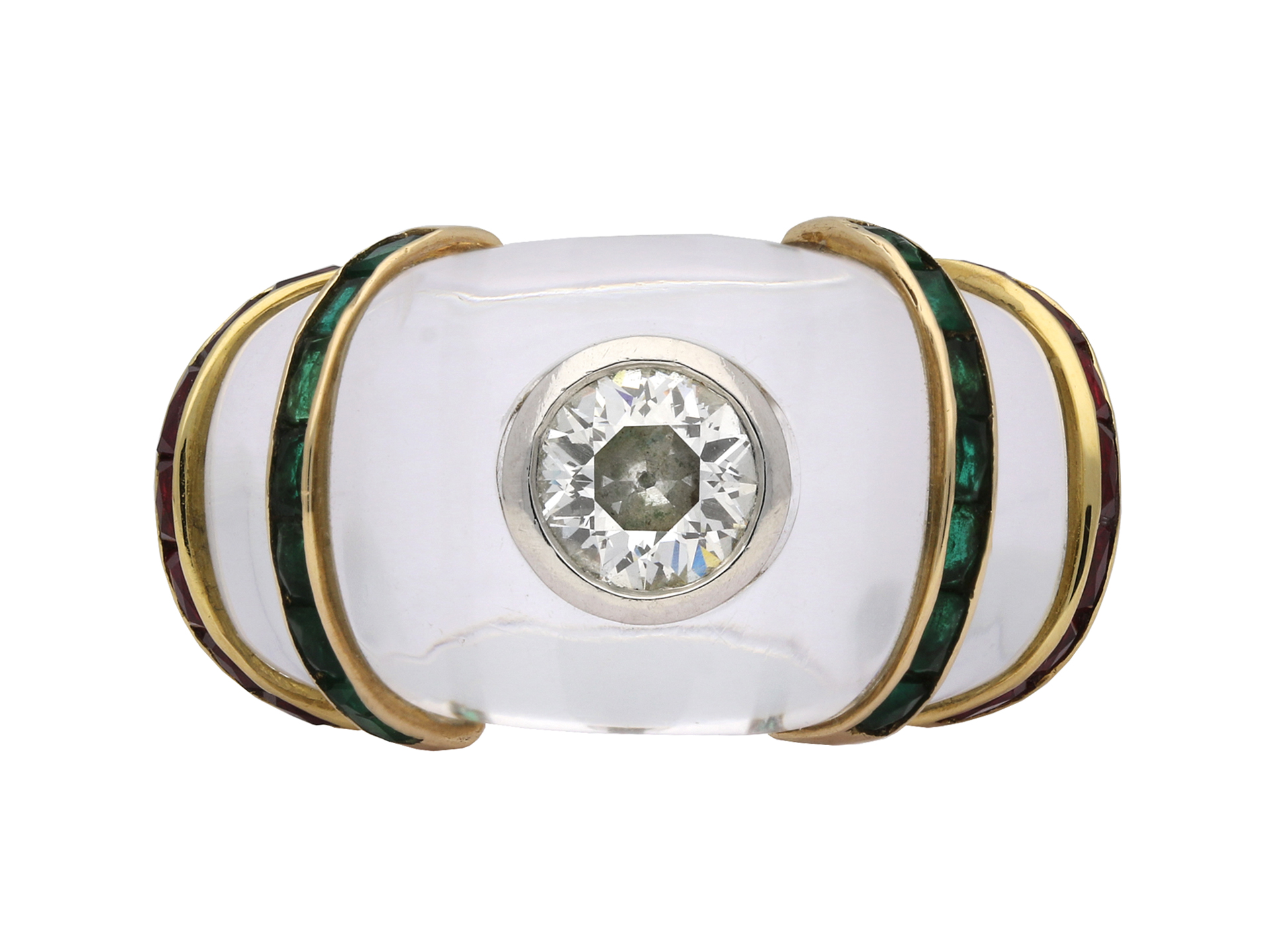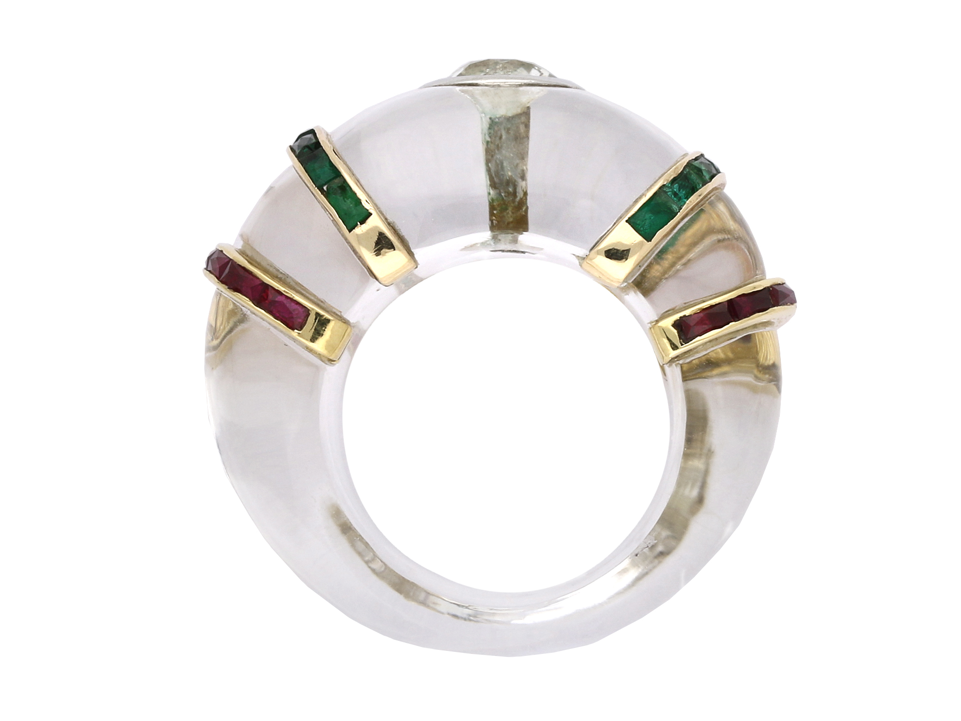 Rene Boivin vintage diamond, emerald and ruby ring in rock crystal, French, circa 1950.