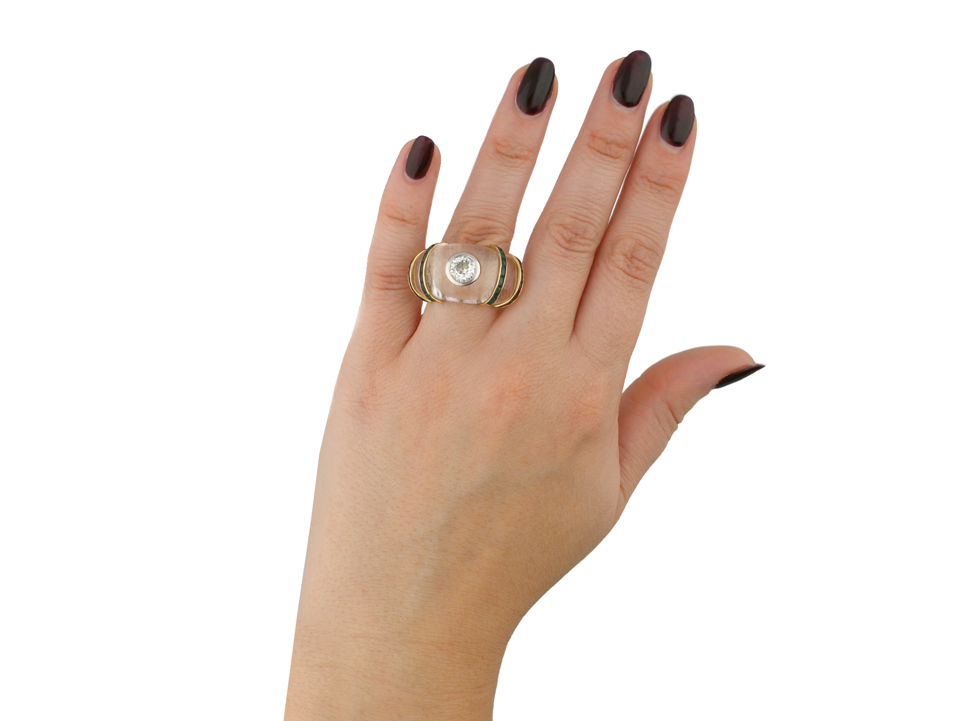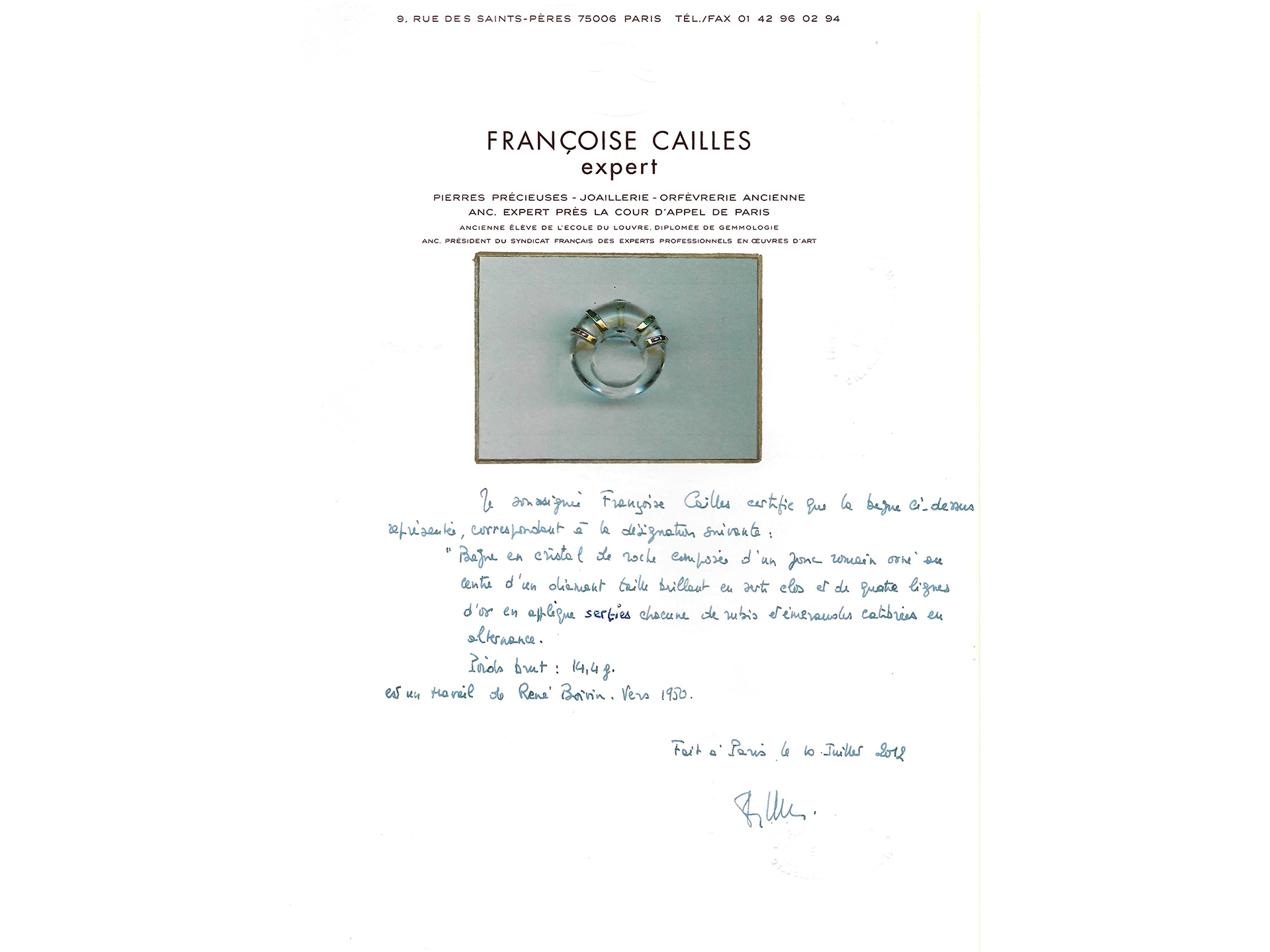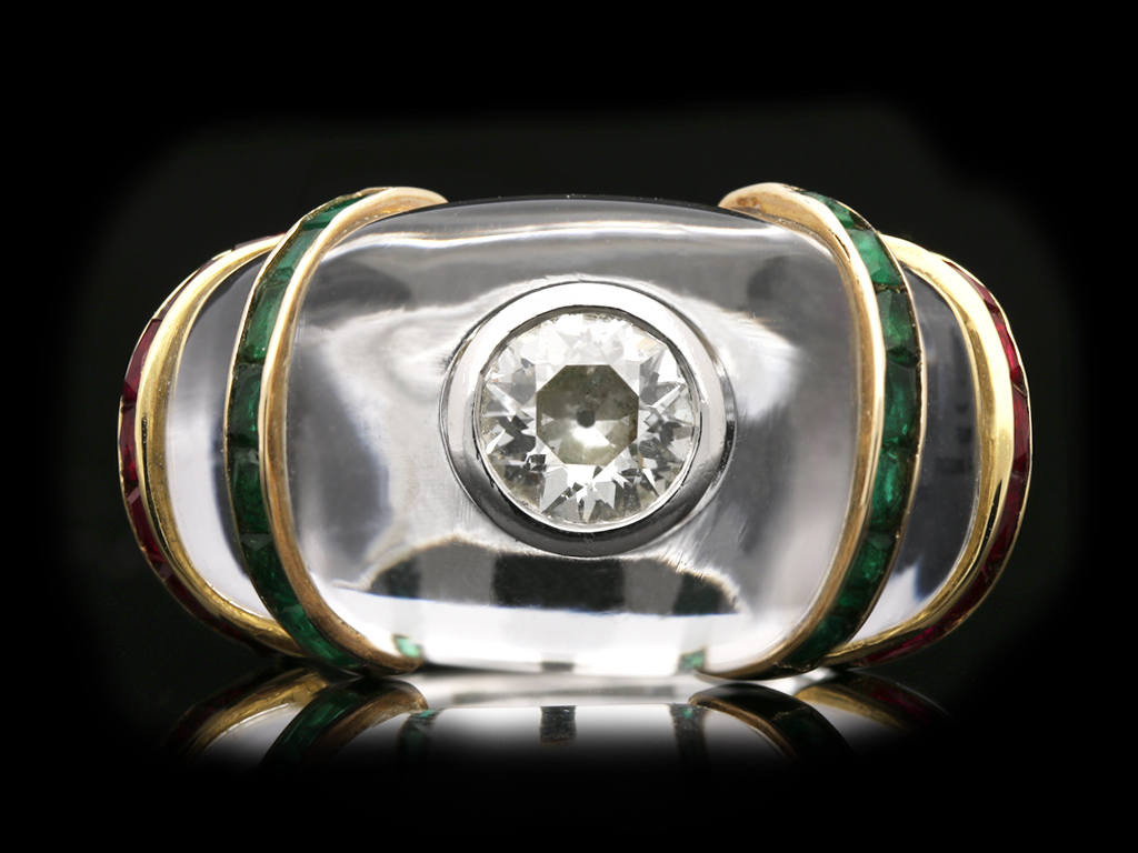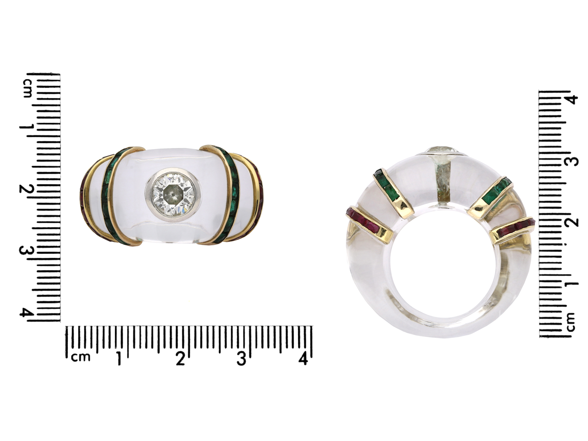 Rene Boivin vintage diamond, emerald and ruby ring in rock crystal, French, circa 1950.