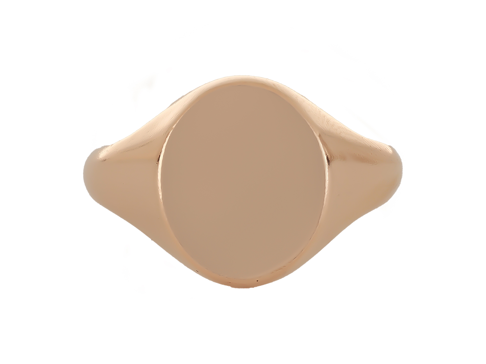 Rose gold signet ring. A signet ring featuring a plain oval face approximately 13mm x 11mm, leading to smooth shoulders which taper through to a solid D-shape shank. Tested rose gold, approximately 11.1 grams in weight.