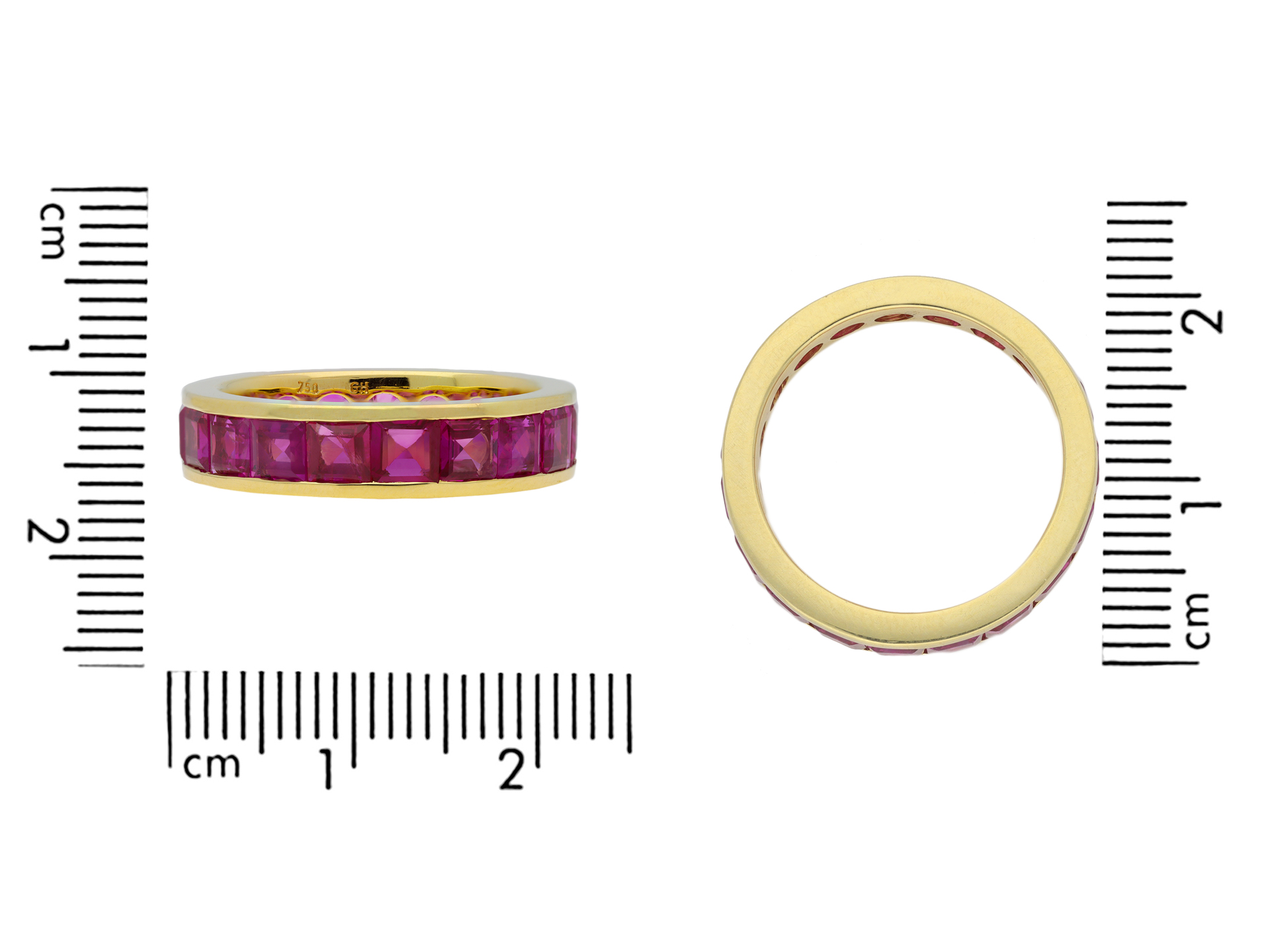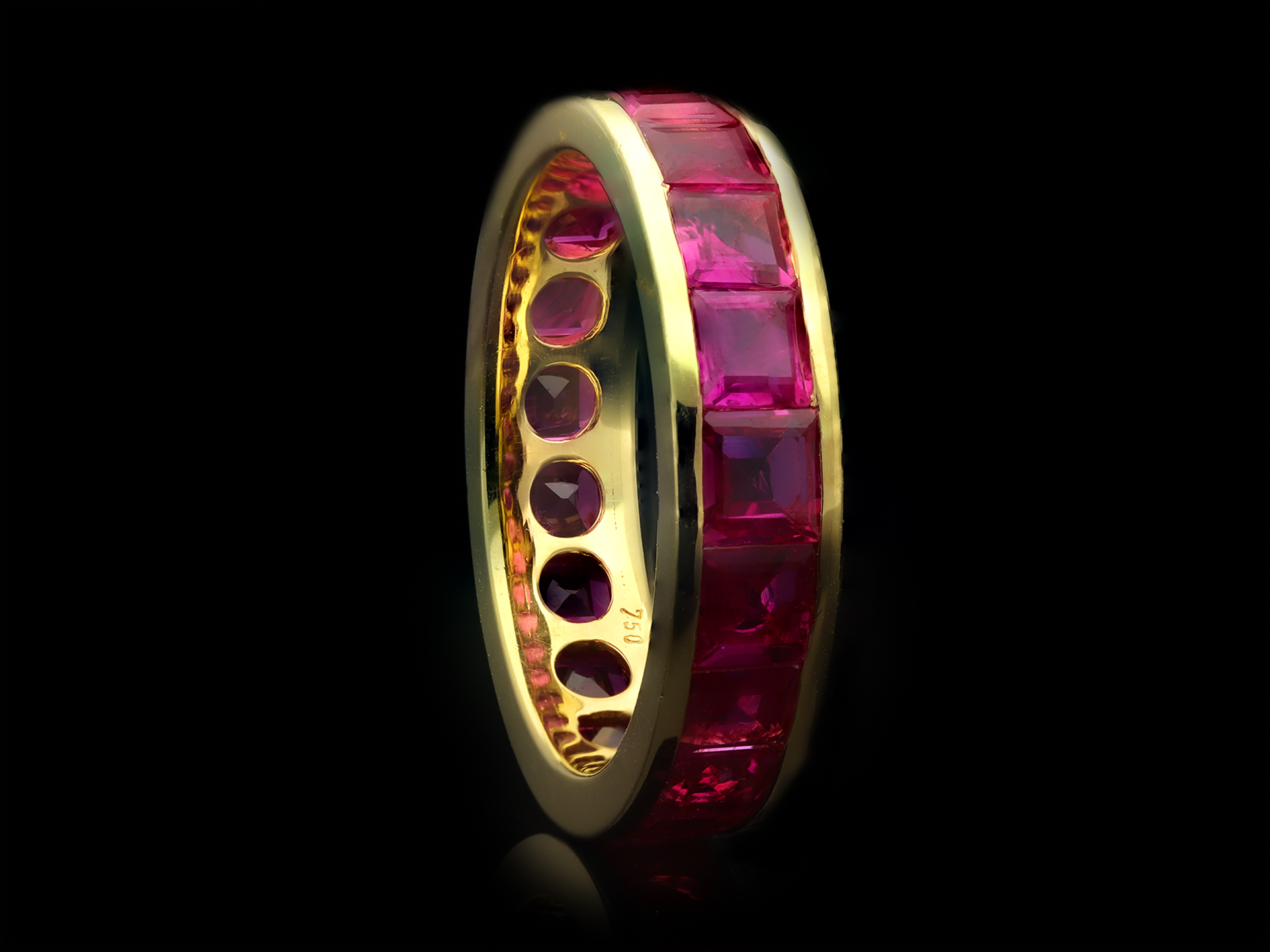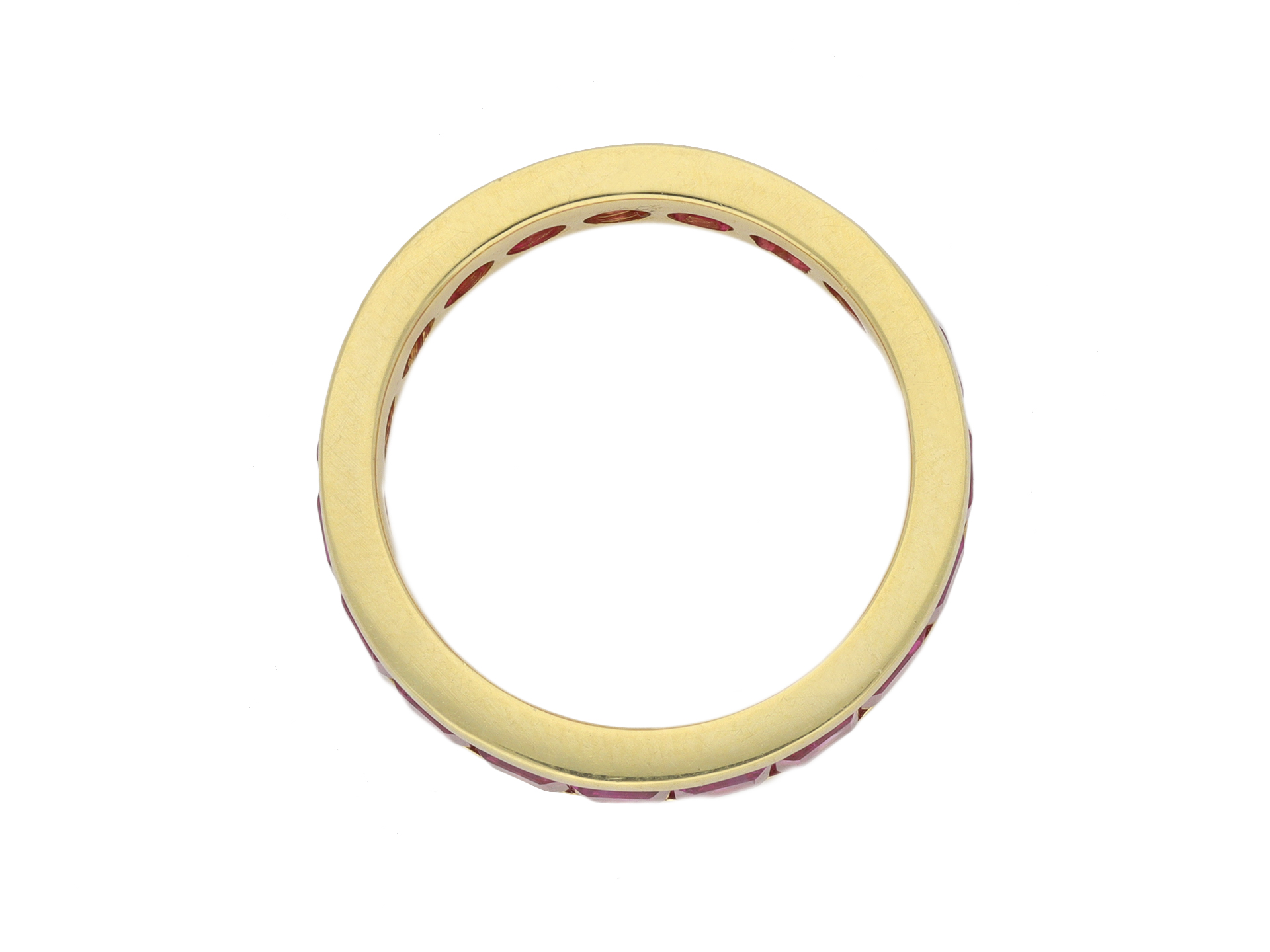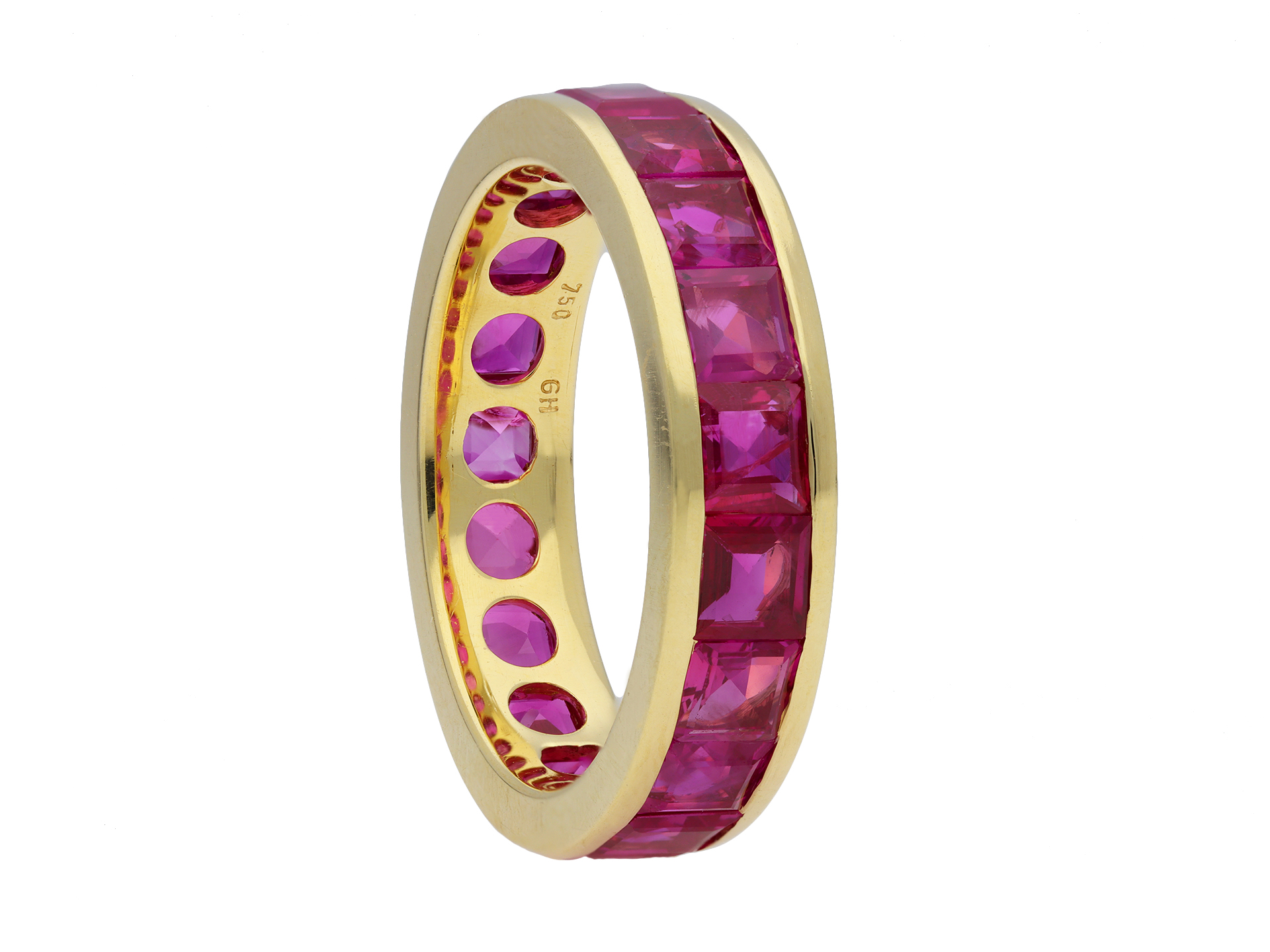 Ruby full eternity ring by Hemmerle. Set with nineteen square step-cut natural rubies in open back rubover settings with a combined approximate weight of 3.80 carats to a smoothly conforming full eternity band, featuring polished edging and circular open backholing, approximately 4.9mm in width. Marked 18 carat yellow gold, maker's mark 'GH' for Hemmerle, German, circa 1980.