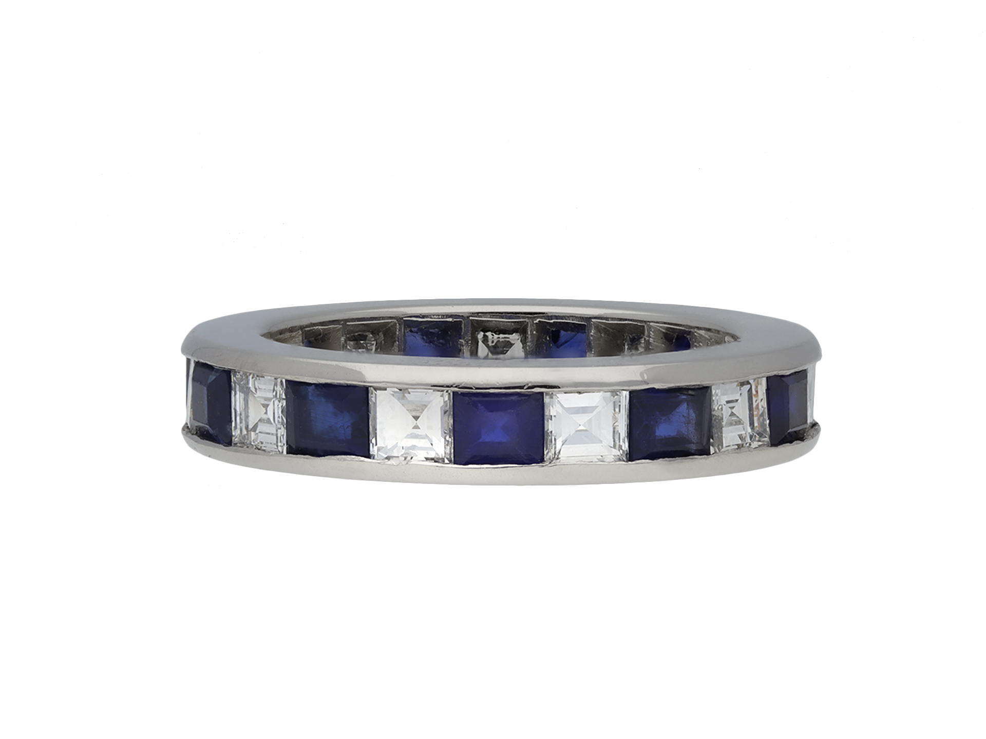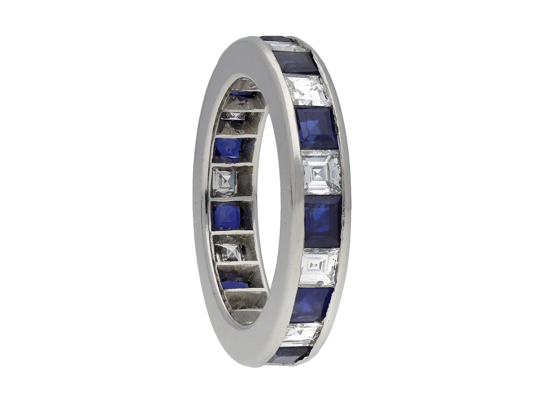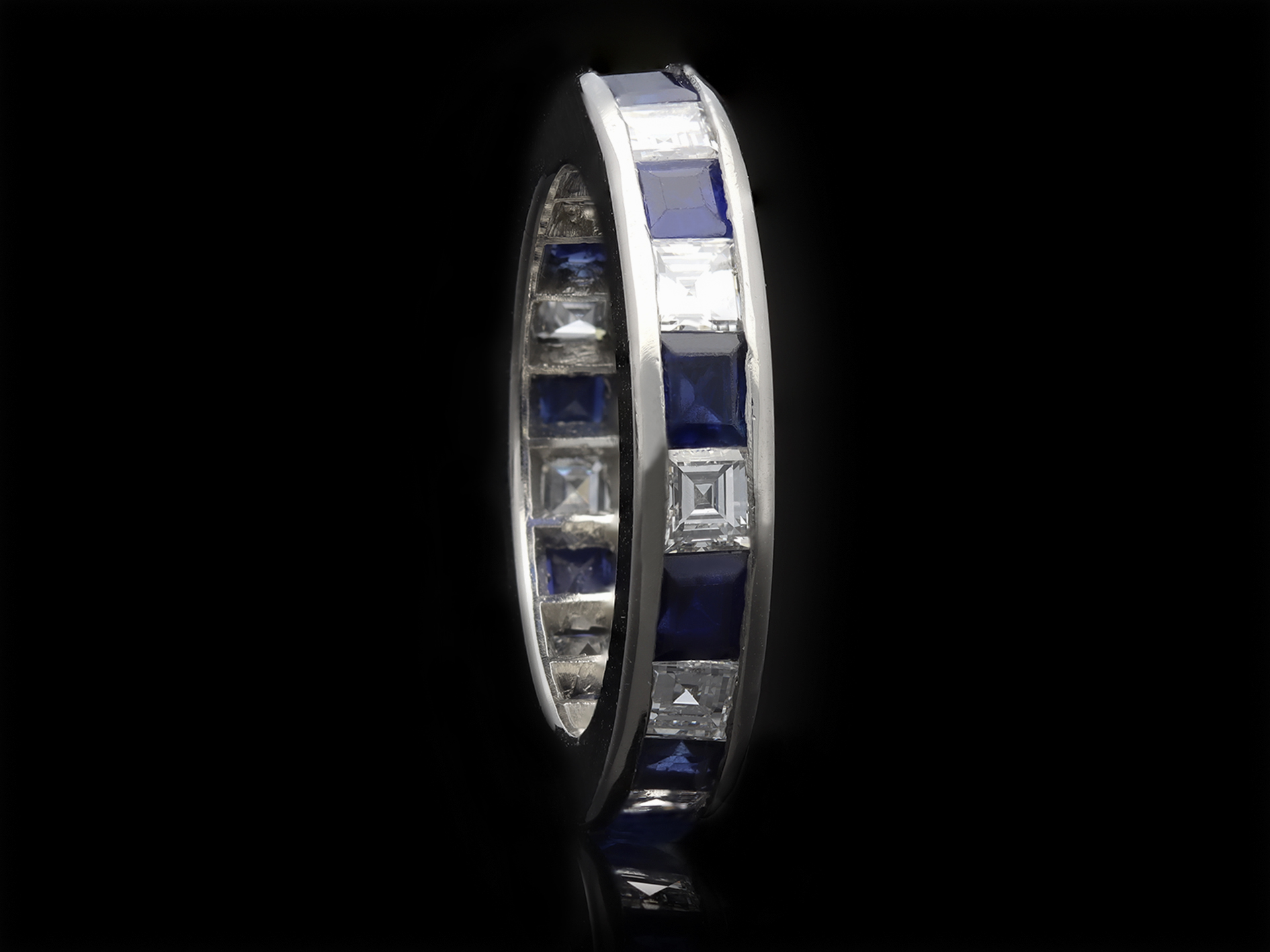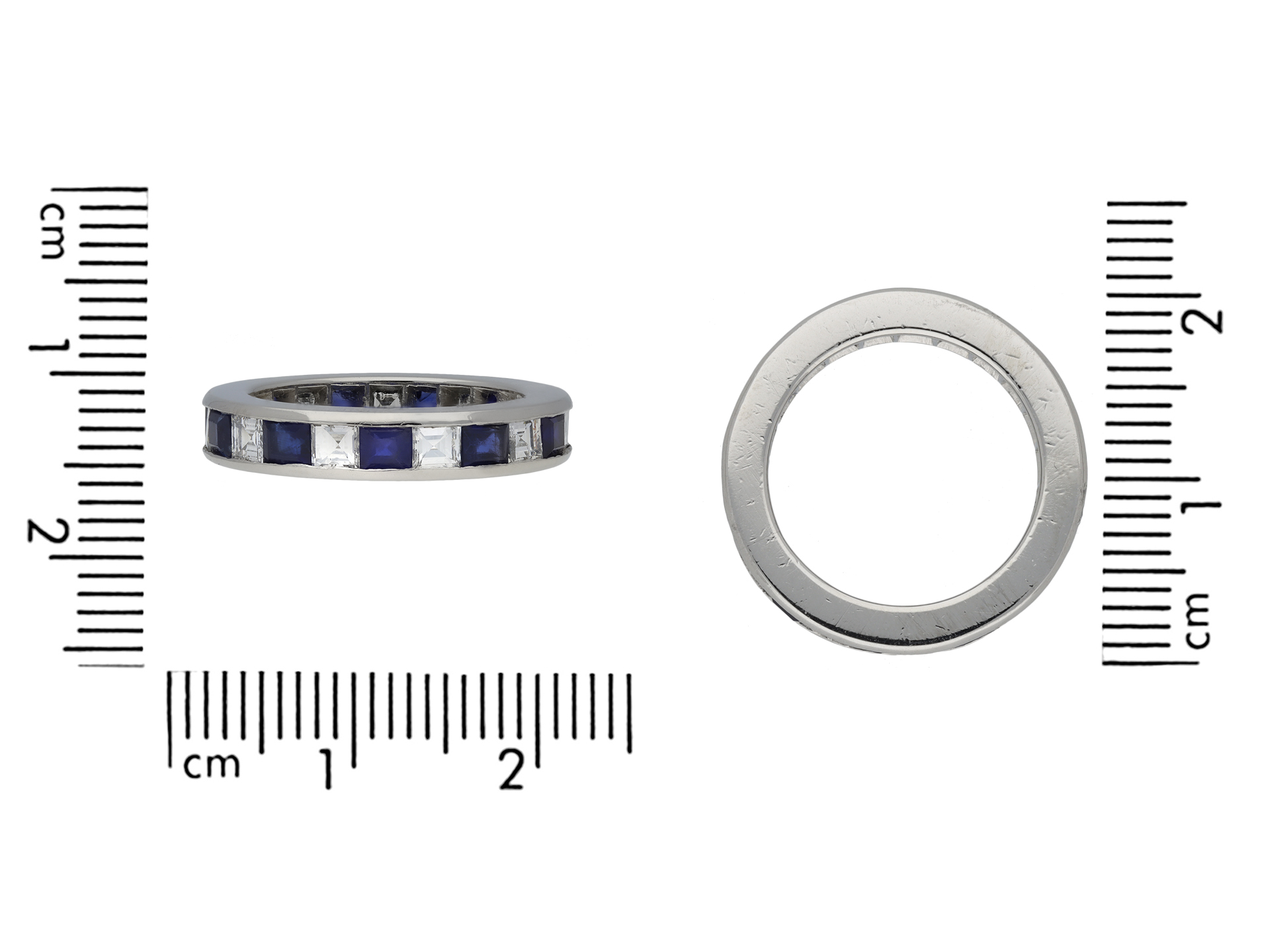 Sapphire and diamond eternity ring. Set with eleven square step cut natural unenhanced sapphires in open back rubover settings with a combined approximate weight of 1.30 carats, further set with eleven square step cut diamonds in open back rubover settings with an approximate combined weight of 1.10 carats, to a smoothly conforming full eternity band featuring an alternating design, polished borders and fancy open backholing, approximately 3.5 mm in width. Tested platinum, circa 1950.