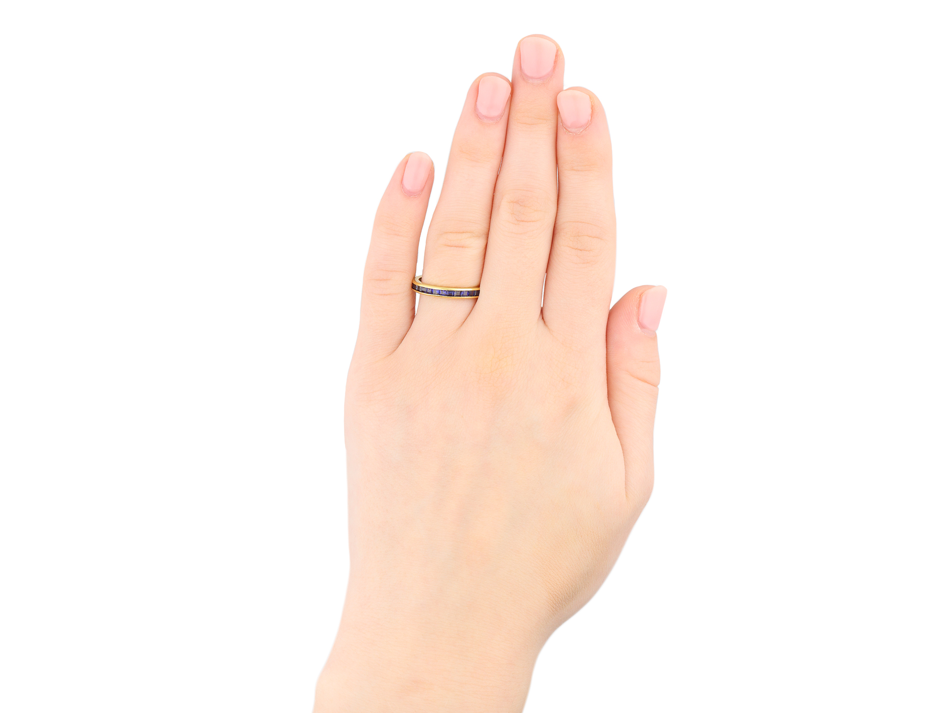 Sapphire full eternity ring. A smoothly conforming eternity ring set with thirty two square step-cut natural unenhanced sapphires in open back channel settings with a combined approximate weight of 1.60 carats, to a full eternity design featuring polished edges, a smooth gallery and geometric open backholing, approximately 2.8mm in width. Tested yellow gold, circa 1970.