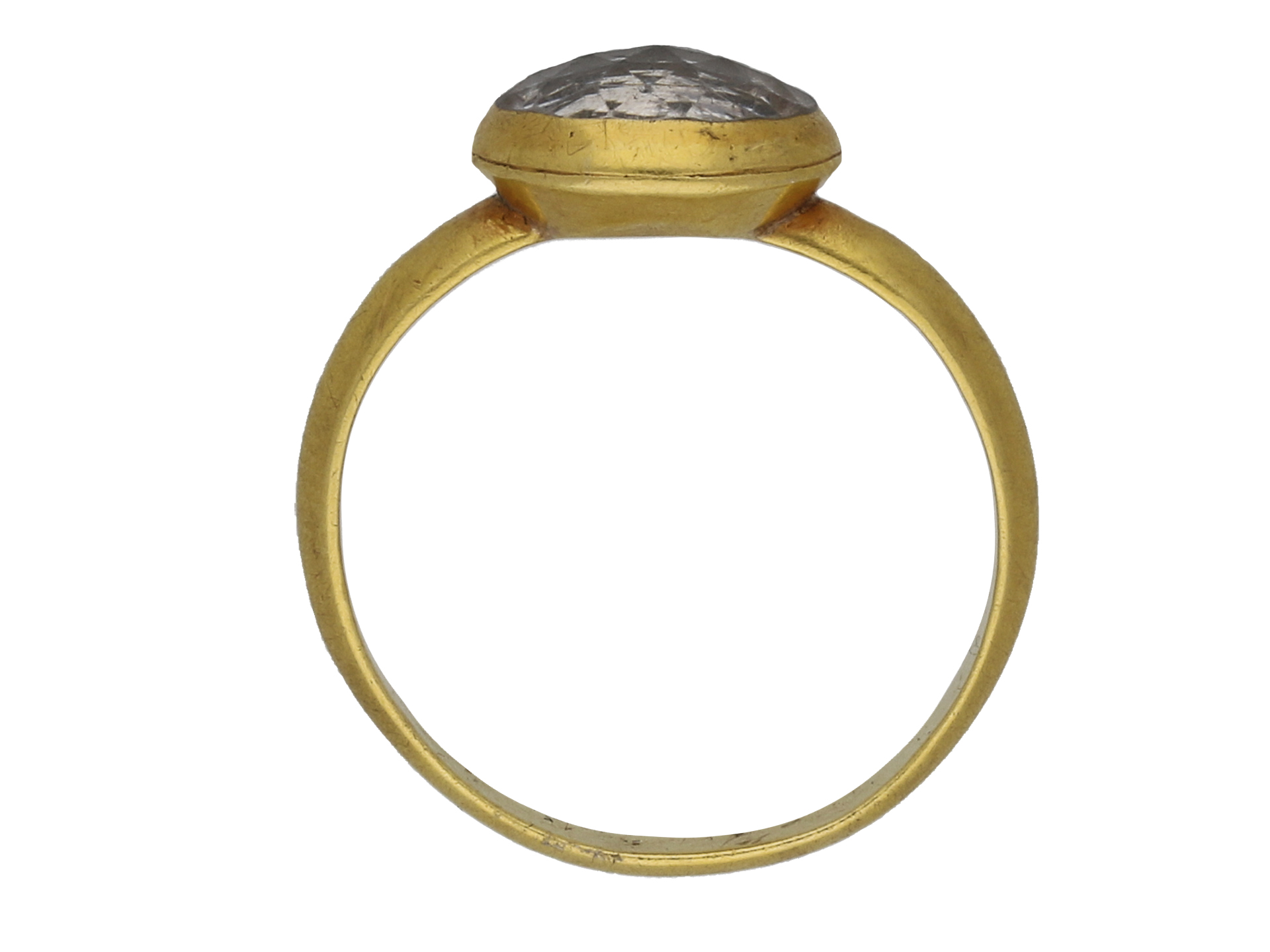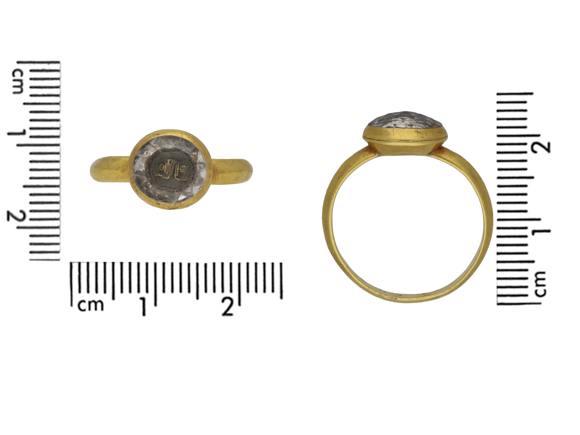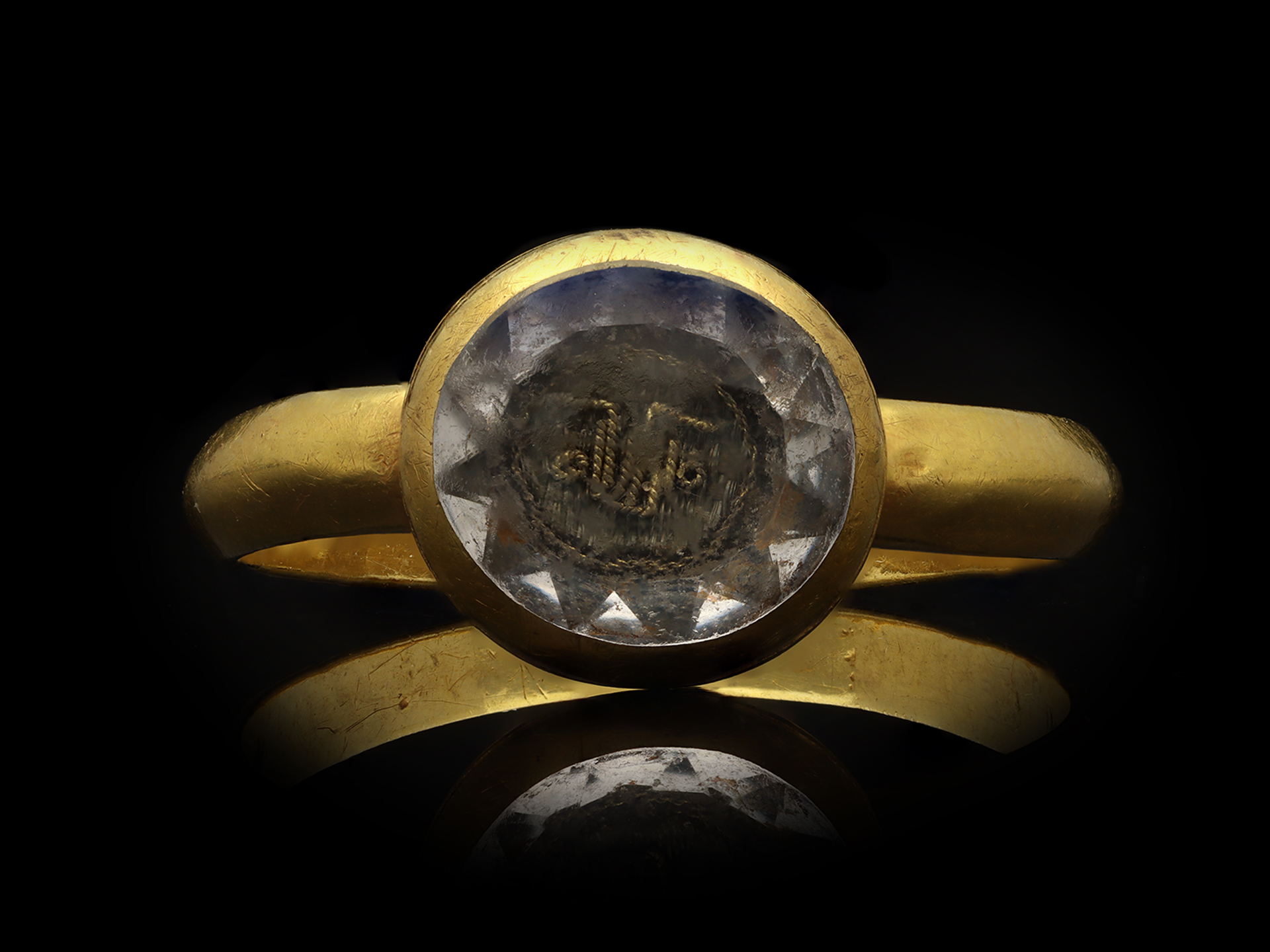 This category of Stuart crystals display imagery such as cupid holding a bow and arrows, knots, flowers and hearts. It is highly likely that this ring, showcasing a love knot was given as a promise or betrothal ring to a sweetheart around 400 years ago.