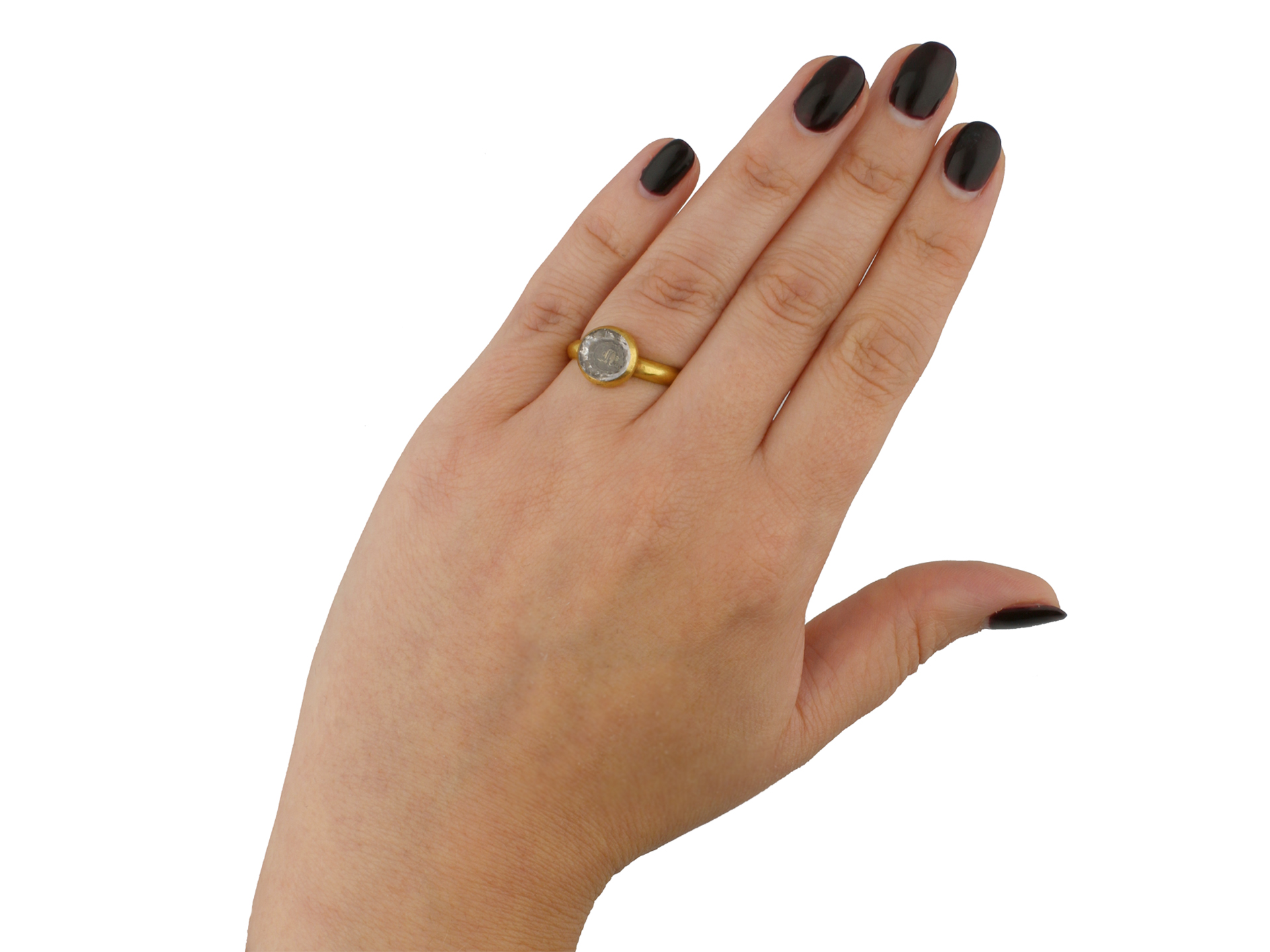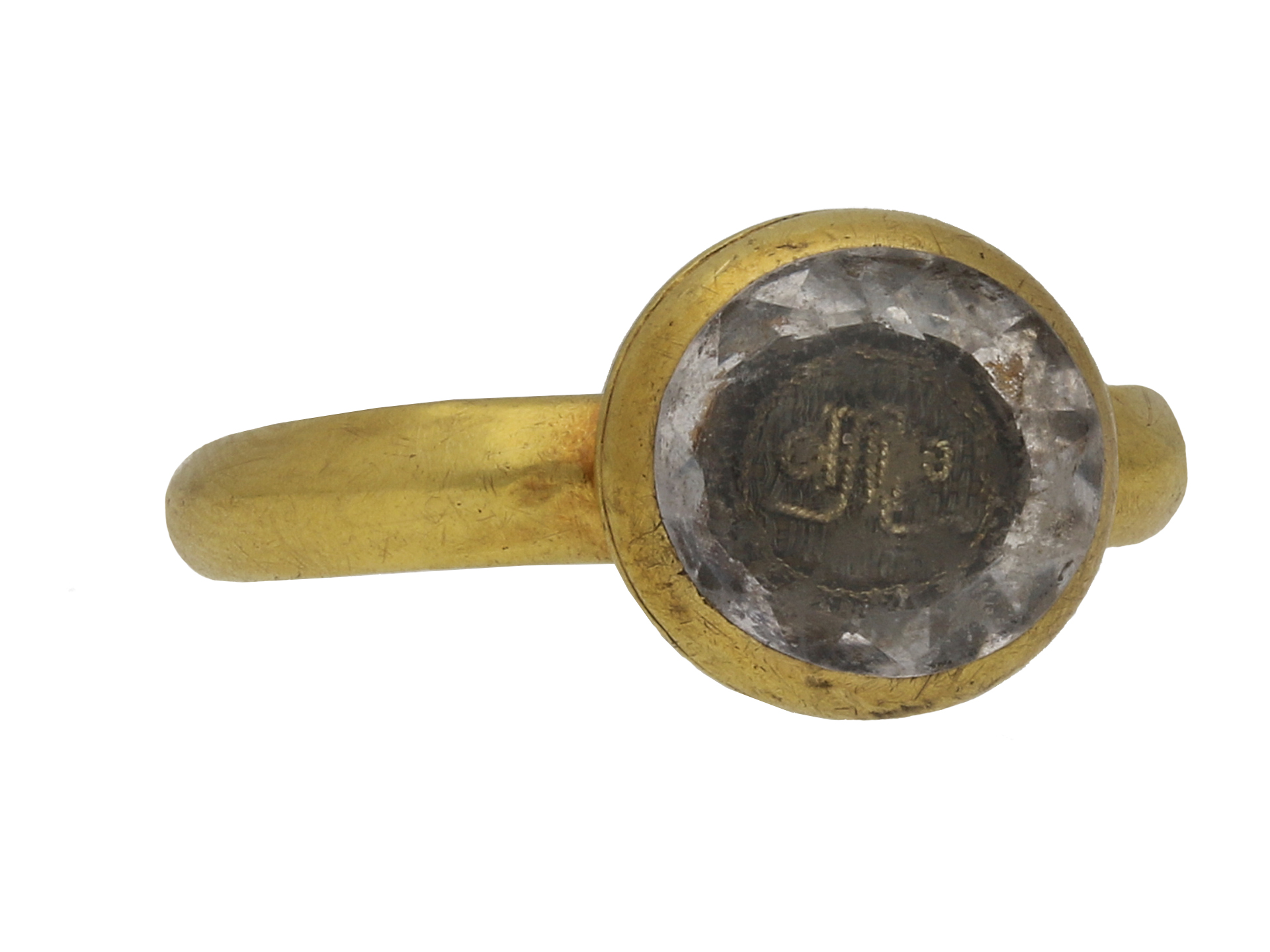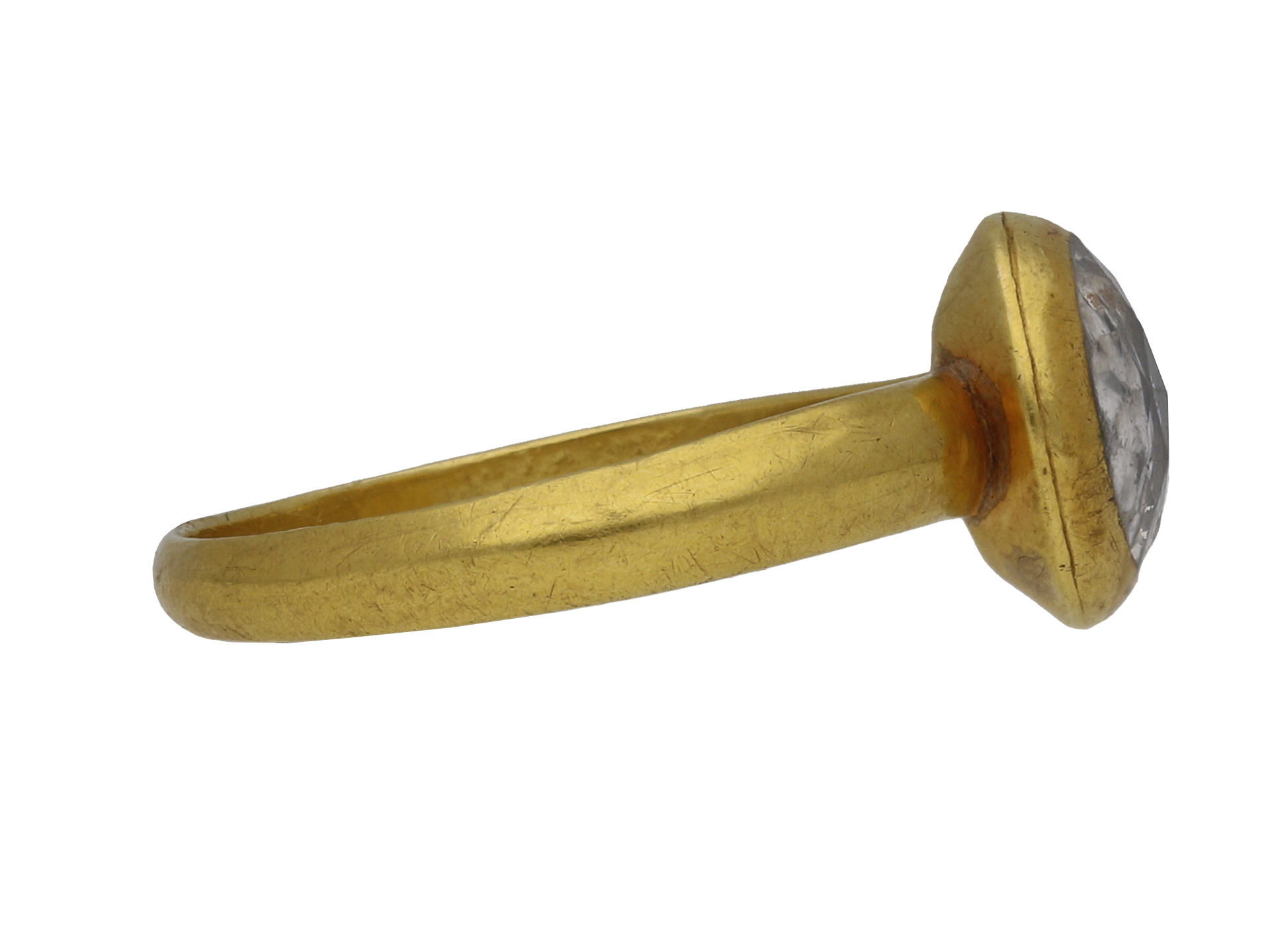 This category of Stuart crystals display imagery such as cupid holding a bow and arrows, knots, flowers and hearts. It is highly likely that this ring, showcasing a love knot was given as a promise or betrothal ring to a sweetheart around 400 years ago.