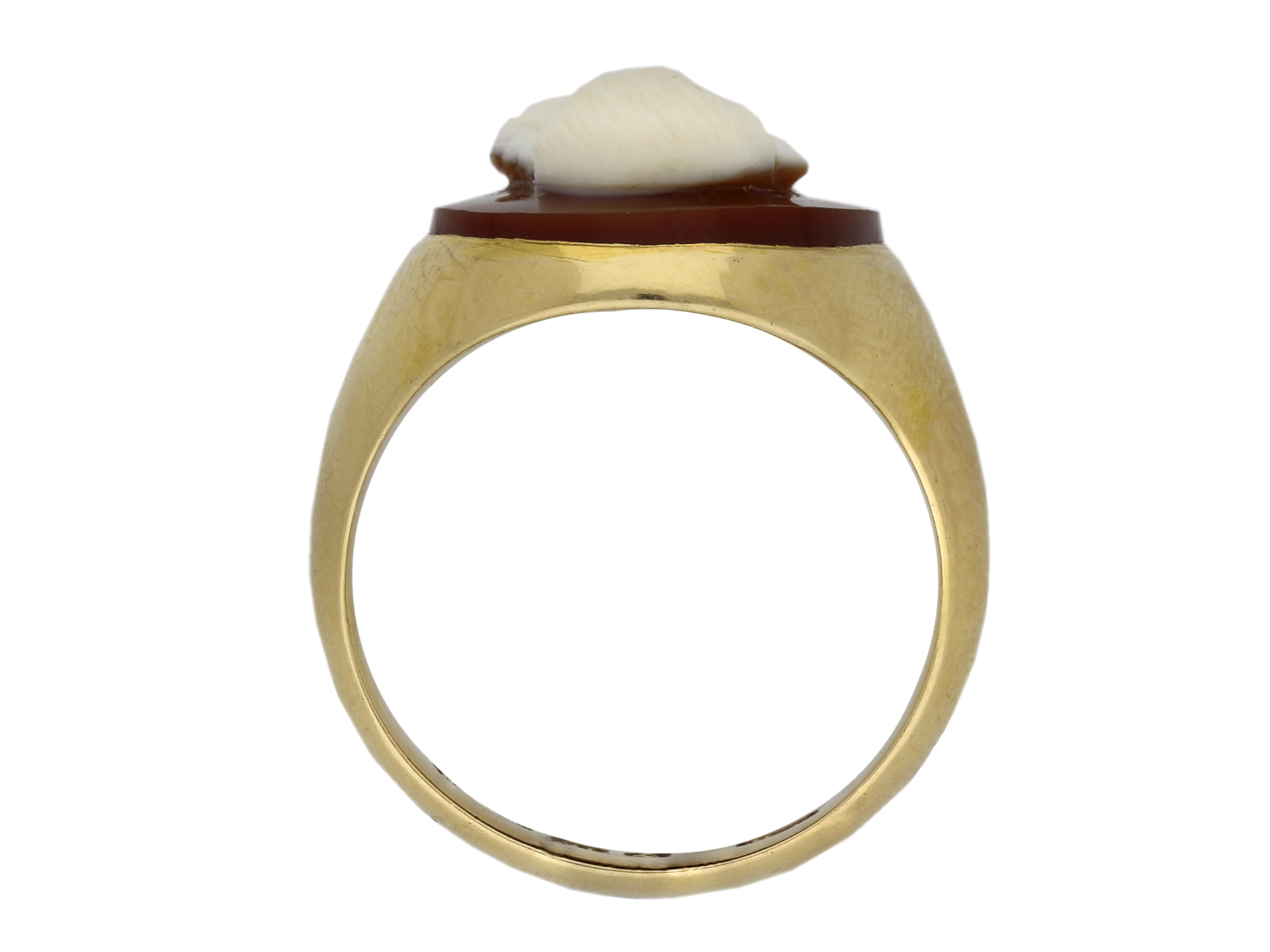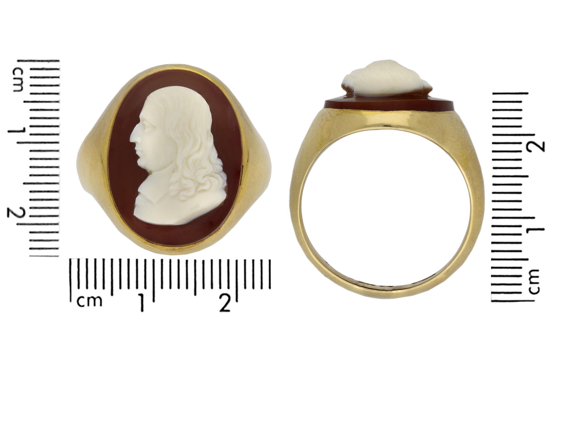 Stuart sardonyx cameo of John Milton mounted in a Victorian gold ring. Set with an oval sardonyx 17th century cameo in a rubover setting featuring a profile bust of John Milton (1608-74), the eminent seventeenth century English poet, leading to integrated shoulders and flowing through to a tapering solid shank. Tested yellow gold, English, circa 1901.