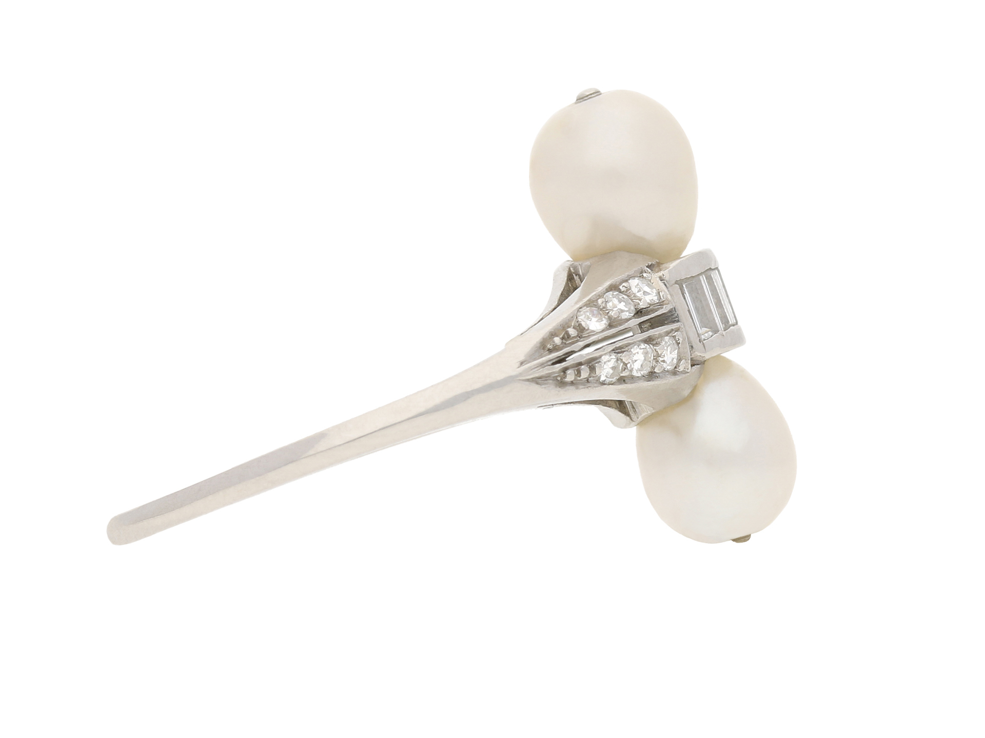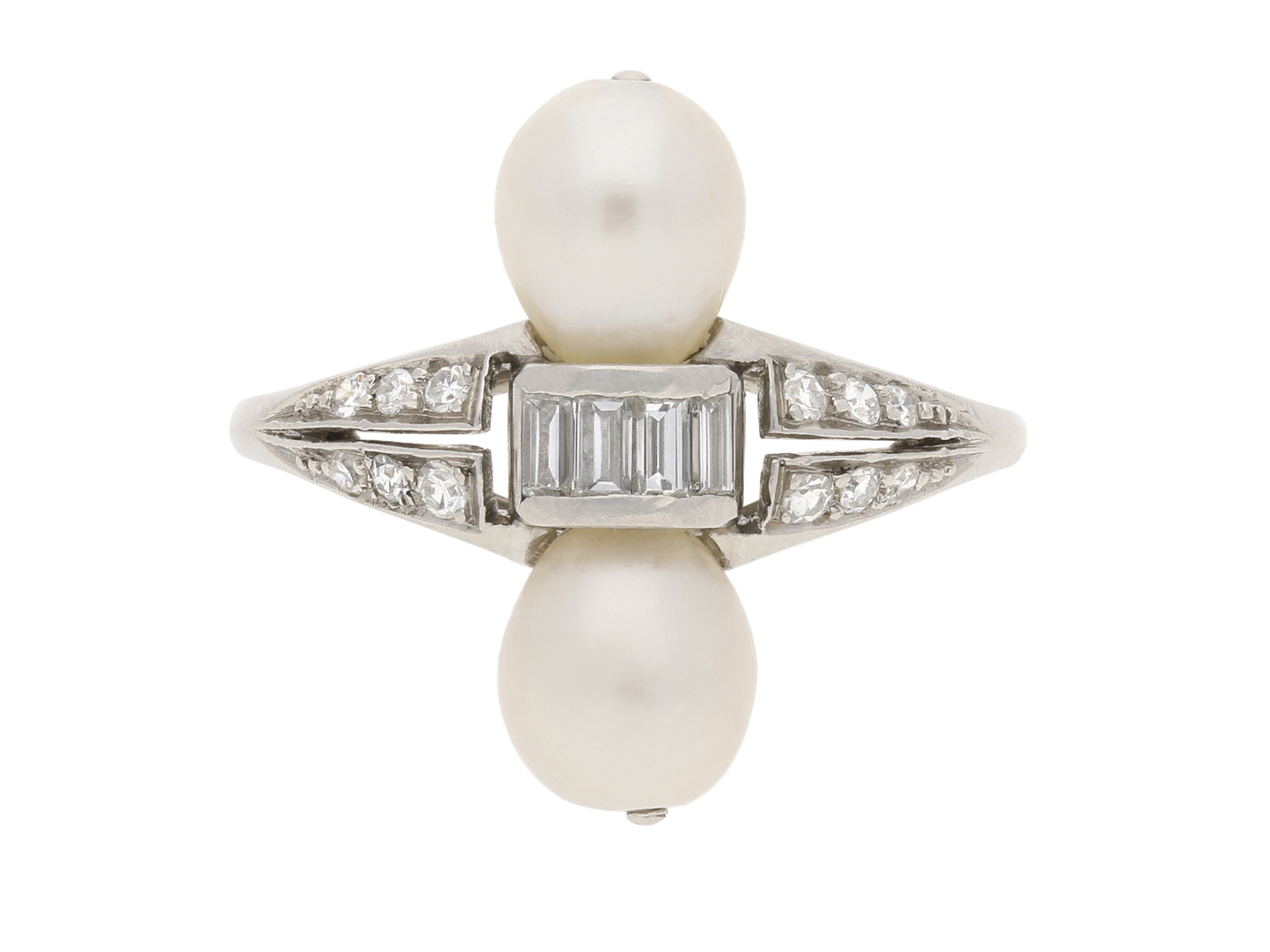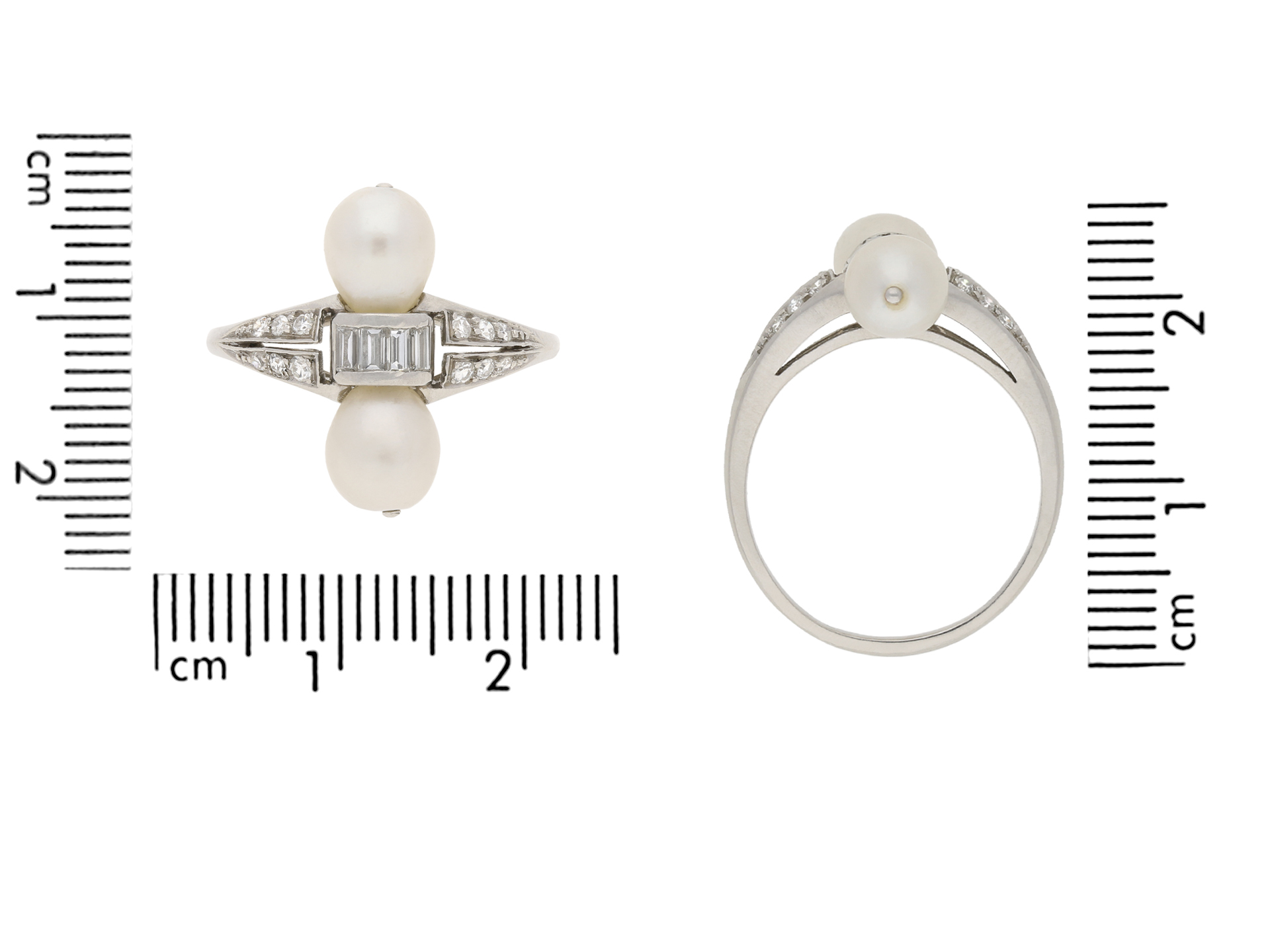 Two natural pearl and diamond ring. Set to centre with two drop shape natural pearls, separated with a row of four channel set baguette cut diamonds in open back rubover settings with a weight of 0.20 carats, flanked by twelve round old single cut diamonds in open back grain settings with a combined weight of 0.20 carats. The total approximate diamond weight is 0.40 carats, all set to a pierced conforming finger gallery with further delicate split openwork to the collet and pierced backholing, flowing down to a fine tapered shaped shank. Tested platinum, circa 1920, accompanied by GPL report #07062.