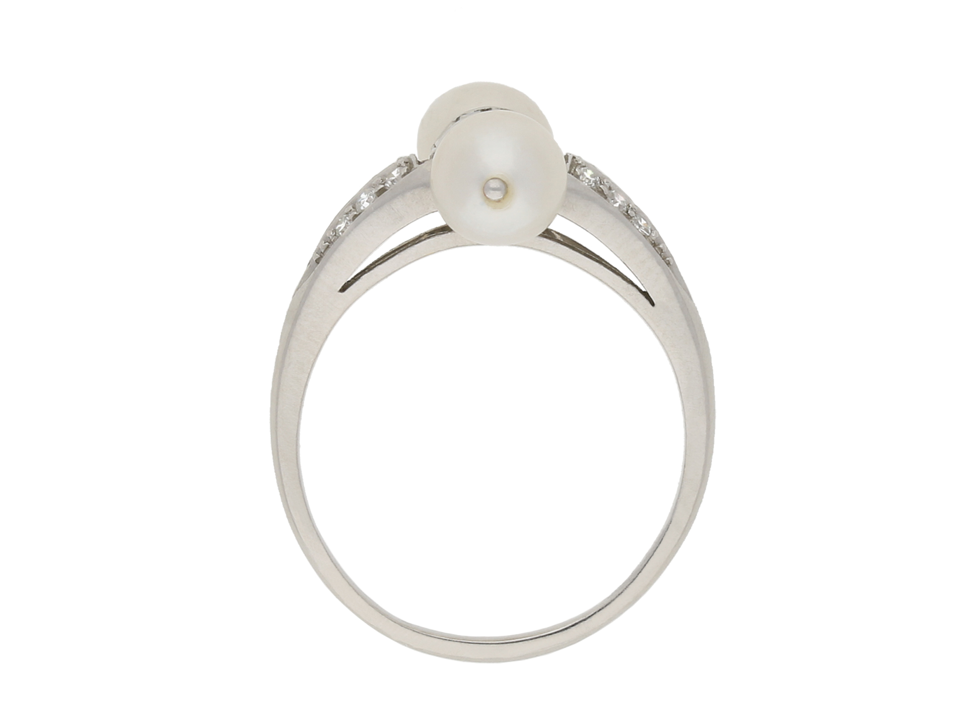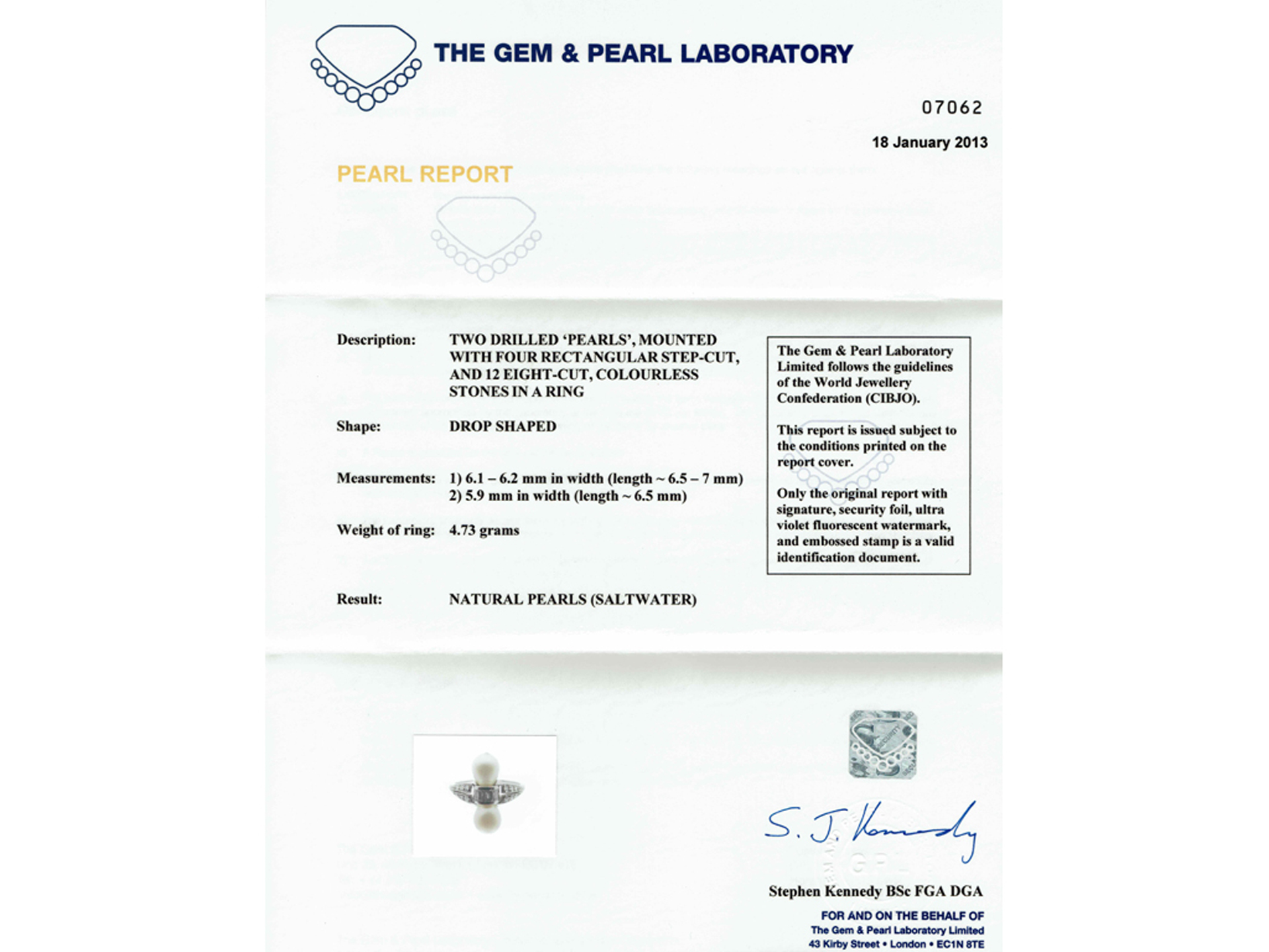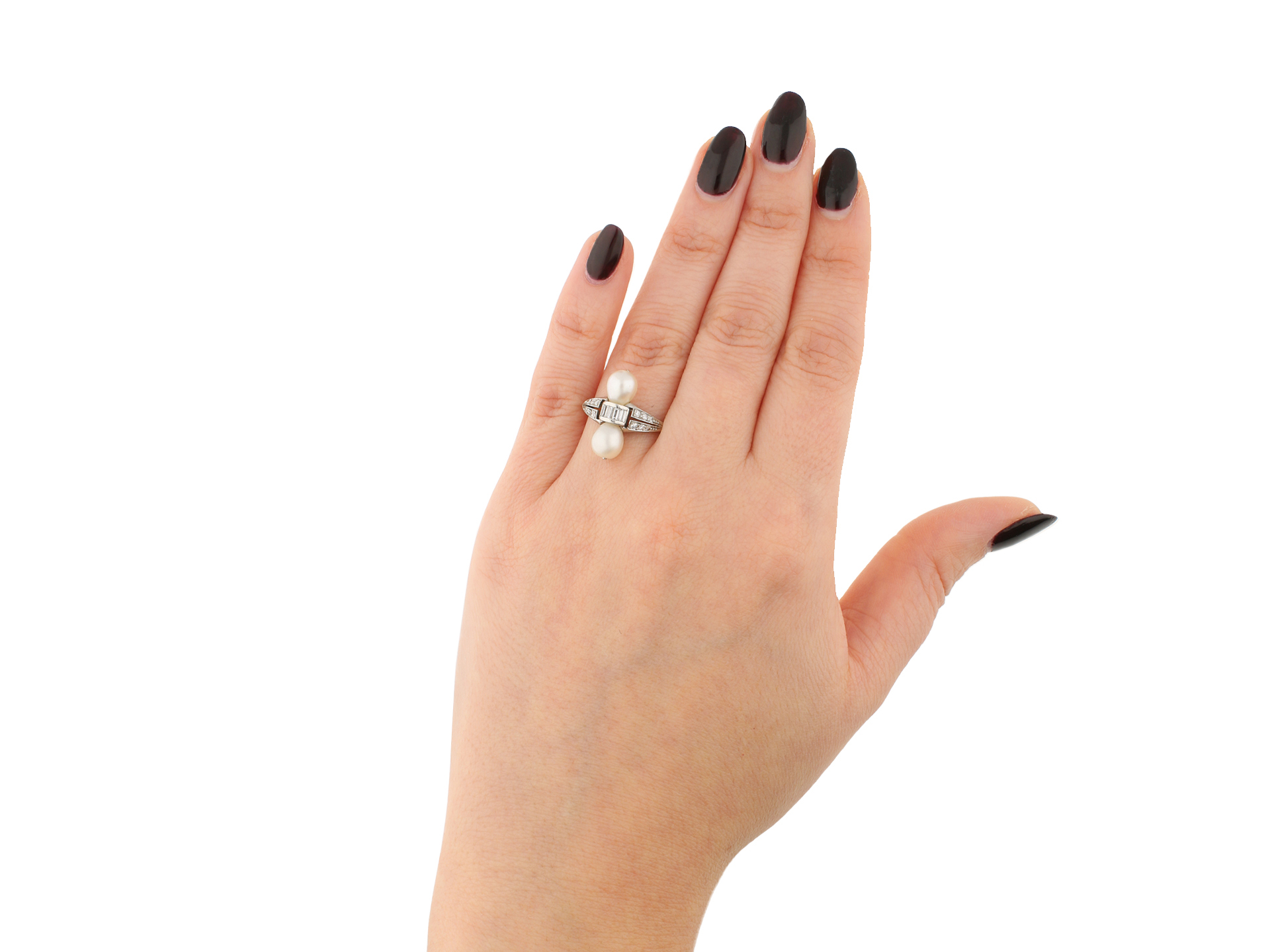 Two natural pearl and diamond ring. Set to centre with two drop shape natural pearls, separated with a row of four channel set baguette cut diamonds in open back rubover settings with a weight of 0.20 carats, flanked by twelve round old single cut diamonds in open back grain settings with a combined weight of 0.20 carats. The total approximate diamond weight is 0.40 carats, all set to a pierced conforming finger gallery with further delicate split openwork to the collet and pierced backholing, flowing down to a fine tapered shaped shank. Tested platinum, circa 1920, accompanied by GPL report #07062.