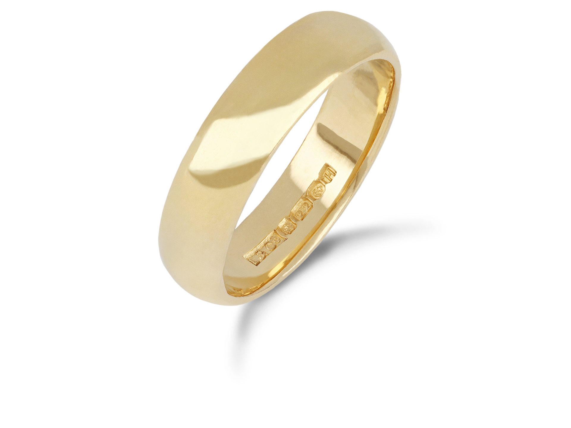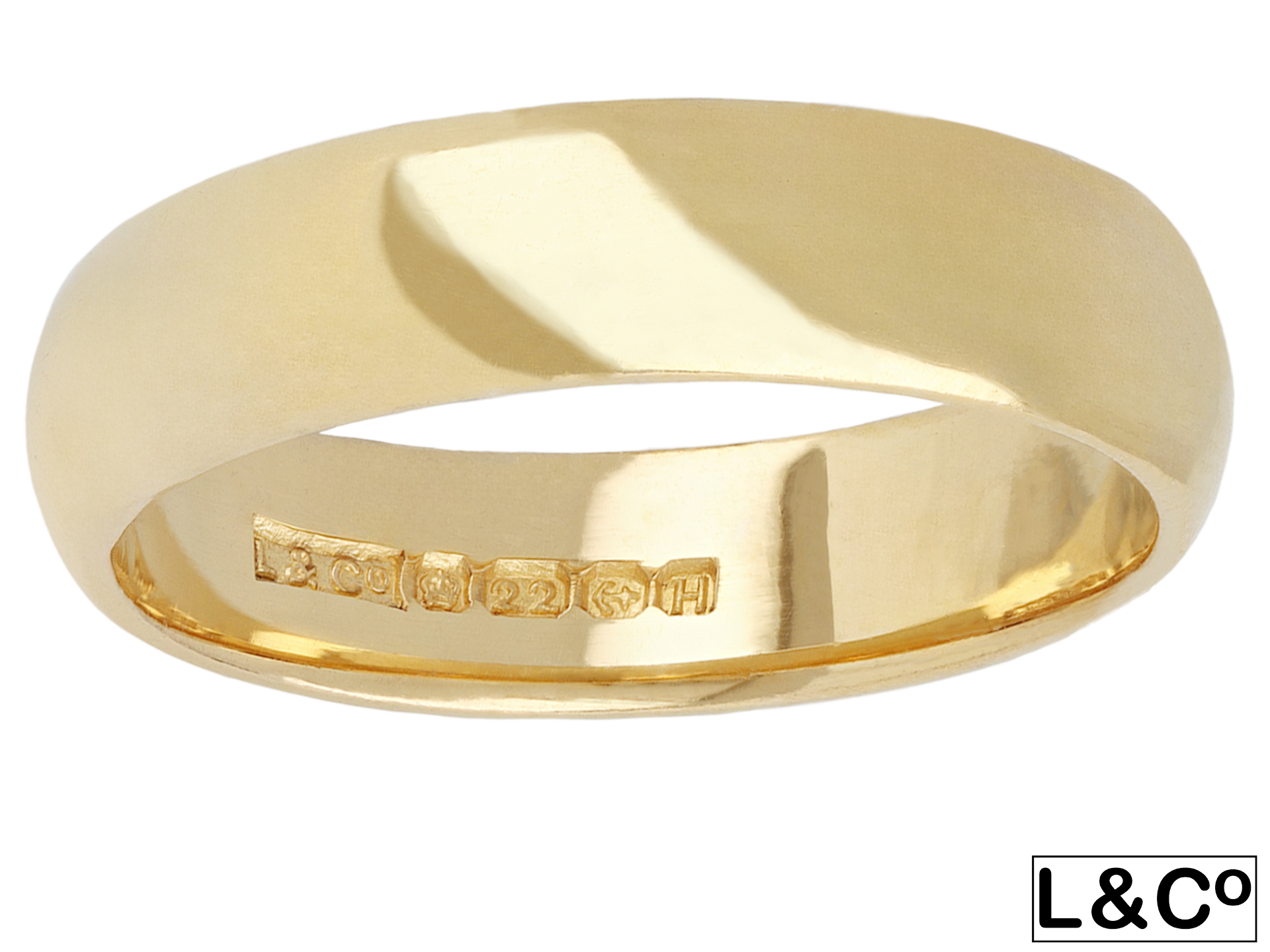 Victorian wedding band. A smoothly conforming D-shape wedding band with polished edges, approximately 4.8mm in width. Marked 22 carat yellow gold, approximately 5.67 grams in weight, maker's mark 'L & Co', full hallmarks for Birmingham, English, 1856.