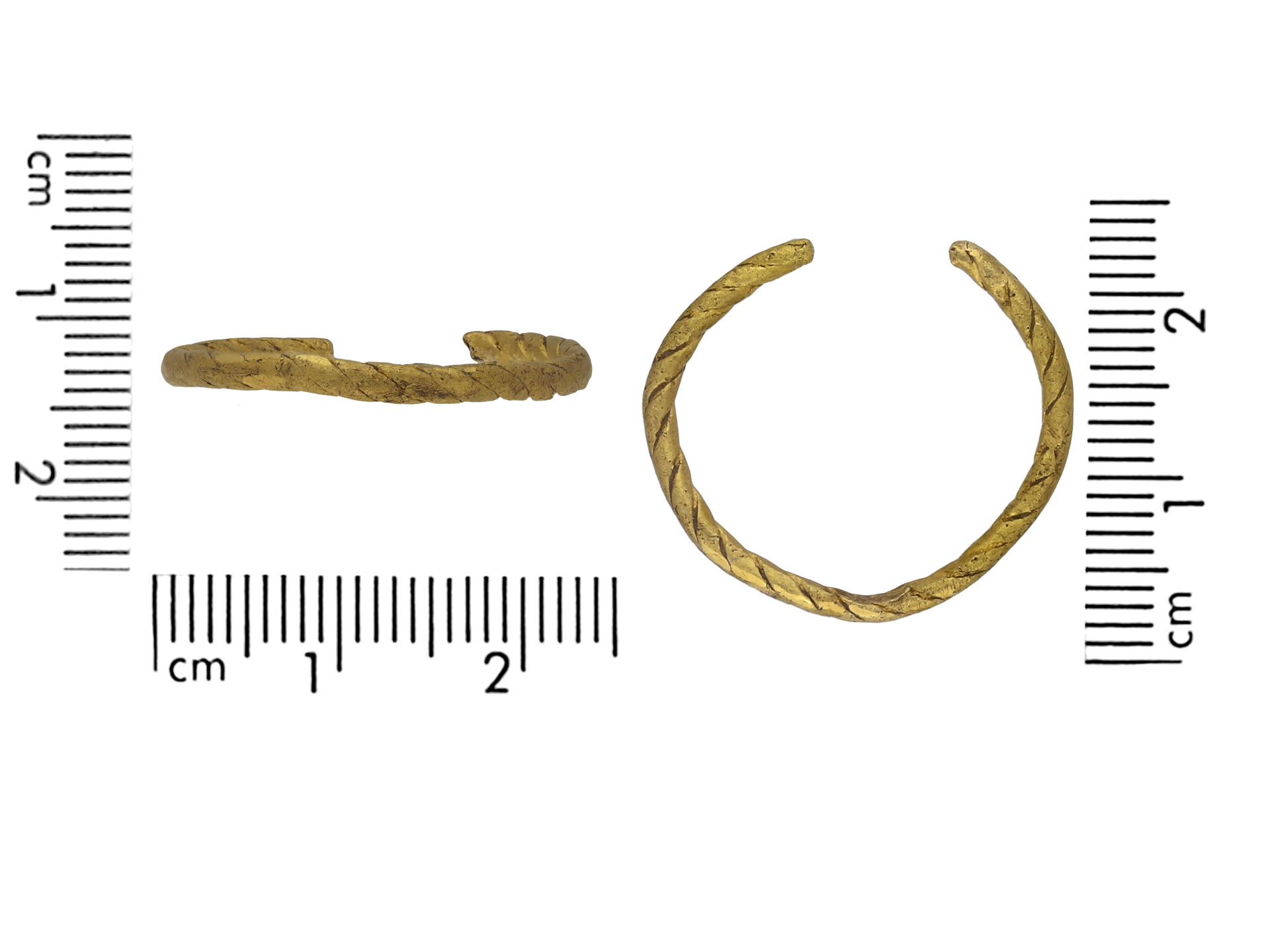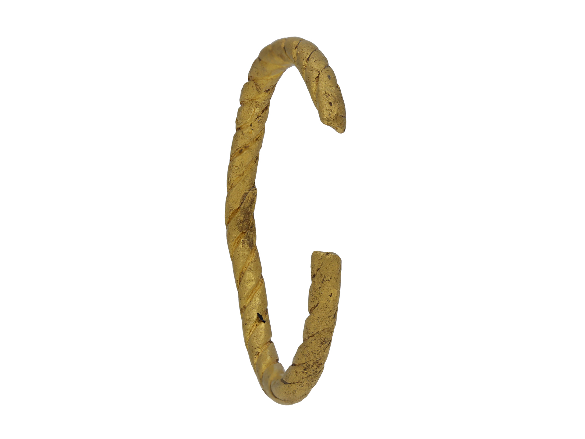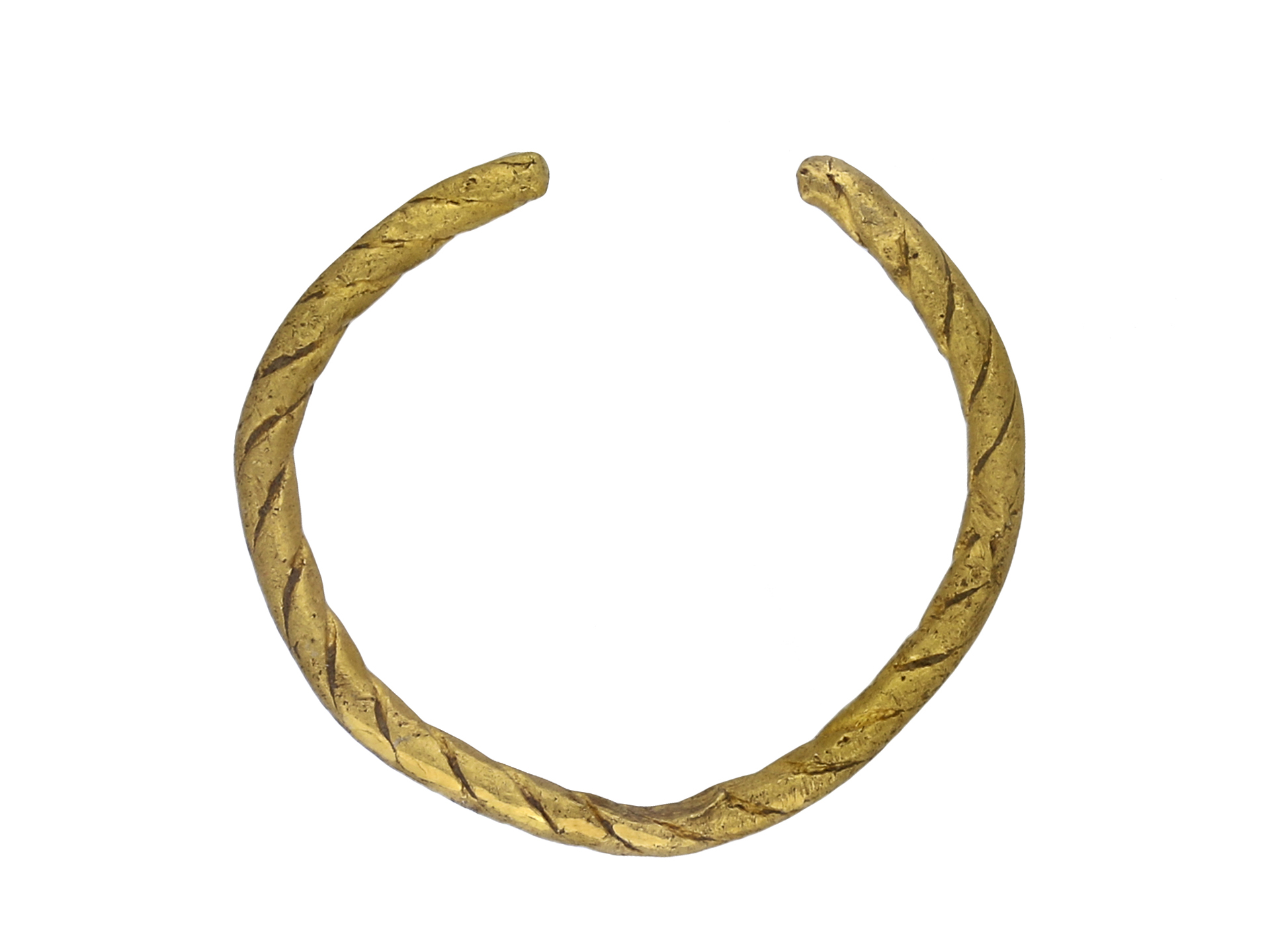 Viking gold penannular ring. A yellow gold ring composed of two twisted wires smoothed into a single rounded textured wire, to an open closure at reverse. Tested yellow gold, approximately 2.6 grams in weight, circa 9th - 11th century.