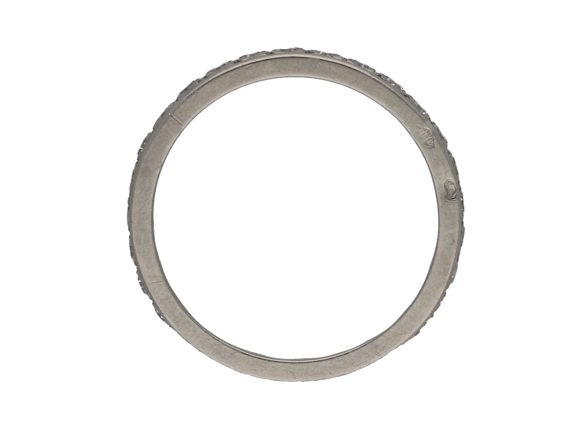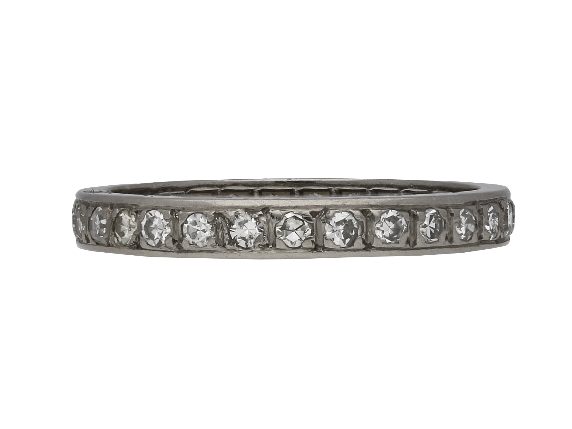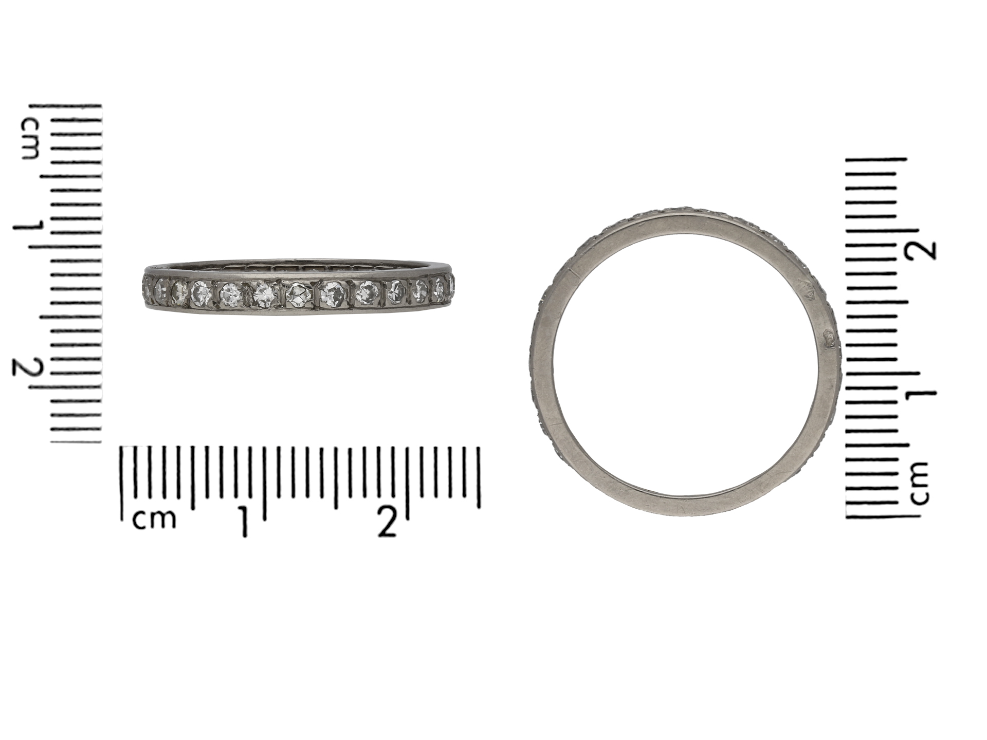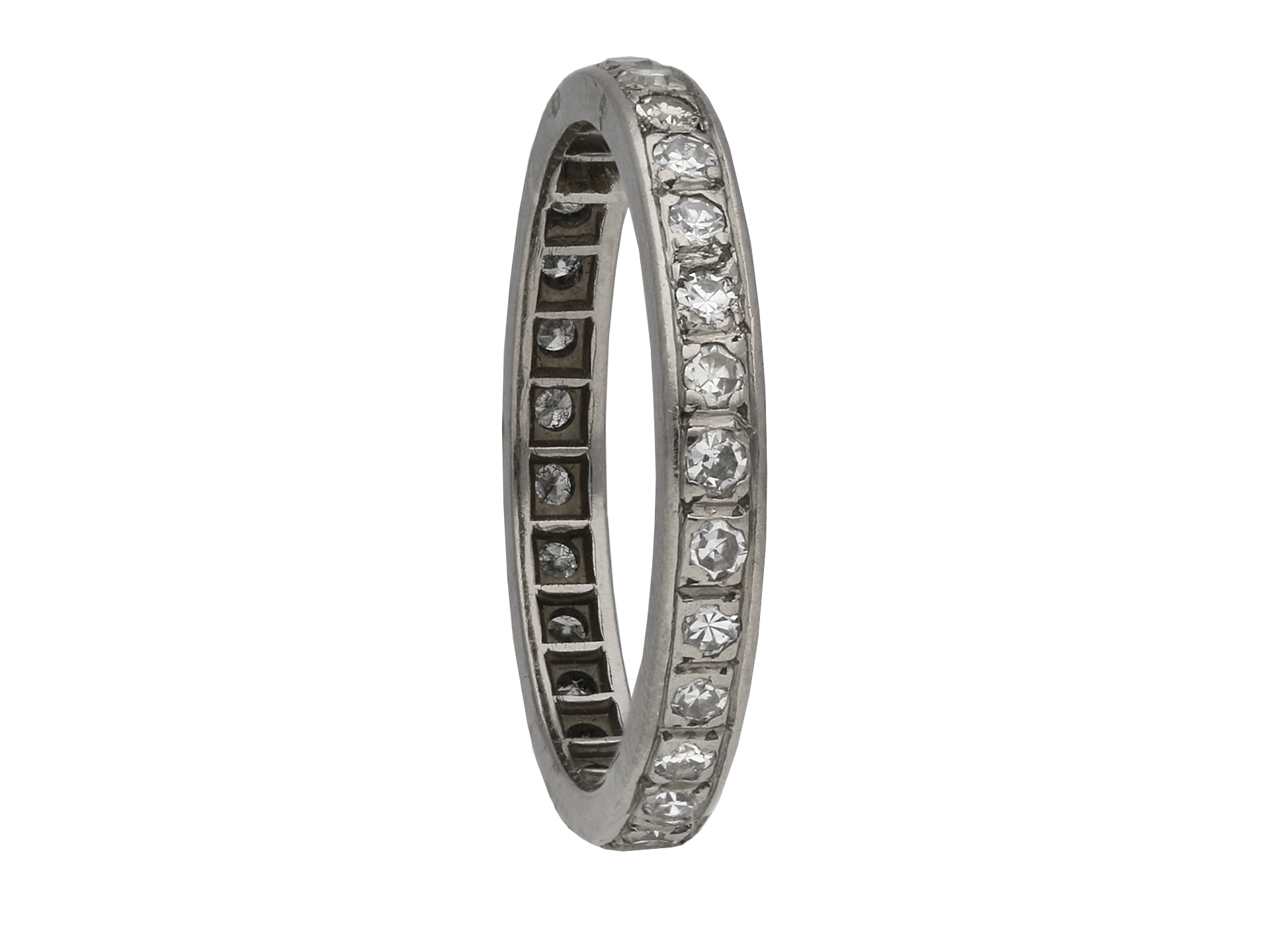 Vintage diamond eternity ring. Set with twenty nine round old single cut diamonds in open back grain settings with an approximate combined weight of 0.50 carats, to a smooth conforming band with intricate square backholing, approximately 2.8mm in width. Marked 18 carat white gold, maker's mark 'FB', French, circa 1950.