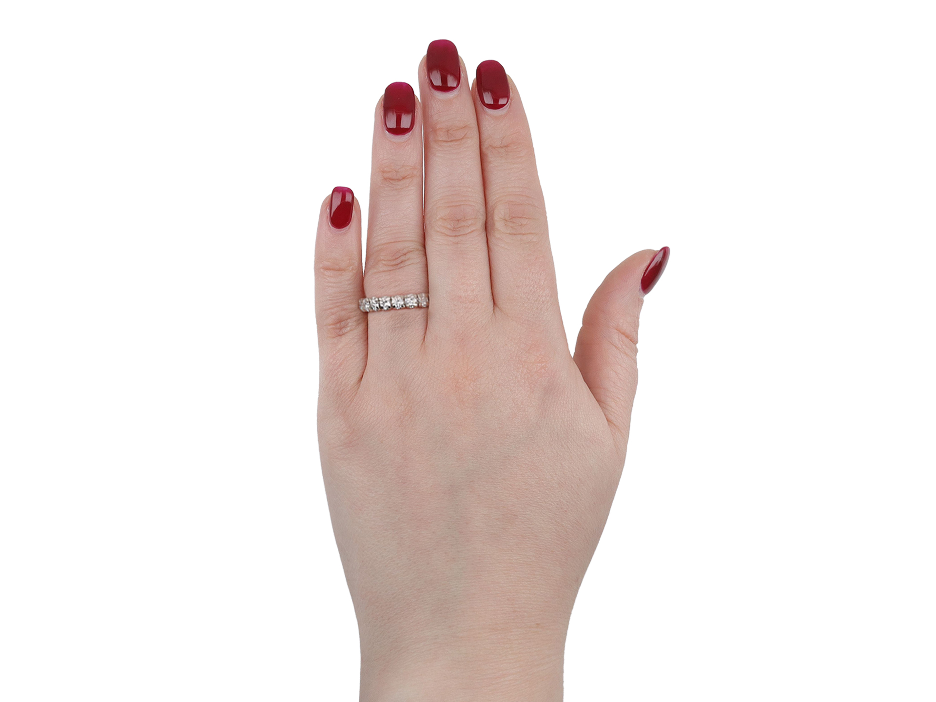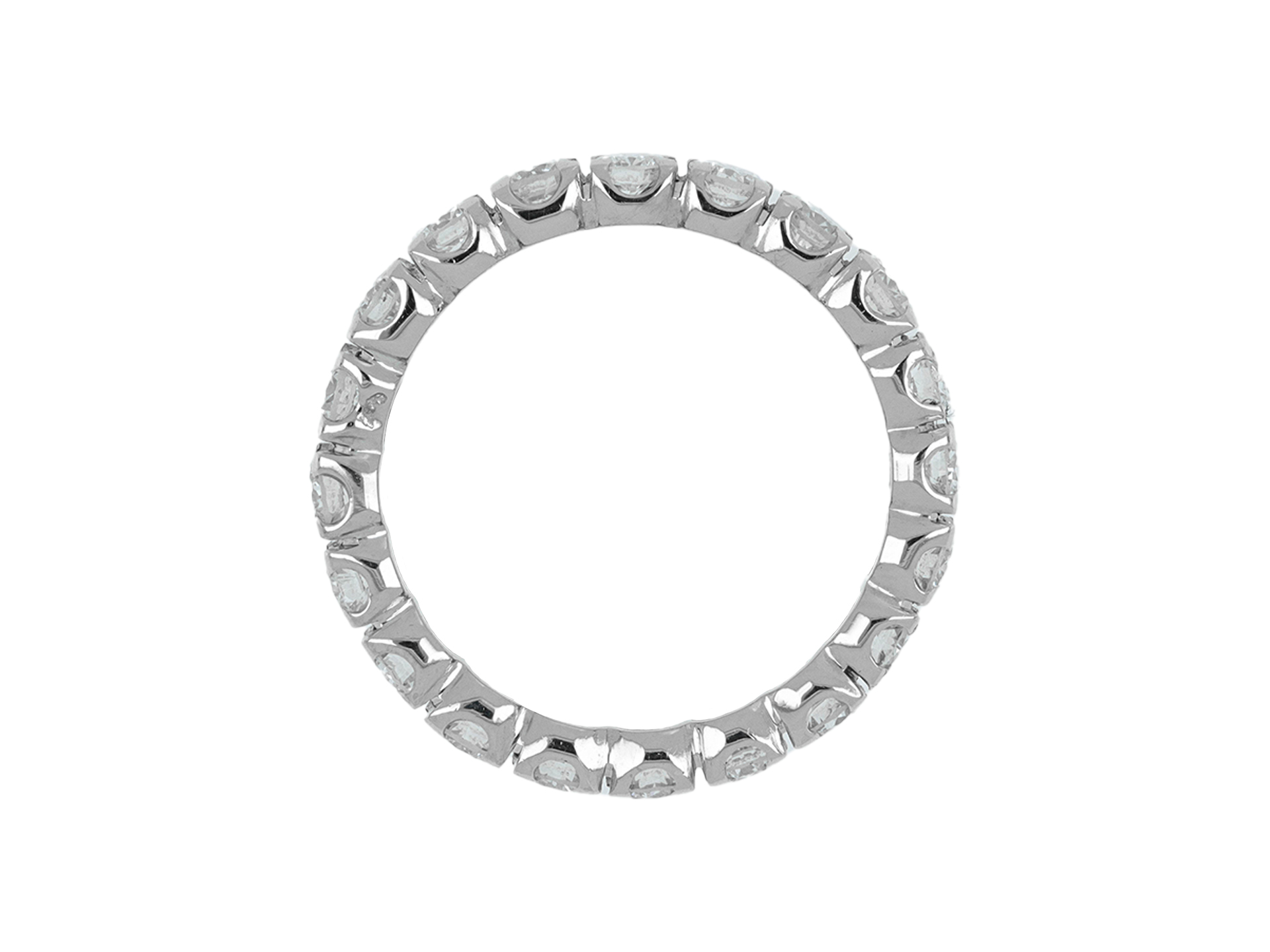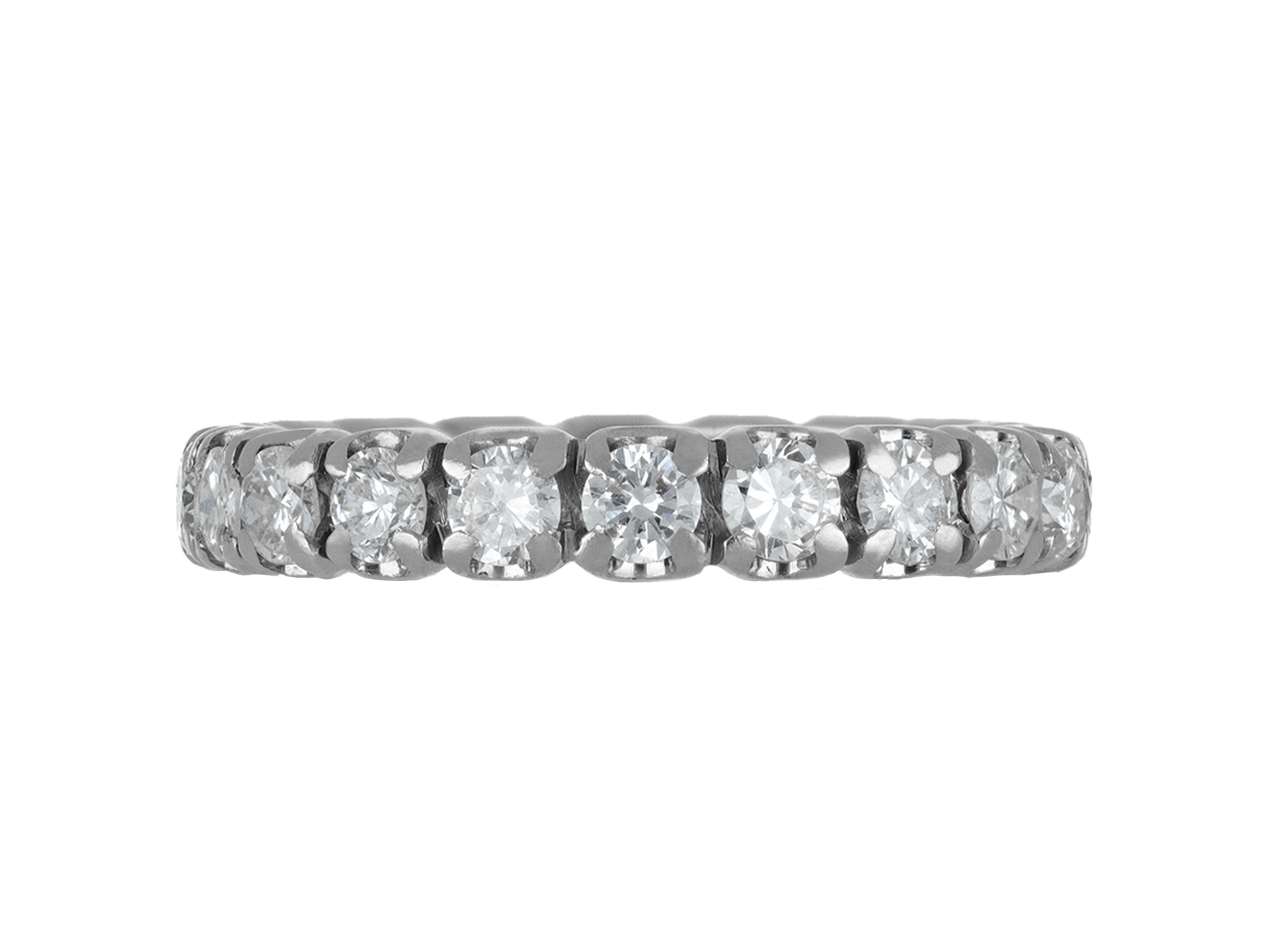 Diamond full eternity band. Set with twenty round transitional cut diamonds in open back claw settings with a combined approximate weight of 2.00 carats, to a smoothly conforming full eternity ring featuring curving claws, a polished grooved gallery and circular open backholing, approximately 3.5mm in width. Marked 18 carat white gold, French, circa 1950.