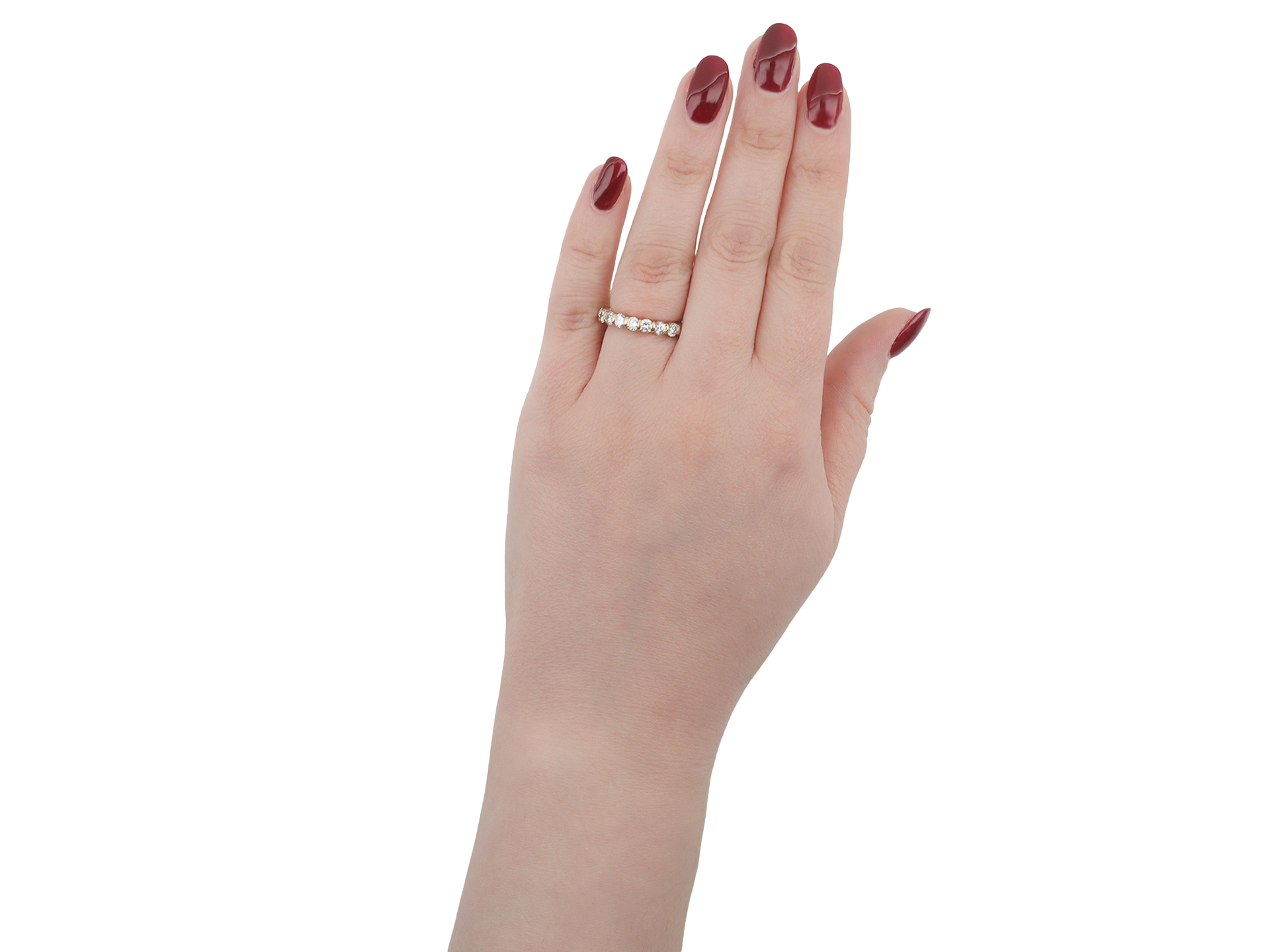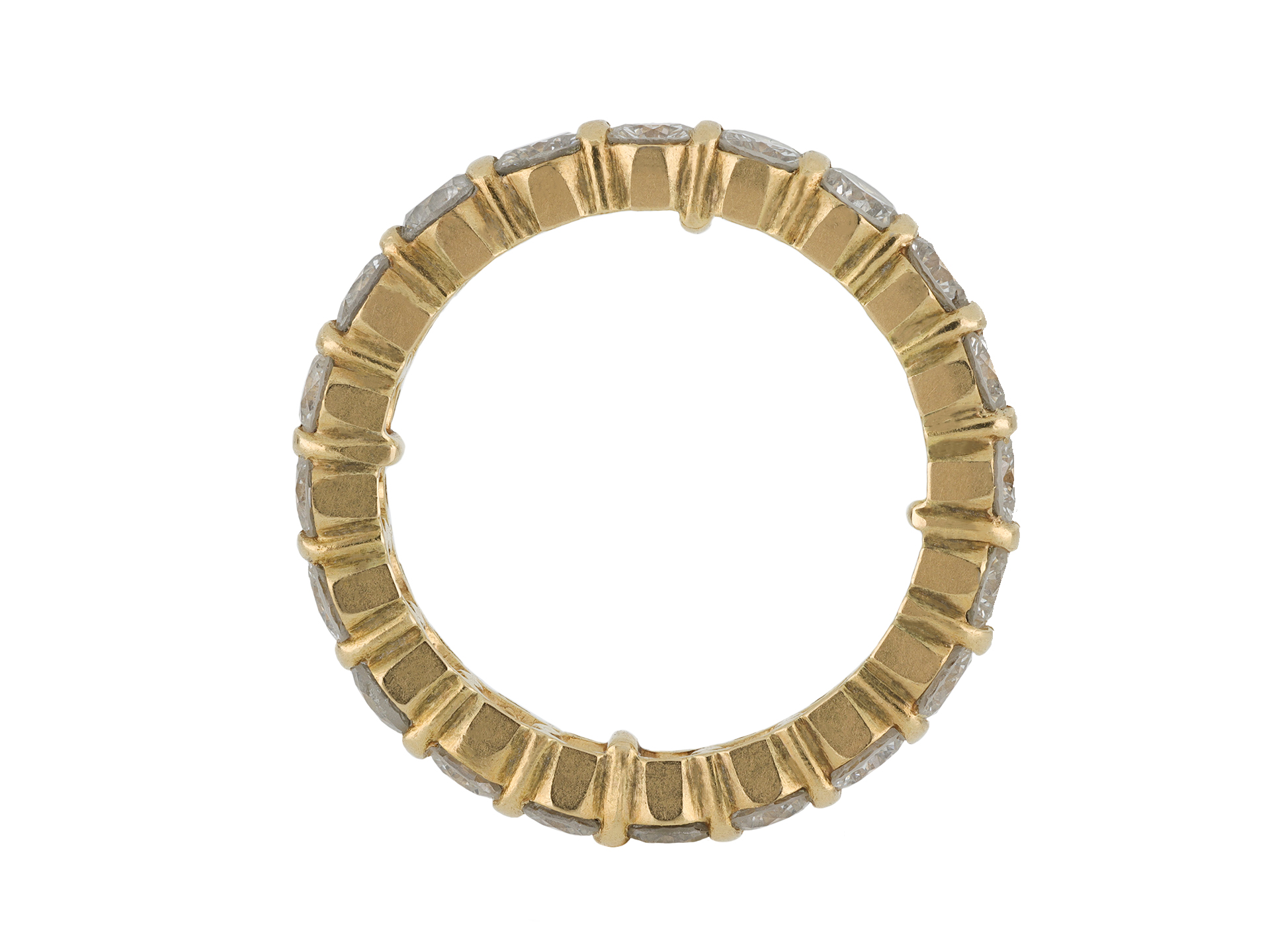 Vintage diamond full eternity ring. Set with twenty round brilliant cut diamonds in open back half rubover settings with a combined approximate weight of 2.30 carats, to a full eternity band featuring polished metalwork, a ridged gallery and fancy open backholing, approximately 3mm in width. Marked 18 carat yellow gold, indistinct makers mark, French, circa 1960.