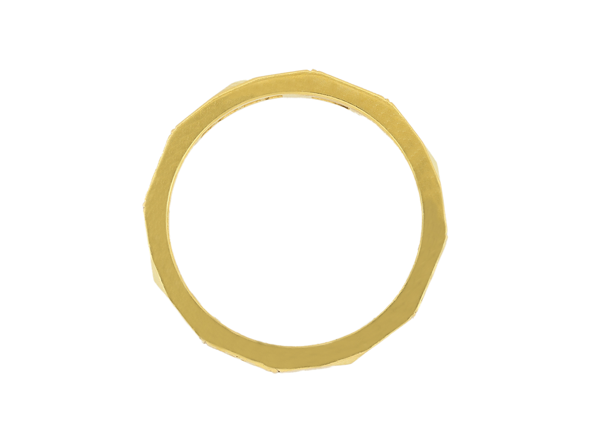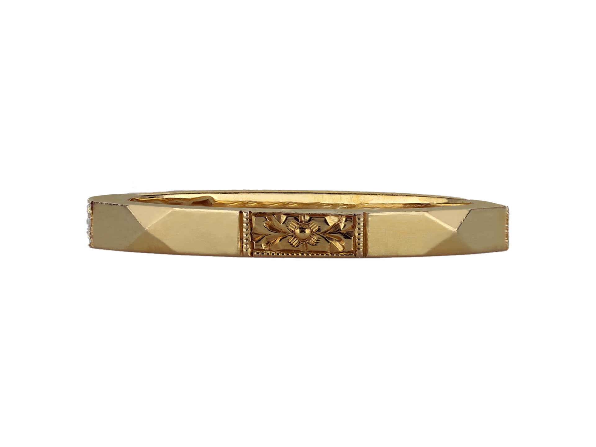 Yellow gold engraved wedding ring. An angular wedding band faceted around the full circumference, each panel finely engraved with a repeating stylised foliate design and millegrain border, approximately 2.5mm in width. Marked 22 carat yellow gold, approximately 3.47 grams in weight, maker's mark 'W&AG', full hallmarks for London, English, 1953.