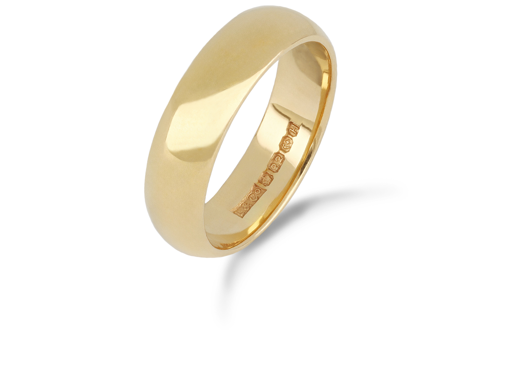 Yellow gold wedding band. A smoothly conforming D-shape wedding band with polished edges, approximately 5mm in width. Marked 22 carat yellow gold, approximately 5.65 grams in weight, maker's mark 'L & Co', full hallmarks for Birmingham, English, 1856.