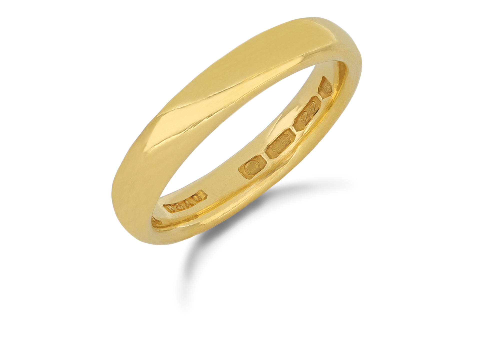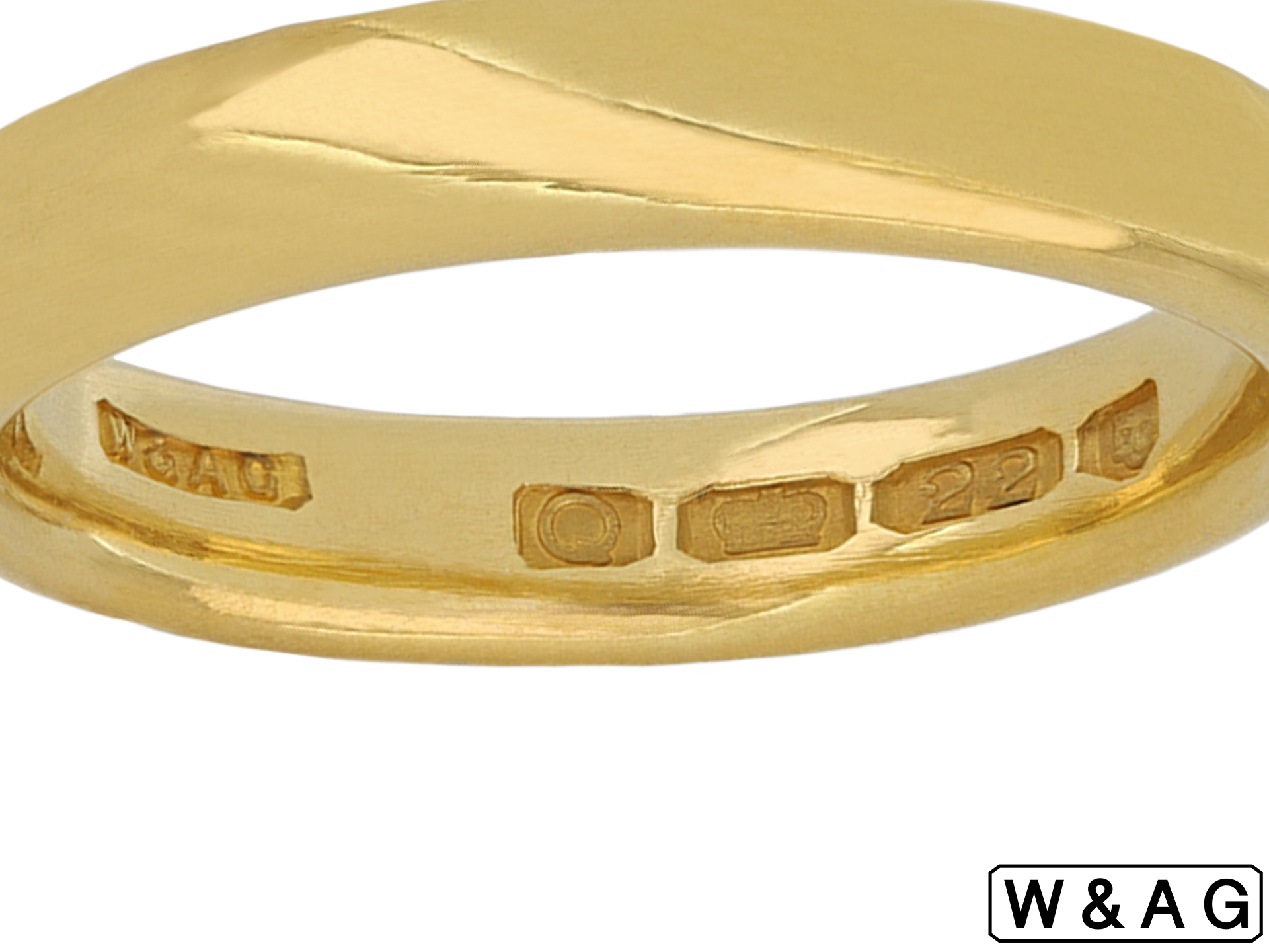 Yellow gold wedding band. A smoothly conforming court shape wedding band, approximately 3.5mm in width. Marked 22 carat yellow gold, approximately 6.1 grams in weight, maker's mark 'W&AG', full hallmarks for London, English, 1951.