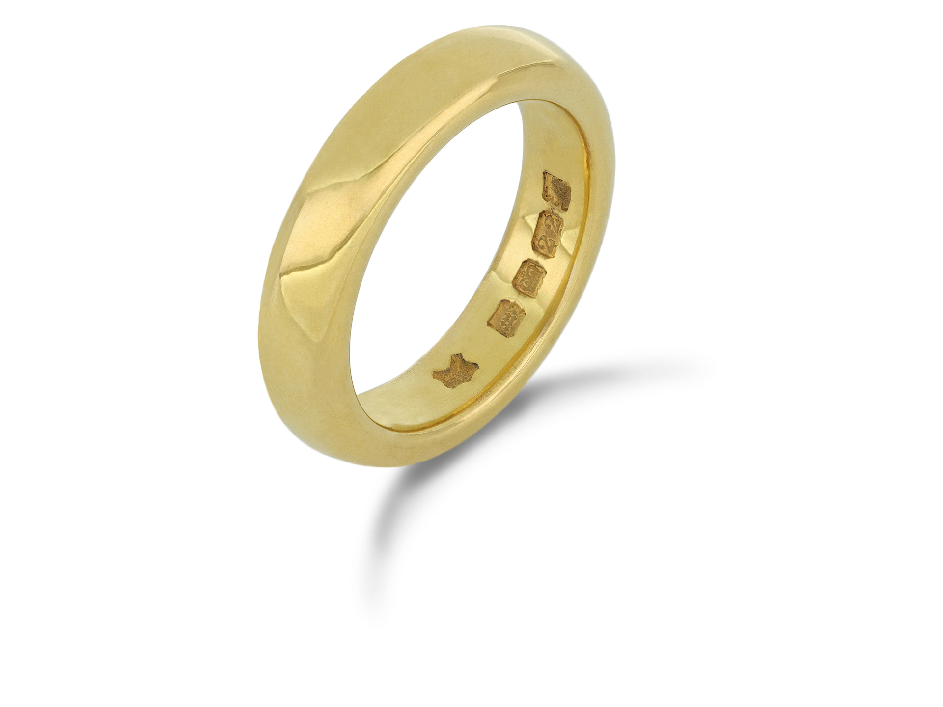 Yellow gold wedding band. A smoothly conforming D-shape wedding band with polished edges, approximately 5mm in width. Marked 22 carat yellow gold, approximately 12.76 grams in weight, indistinct maker's mark, full hallmarks for Birmingham, English, 1865.