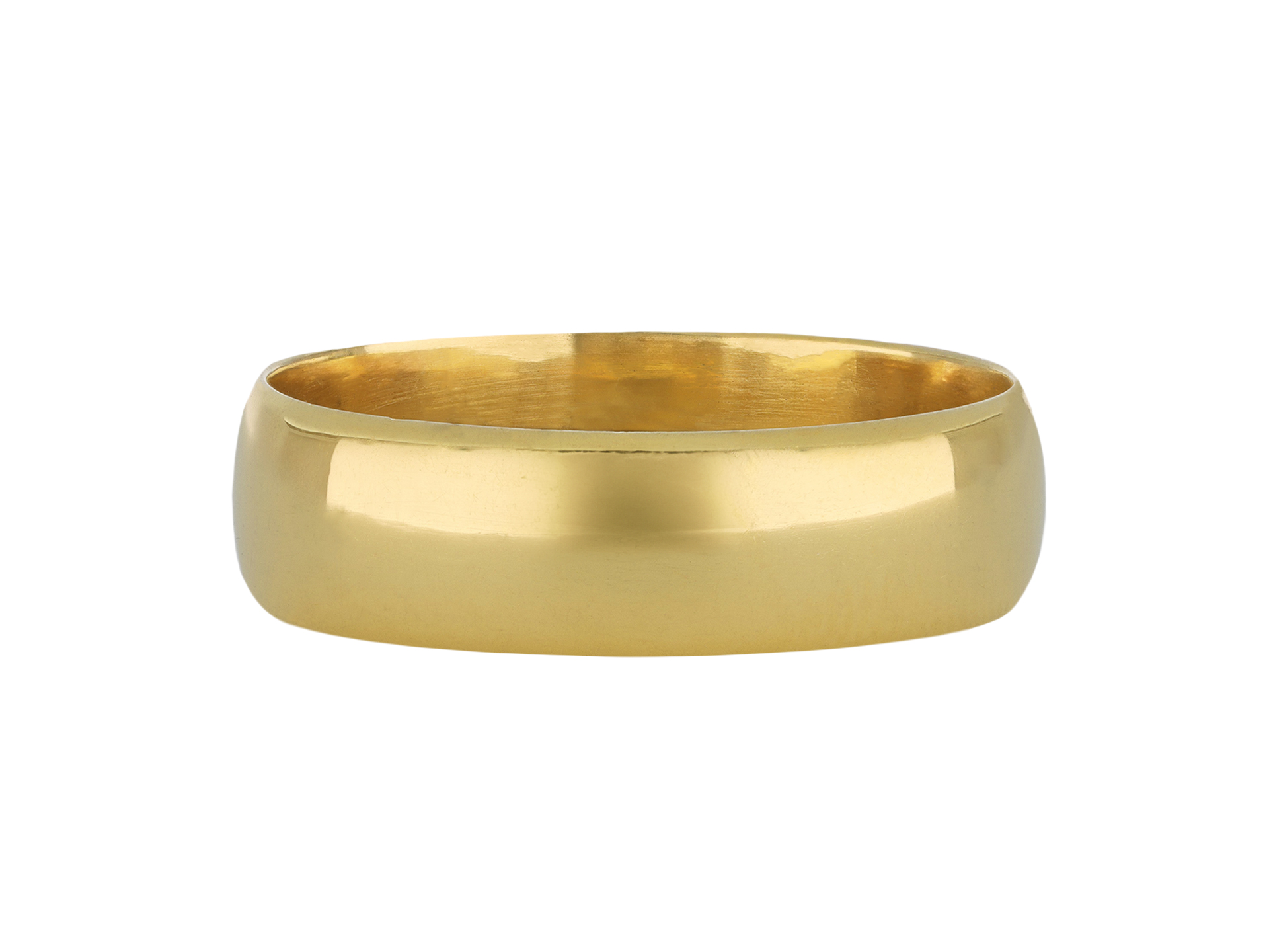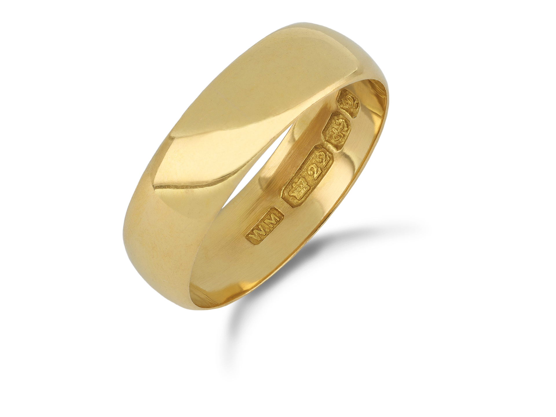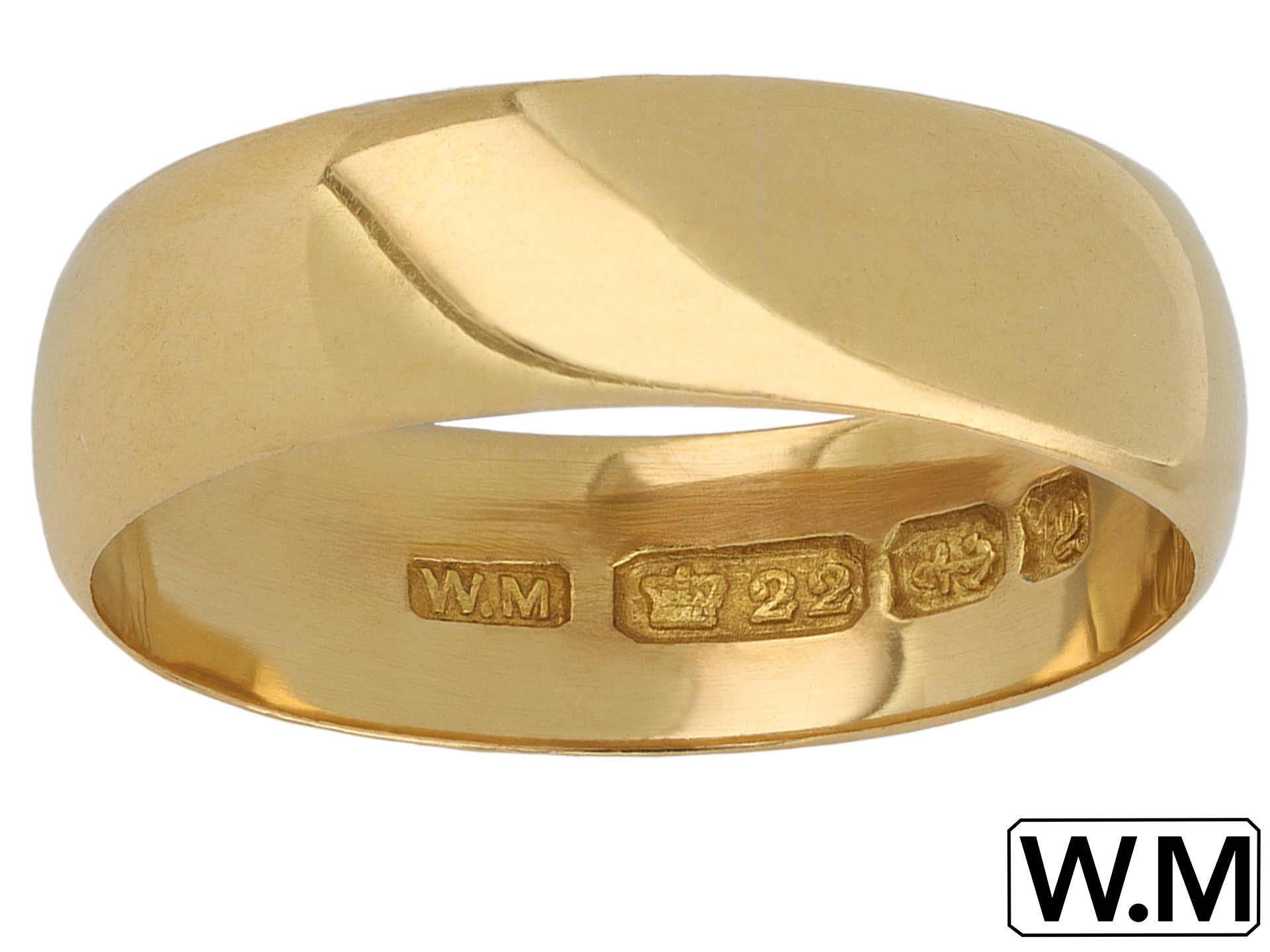 Yellow gold wedding band. A smoothly conforming D-shape band with smooth polished edges, approximately 5.8mm in width. Marked 22 carat yellow gold, approximately 4.30 grams in weight, makers mark 'W.M', full hallmarks for Birmingham, English, 1898.