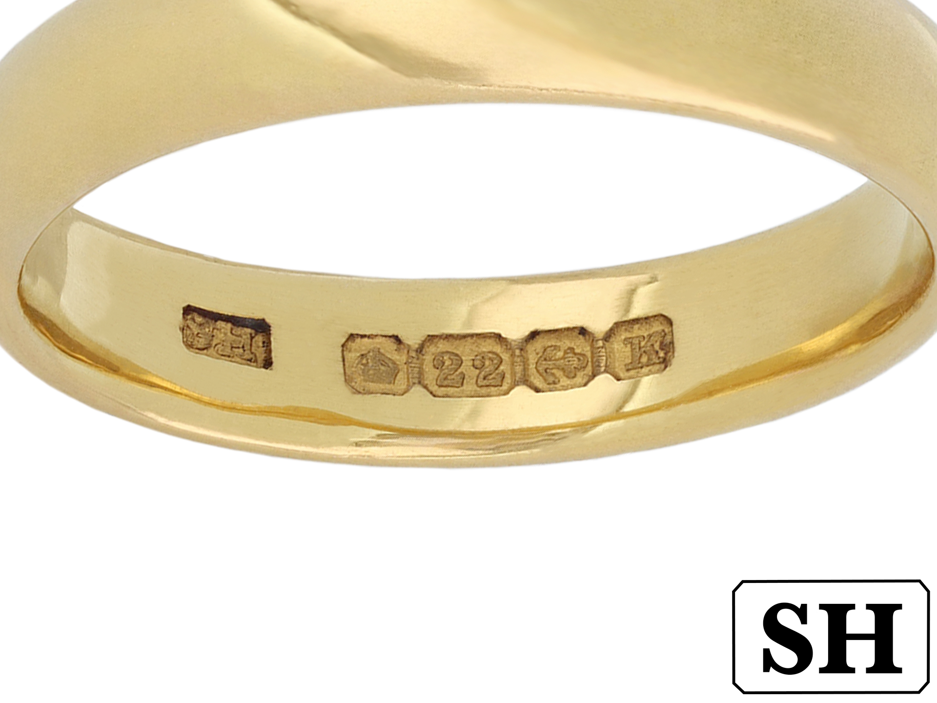 Yellow gold wedding band. A smoothly conforming court shape wedding band with polished edges, approximately 4mm in width. Marked 22 carat yellow gold, approximately 4.60 grams in weight, maker's mark 'SH' for the maker Samuel Hope, full hallmarks for Birmingham, English, 1909.