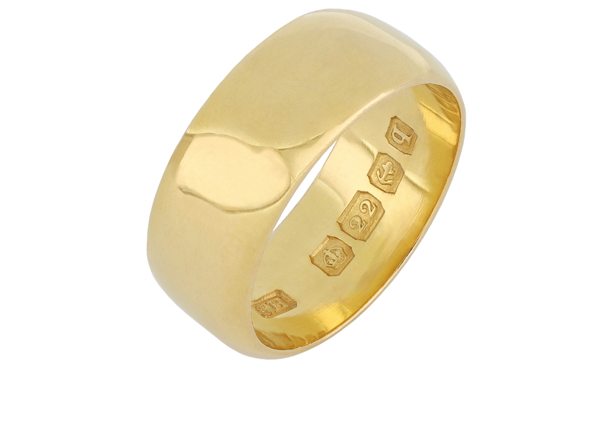 Yellow gold wedding band. A smoothly conforming D-shape wedding band with polished edges, approximately 7mm in width. Marked 22 carat yellow gold, approximately 6.30 grams in weight, maker's mark 'SH' for Samuel Hopes, full hallmarks for Birmingham, English, 1915.