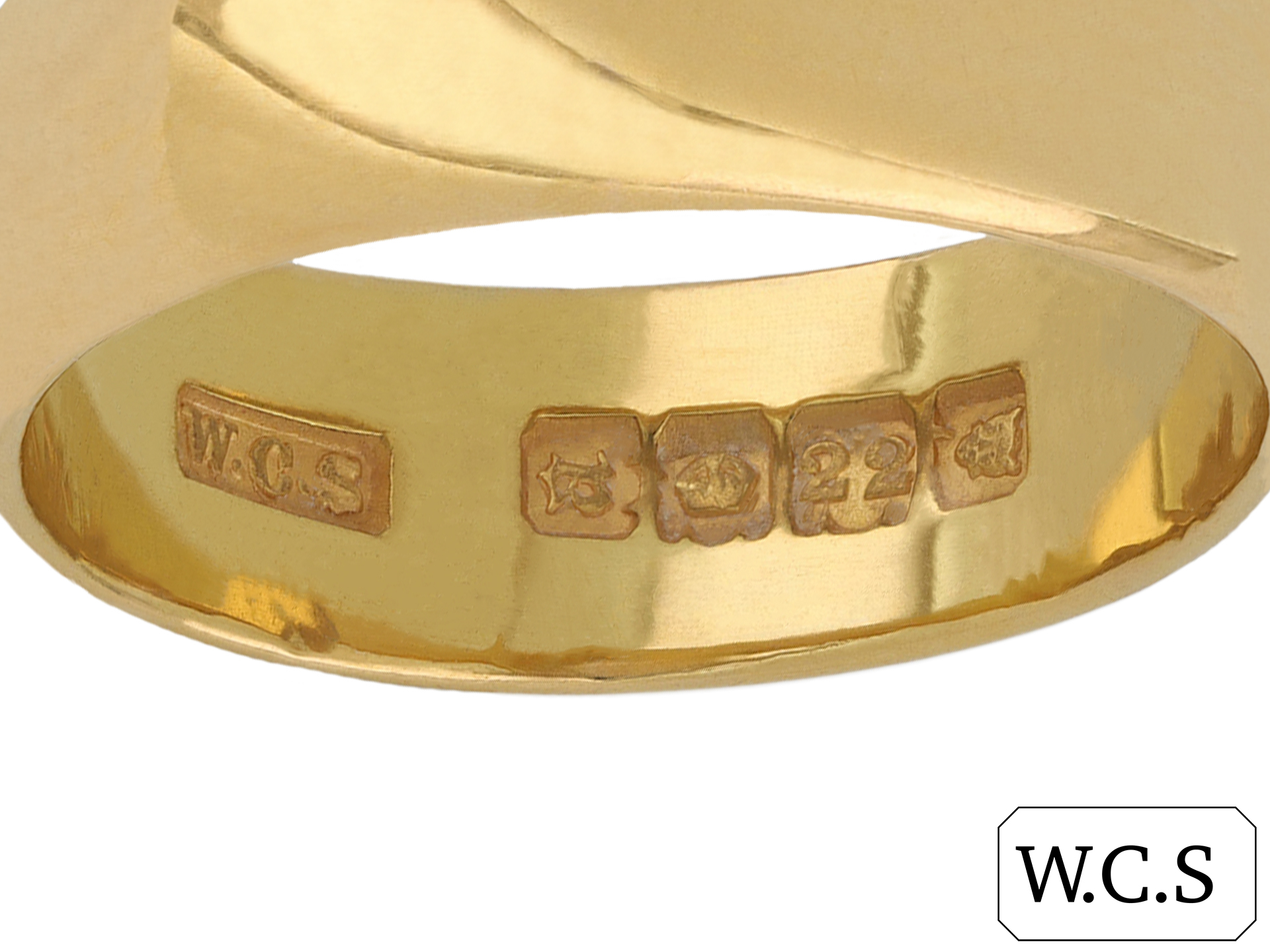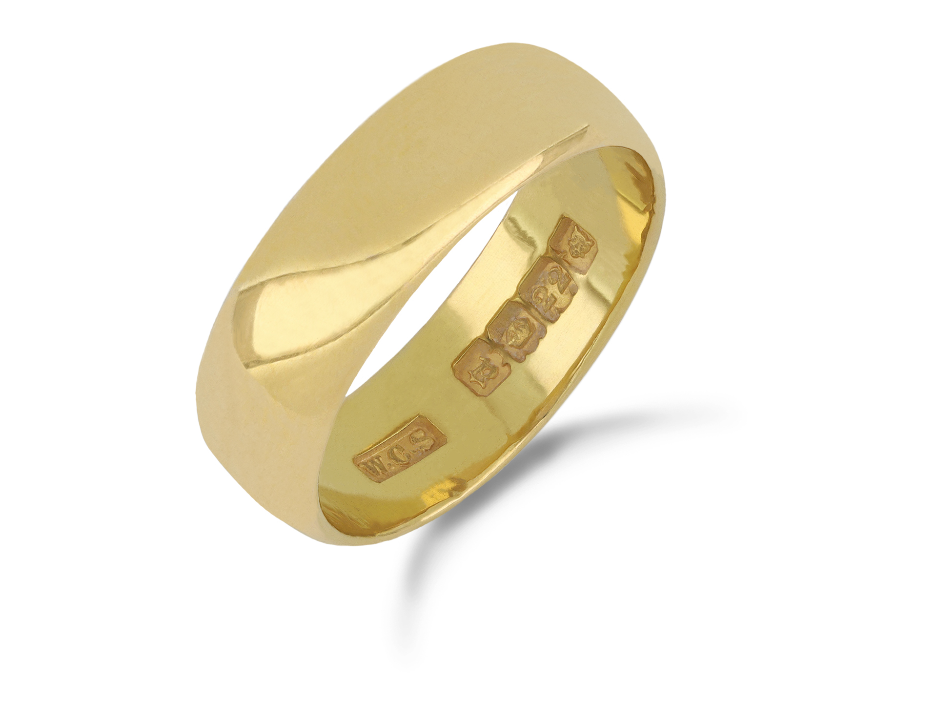 Yellow gold wedding band. A smooth conforming D-shape band with smooth and polished edges, approximately 6.4mm in width. Marked 22 carat yellow gold, approximately 6.23 grams in weight, maker's mark 'W.C.S', full hallmarks for London, English, 1916.