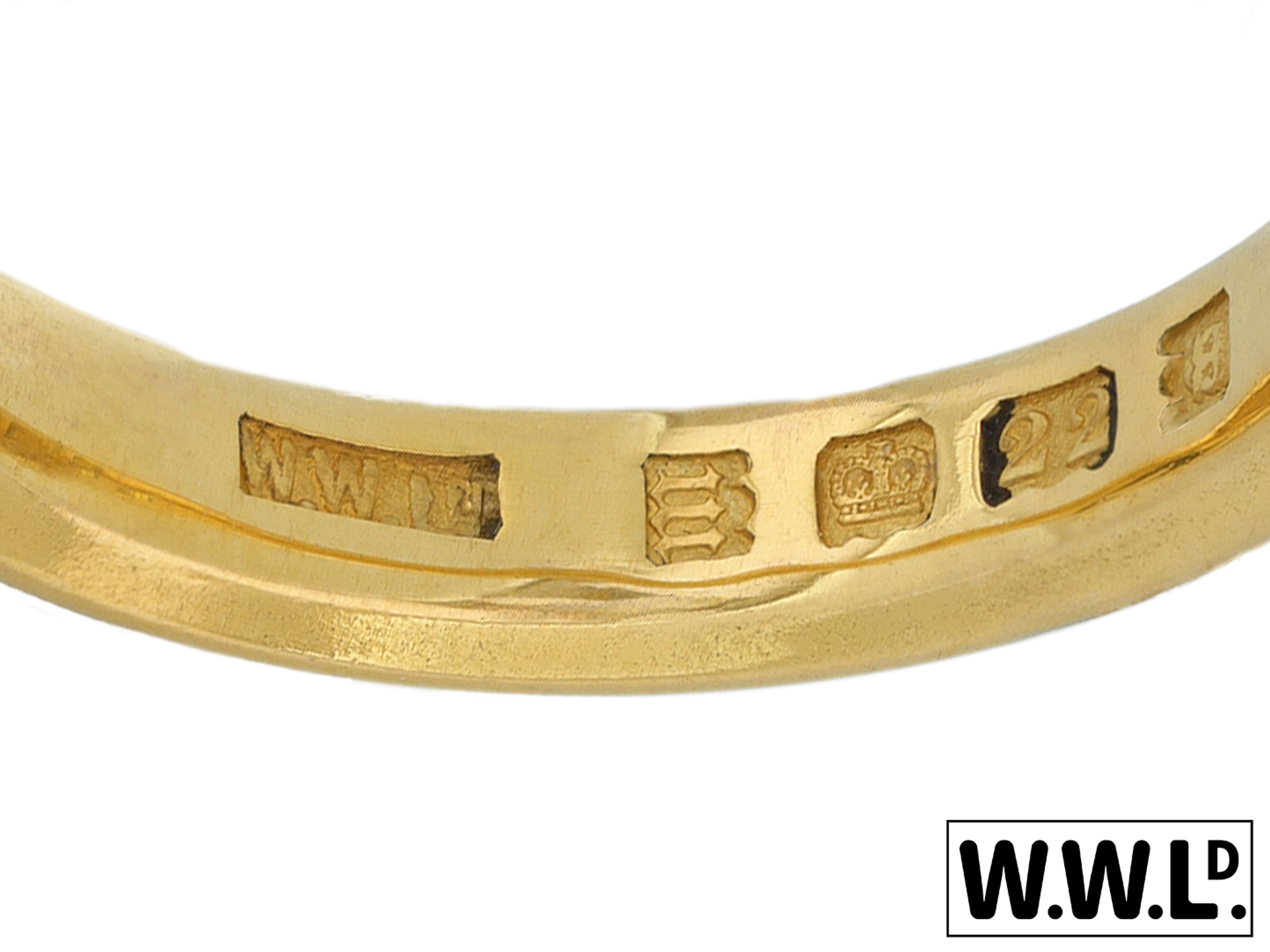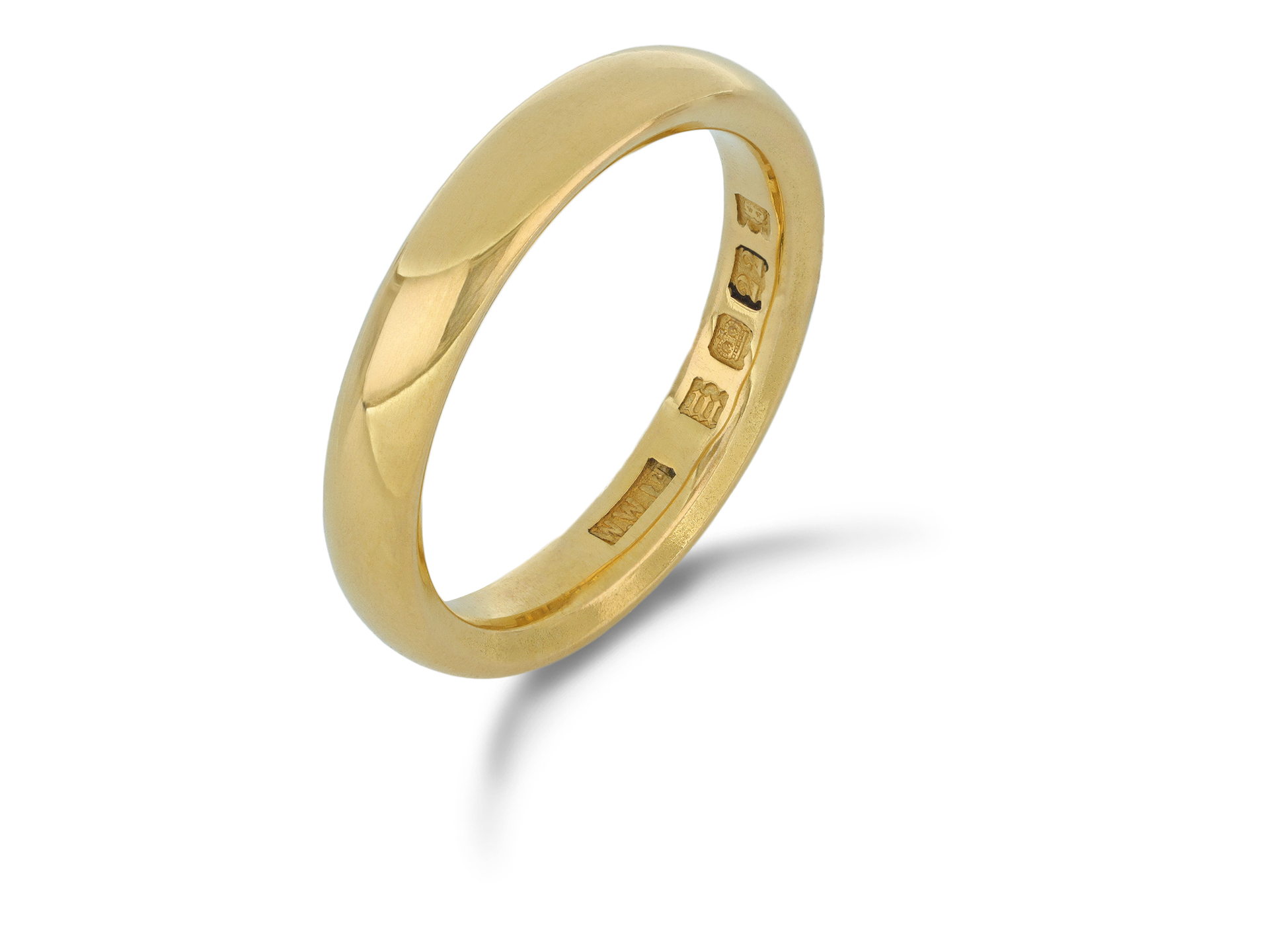 Yellow gold wedding band. A smoothly conforming D-Shape wedding band with polished edges, approximately 3.5mm in width. Marked 22 carat yellow gold, maker's mark 'W.WLtd', for Wilkinson Ltd, full hallmarks for London, English, 1927.