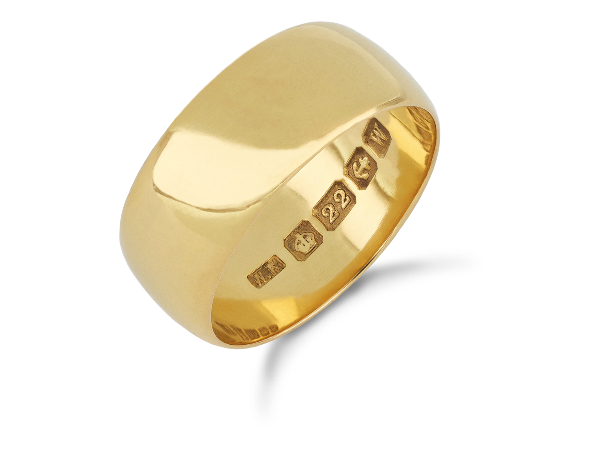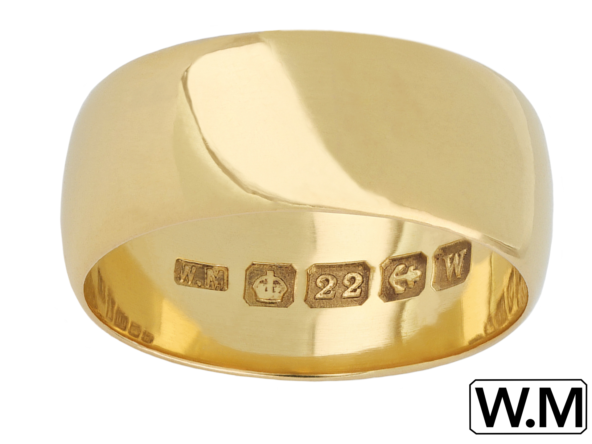 Yellow gold wedding band. A smoothly conforming D-shape wedding band, approximately 7.5mm in width. Marked 22 carat yellow gold, approximately 5.58 grams in weight, maker's mark 'W.M' for William Manton, full hallmarks for Birmingham, English, 1946.