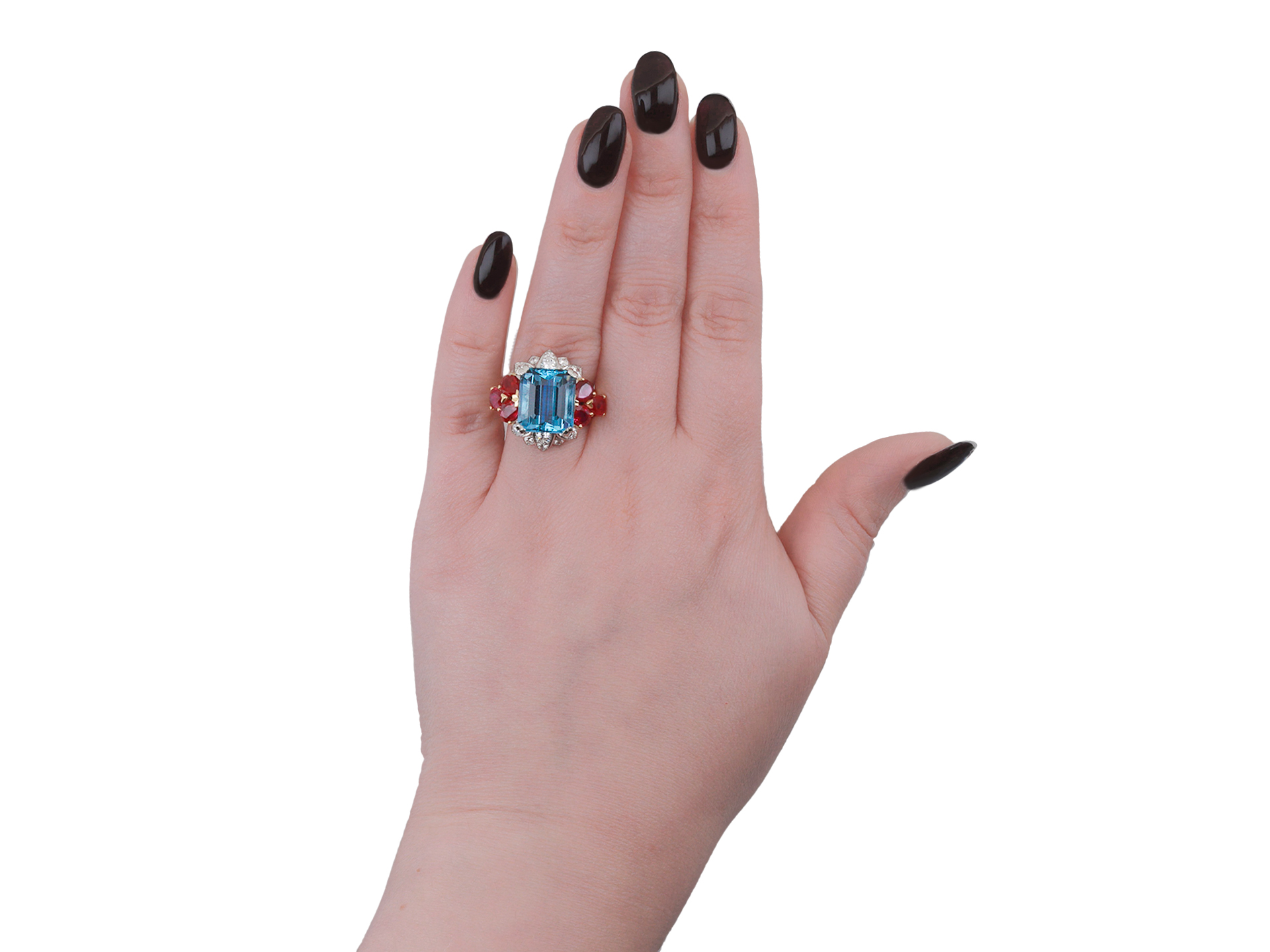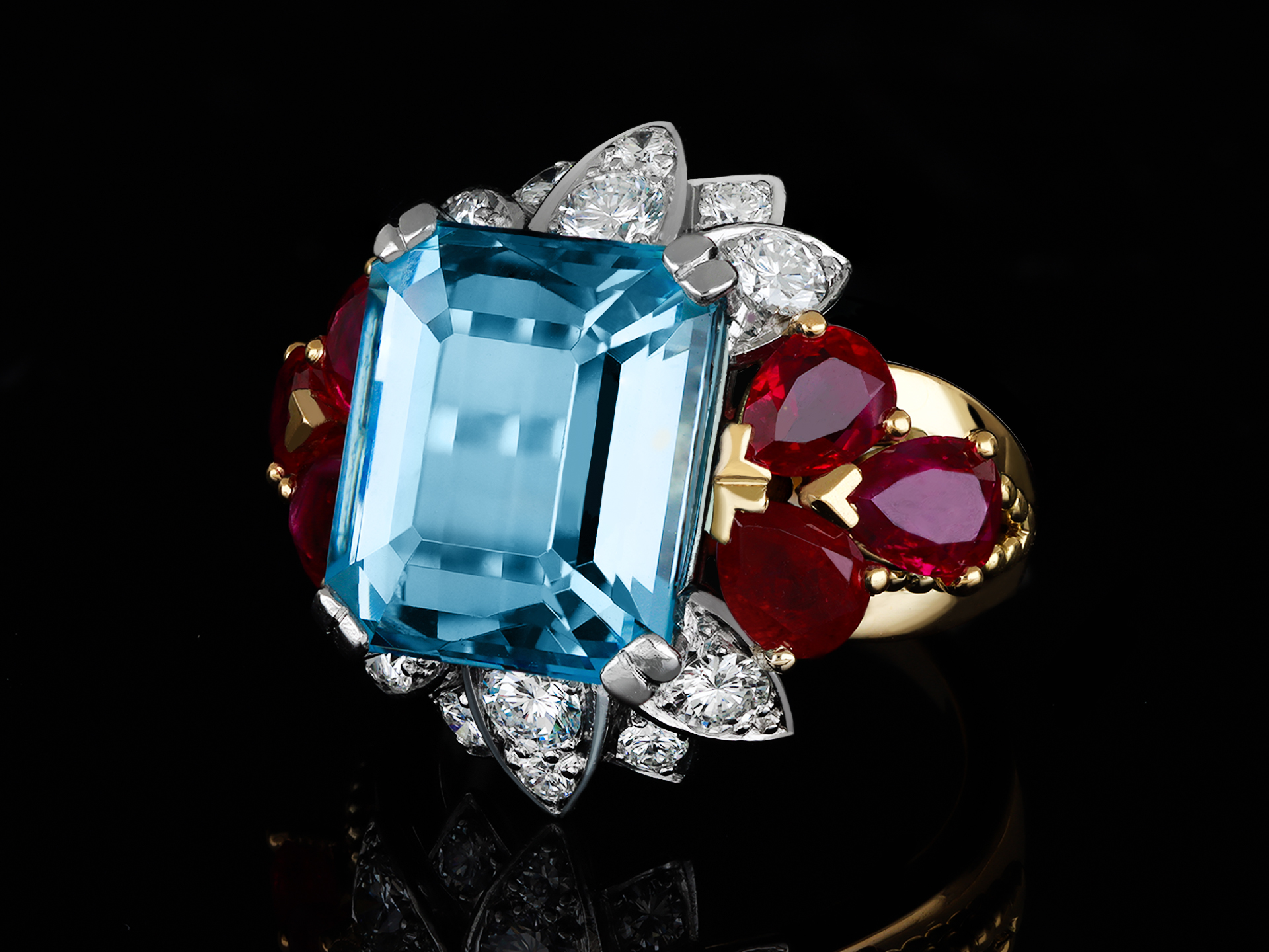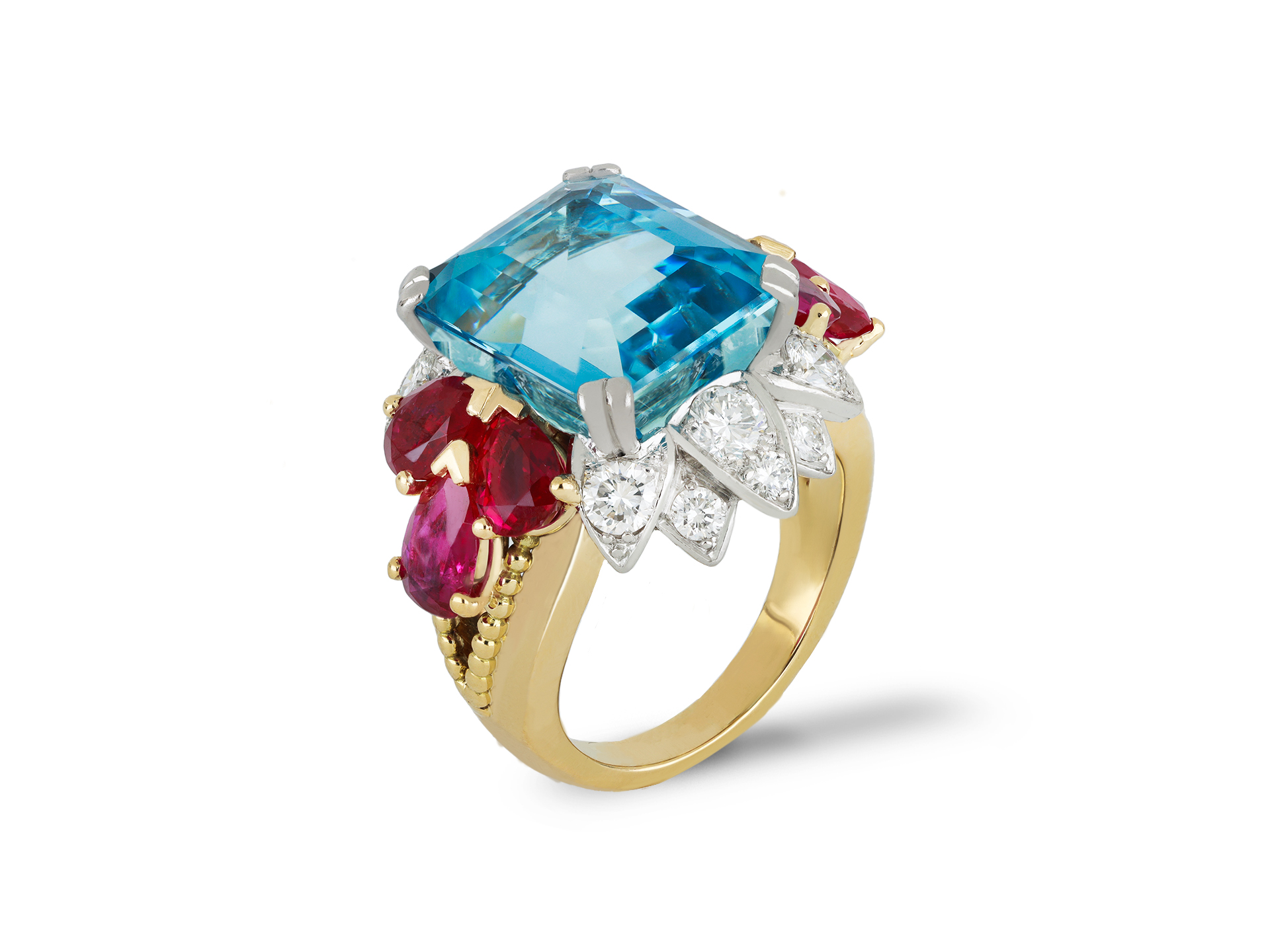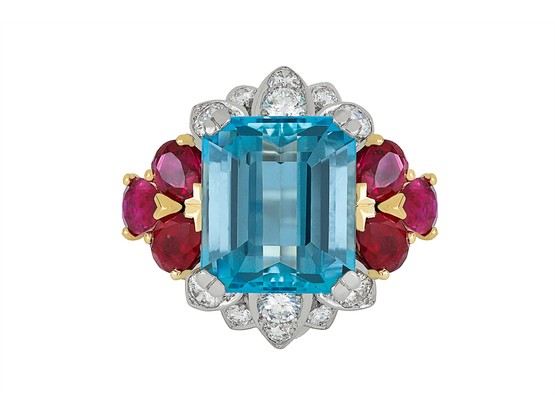 Aquamarine, ruby and diamond cocktail ring. Set with an octagonal emerald-cut natural aquamarine in an open back claw setting with an approximate weight of 8.22 carats, flanked by six drop shape old cut Burmese rubies in open back claw settings with a combined approximate weight of 3.07 carats, further set with twelve round brilliant cut diamonds in open back grain settings with an approximate weight of 0.41 carats, to an impressive cocktail ring design featuring platinum borders, an open granulated gallery and fancy open backholing, flanked by split shoulders flowing through to a tapering D-shape shank. Tested as yellow gold and platinum, circa 1950.