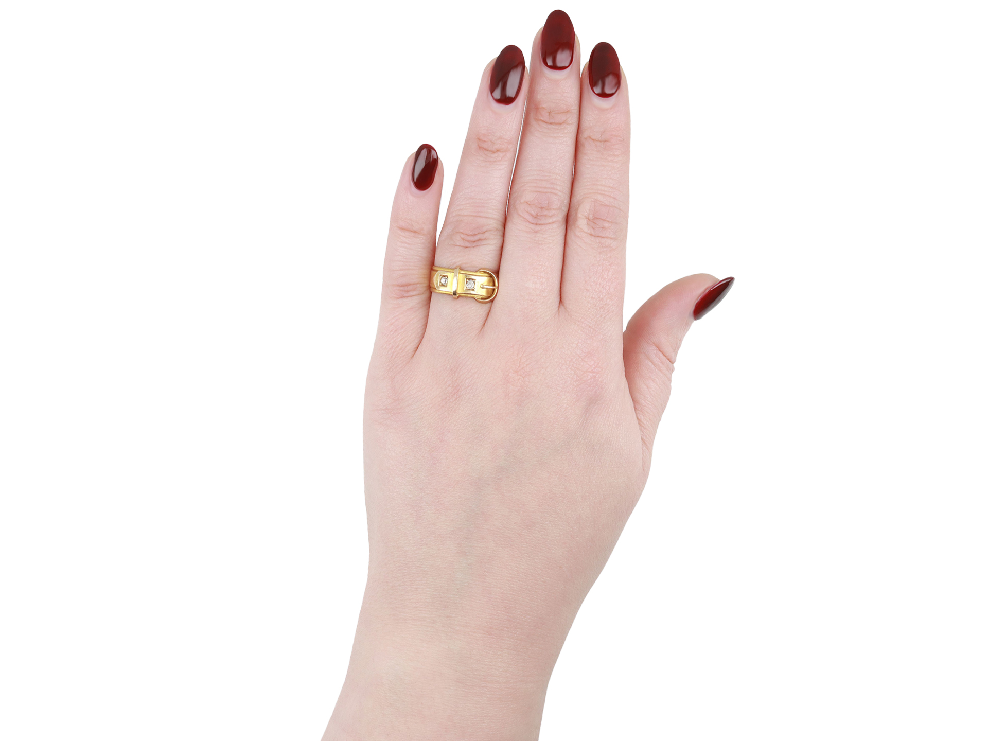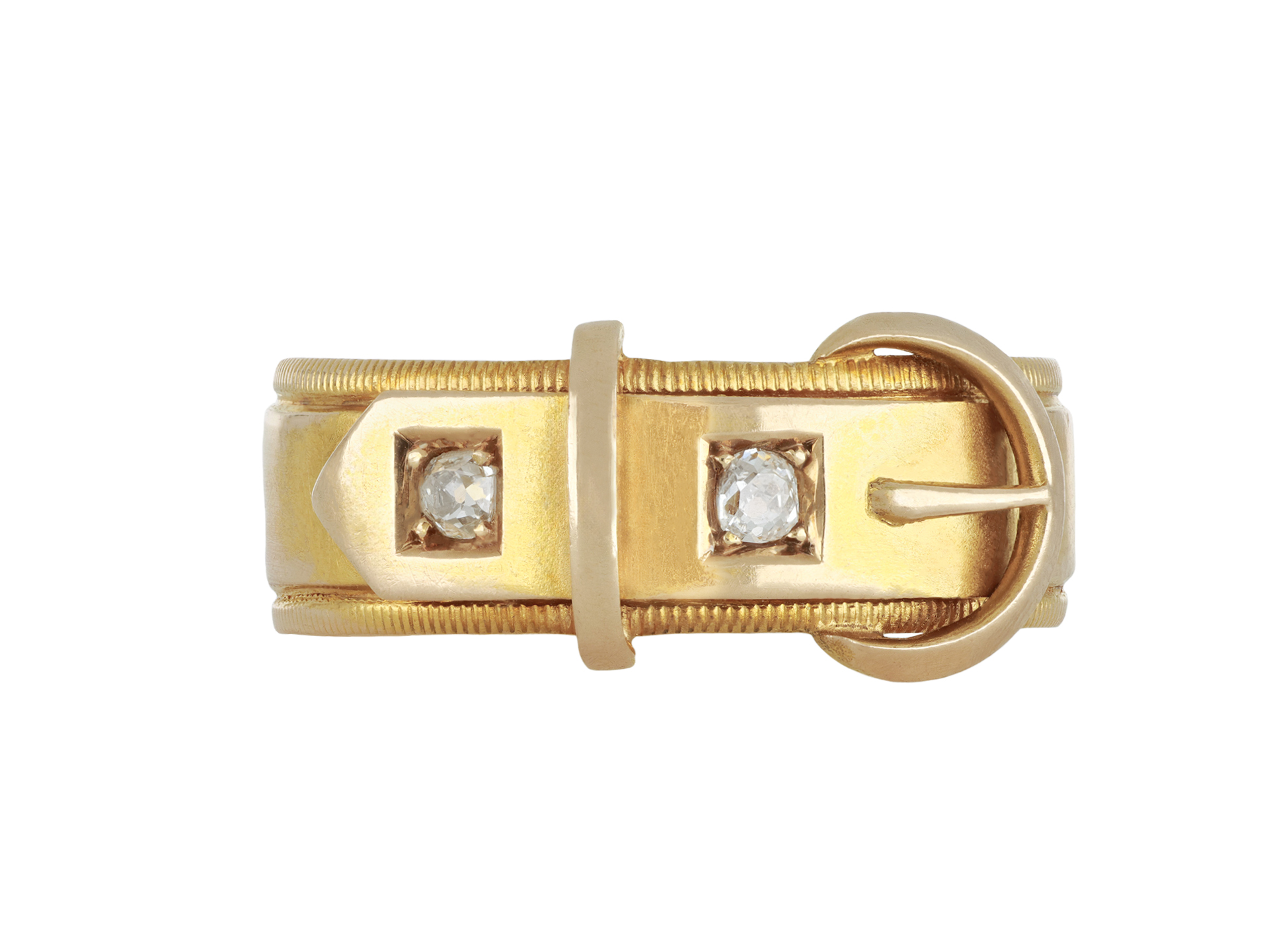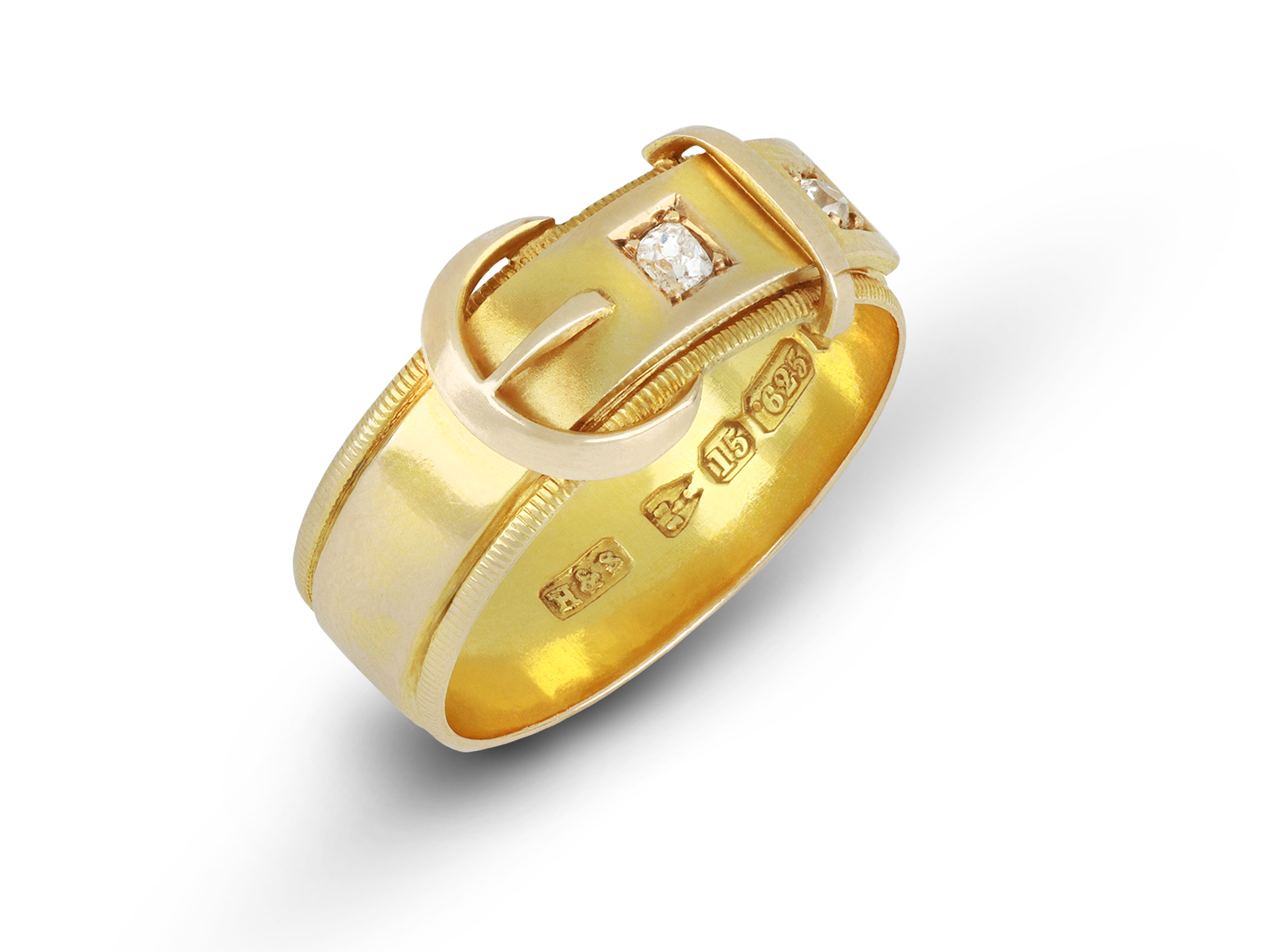 Diamond buckle ring. Set with two cushion shape old mine cut diamonds in open back grain settings with an approximate diamond weight of 0.08 carats, to a smooth conforming ring featuring a buckle design, millegrain edges and round open backholing, approximately 7mm in width. Marked 15 carat yellow gold, maker's mark 'H&S' for Henry Hyde & Sons, full hallmarks for Chester, English, 1882.