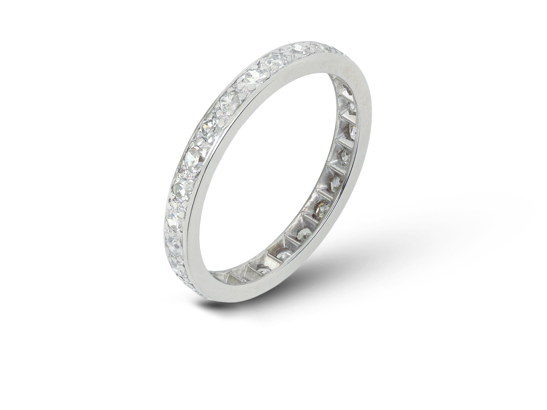 Diamond eternity ring, circa 1920. Set with twenty-six round eight cut diamonds in open back grain settings with a combined approximate weight of 0.50 carats, to a smoothly conforming full eternity ring featuring smooth polished edges and square open backholing, approximately 2.4mm in width. Tested platinum, circa 1920.
