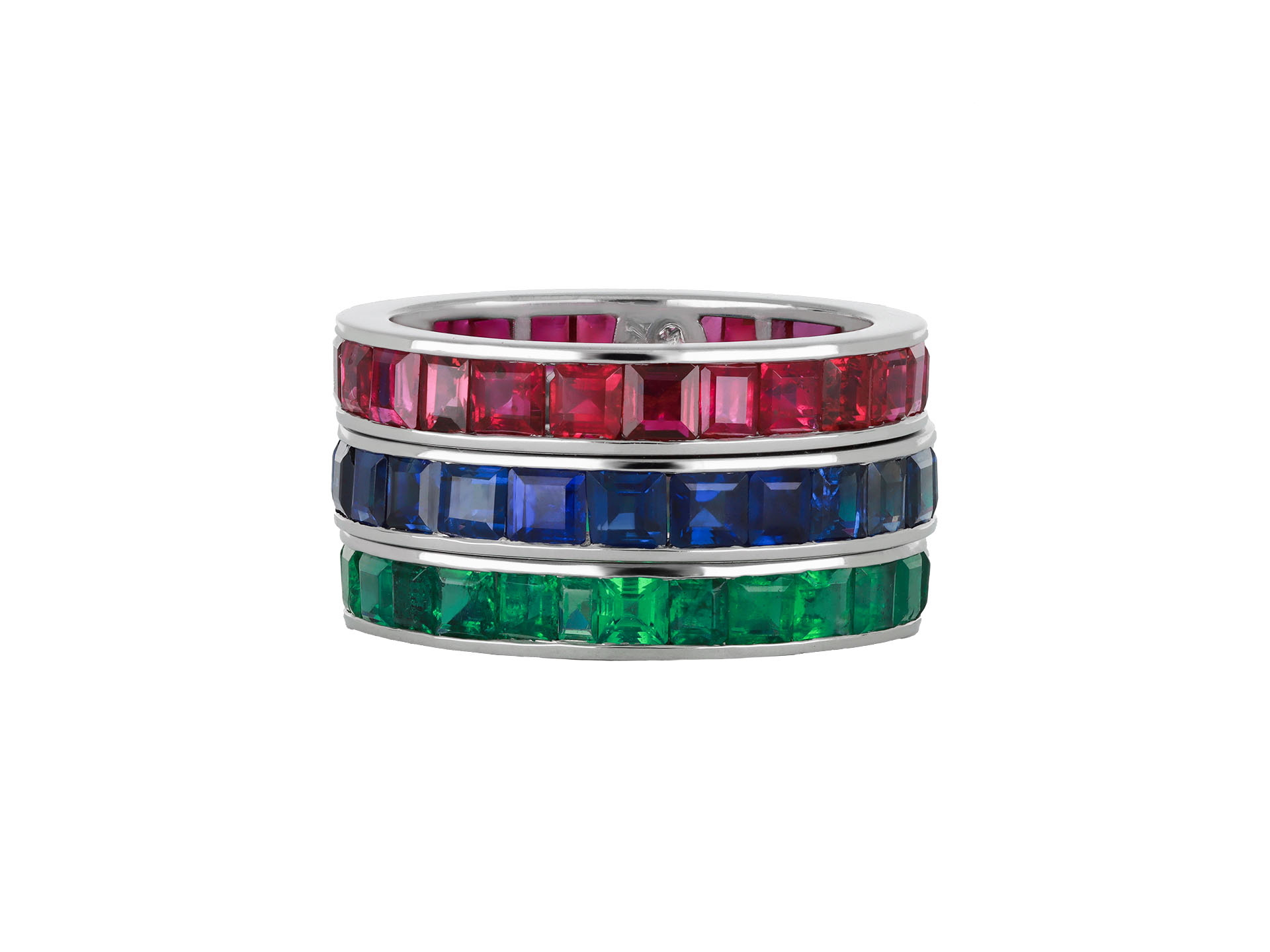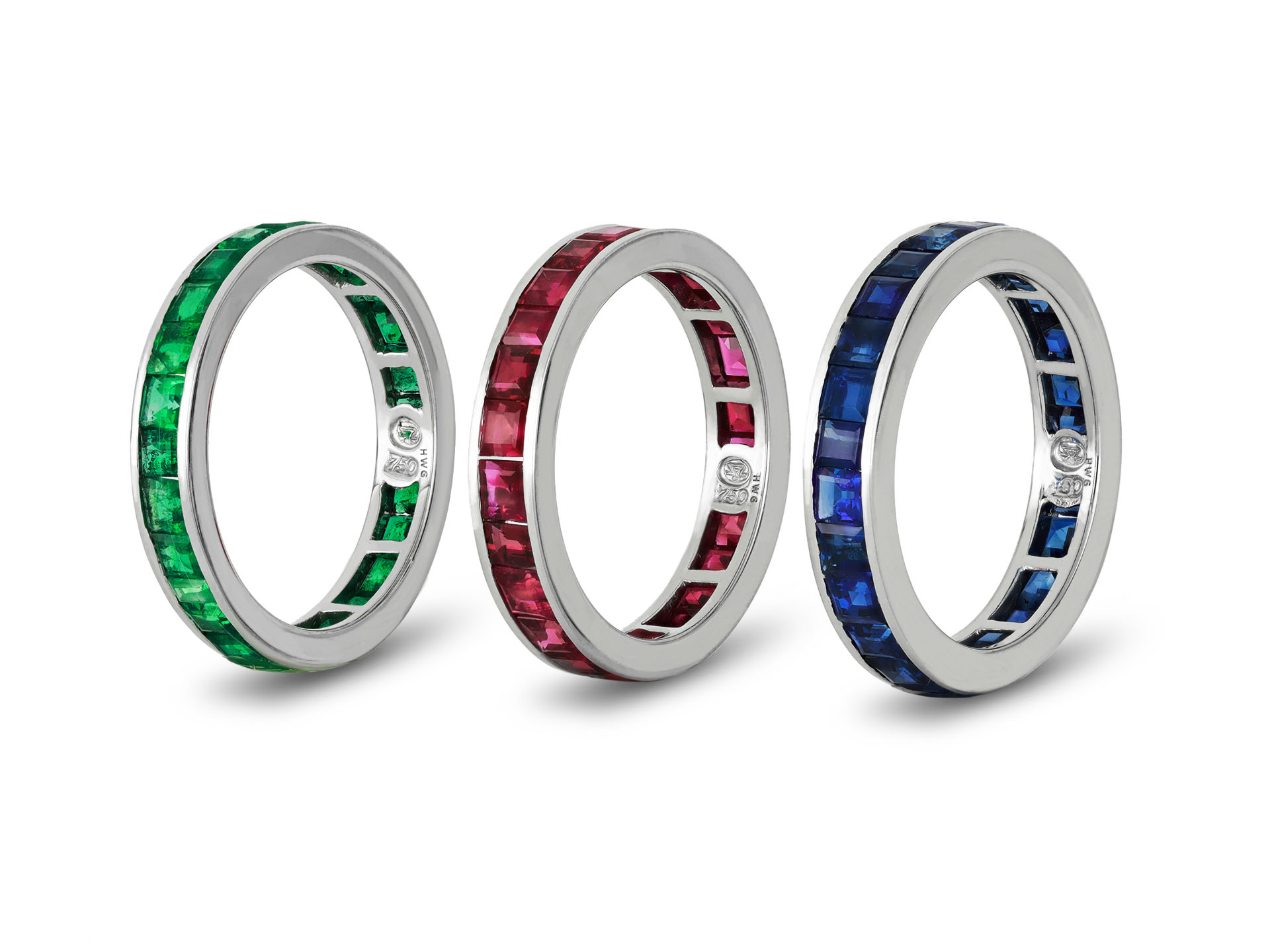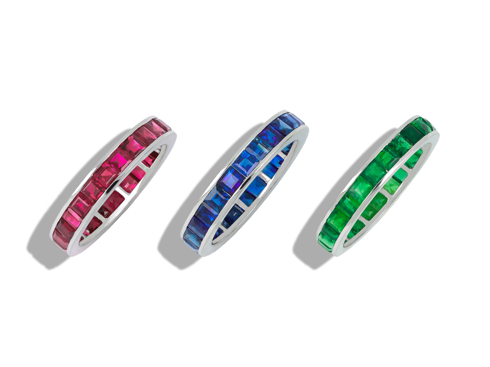 Gubelin sapphire, ruby and emerald eternity ring set. A set of three eternity rings, one featuring twenty-five square step cut natural unenhanced sapphires in open back channel settings with a combined approximate weight of 3.50 carats, the second featuring twenty-four square step cut natural unenhanced rubies in open back channel settings with a combined approximate weight of 2.90 carats, the third featuring twenty-five square step cut natural emeralds in open back channel settings with a combined approximate weight of 2.50 carats, all to geometric designs with polished edges, smooth galleries and rectangular open backholing, each approximately 3.6-3.8mm in width. Marked 18 carat white gold, marked 'HWG', maker's mark for Gubelin, circa 1950.