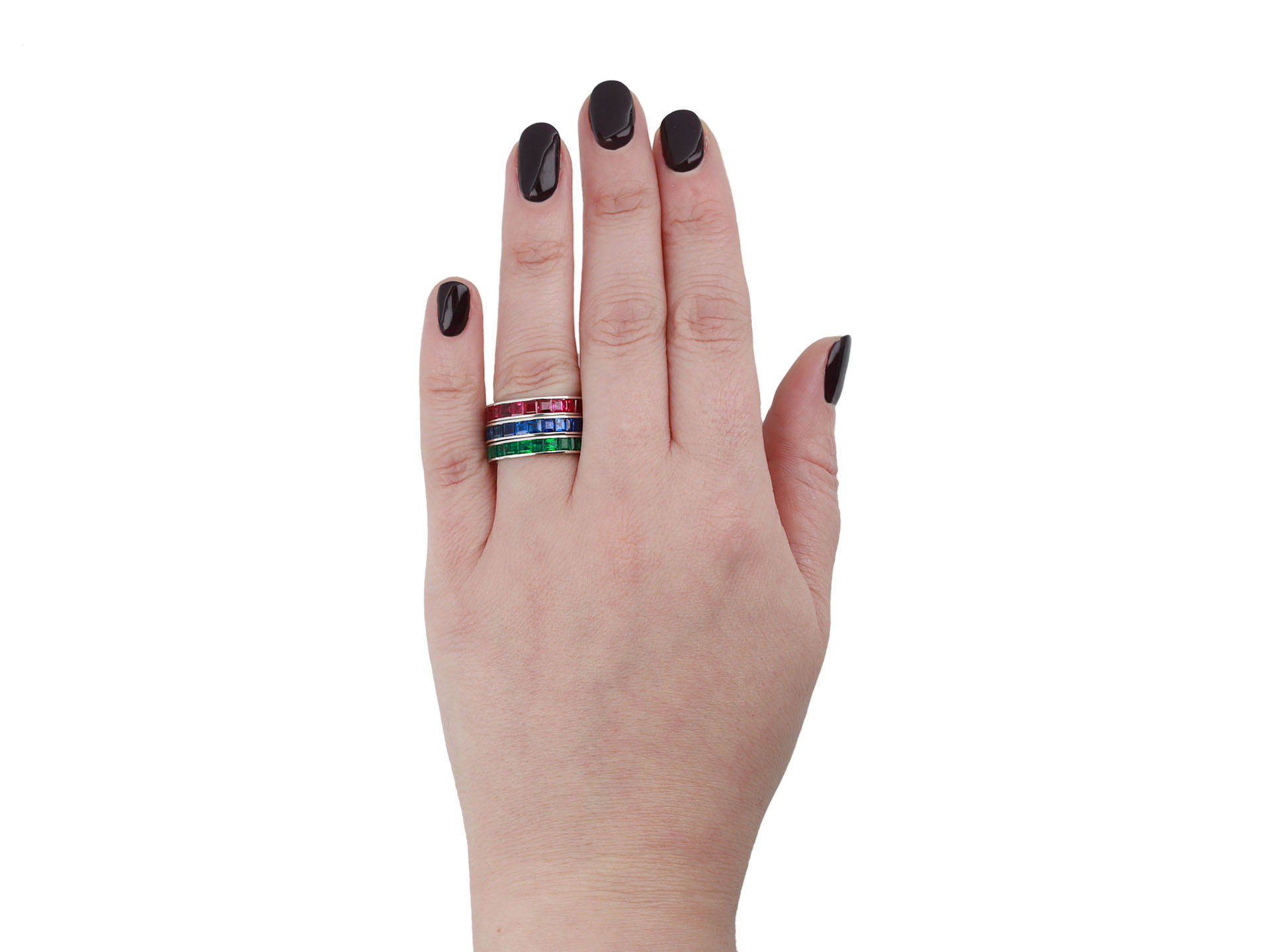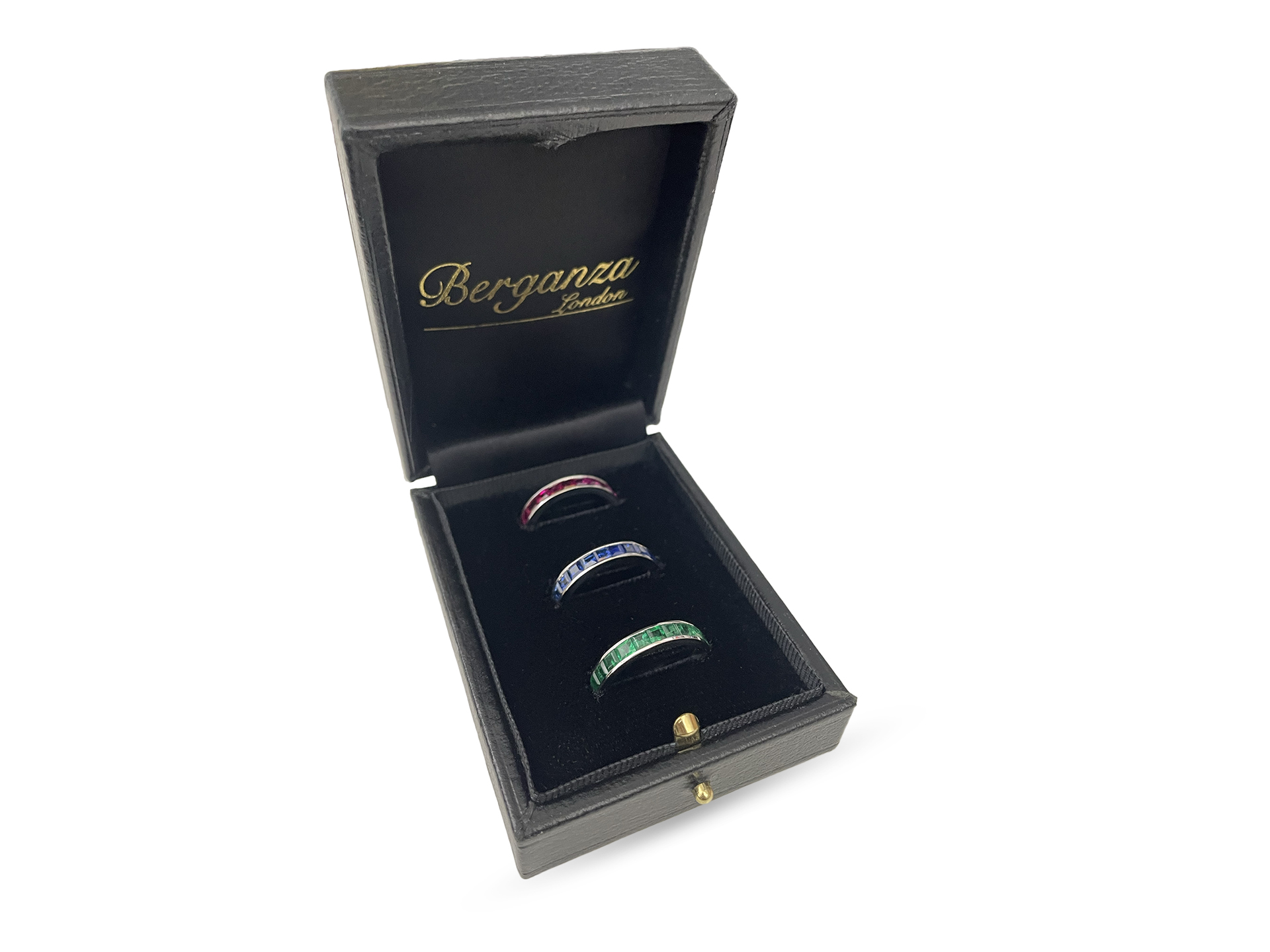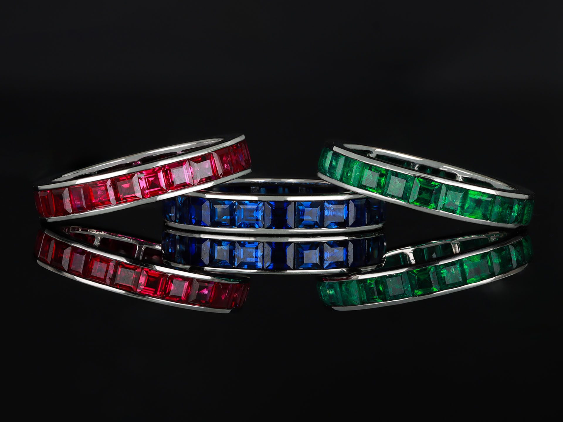 Gubelin sapphire, ruby and emerald eternity ring set. A set of three eternity rings, one featuring twenty-five square step cut natural unenhanced sapphires in open back channel settings with a combined approximate weight of 3.50 carats, the second featuring twenty-four square step cut natural unenhanced rubies in open back channel settings with a combined approximate weight of 2.90 carats, the third featuring twenty-five square step cut natural emeralds in open back channel settings with a combined approximate weight of 2.50 carats, all to geometric designs with polished edges, smooth galleries and rectangular open backholing, each approximately 3.6-3.8mm in width. Marked 18 carat white gold, marked 'HWG', maker's mark for Gubelin, circa 1950.