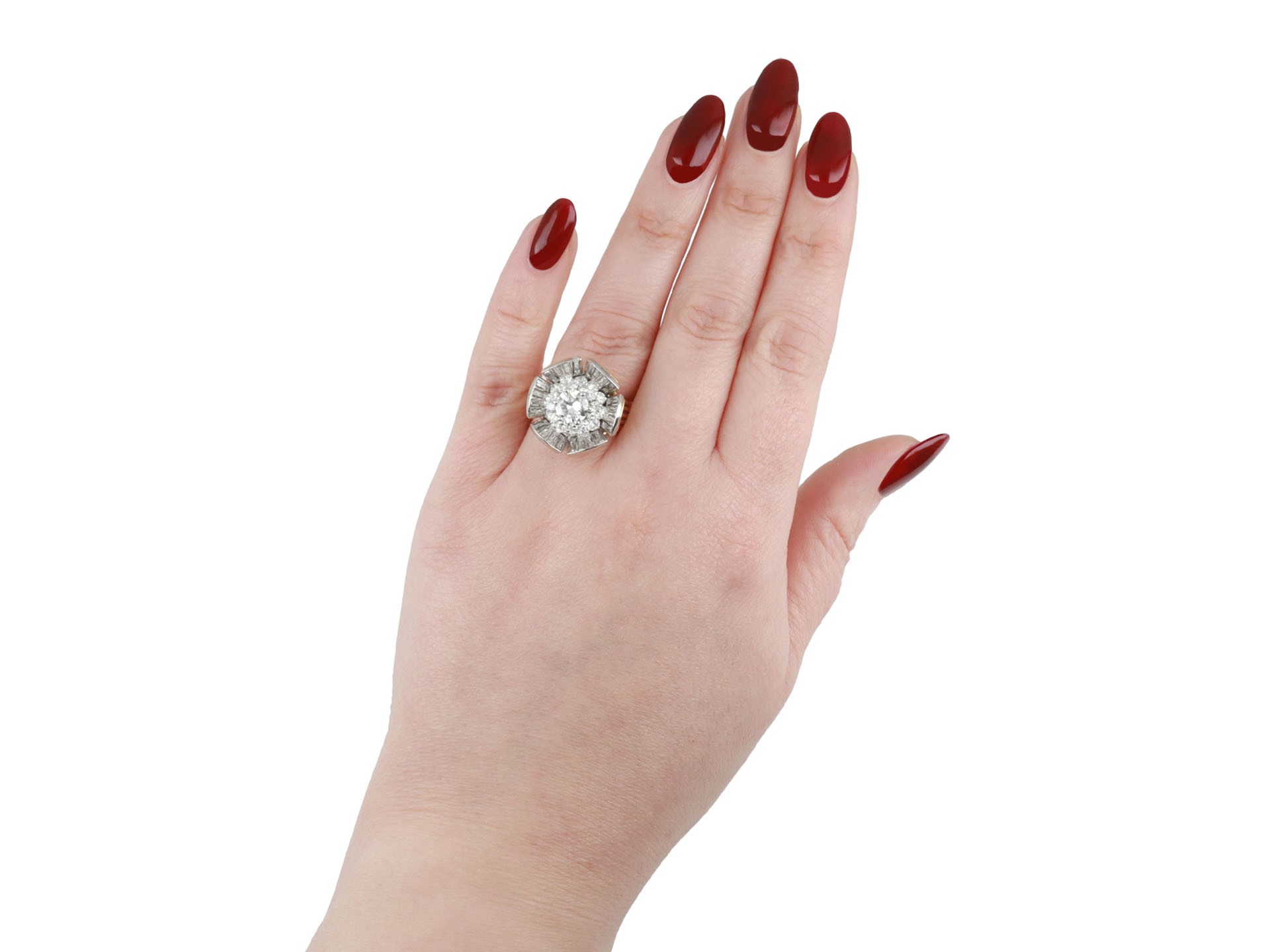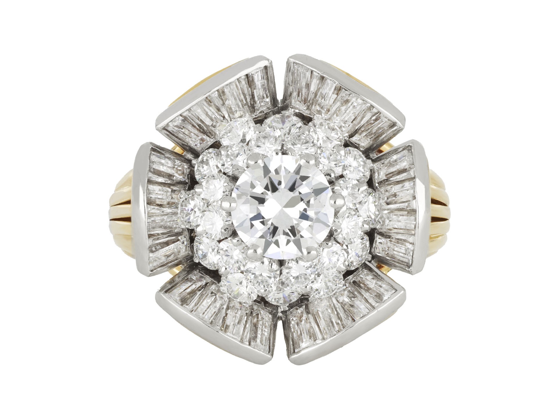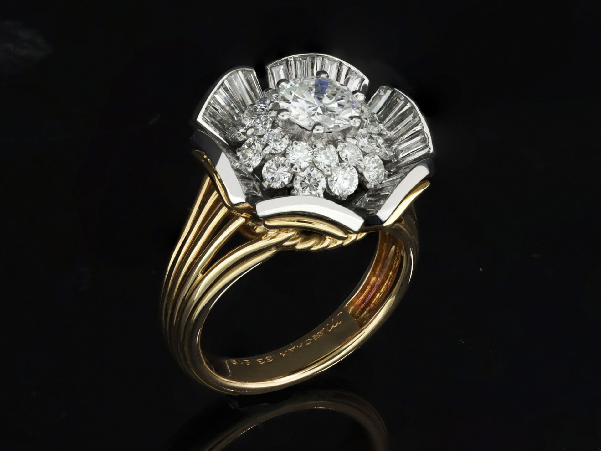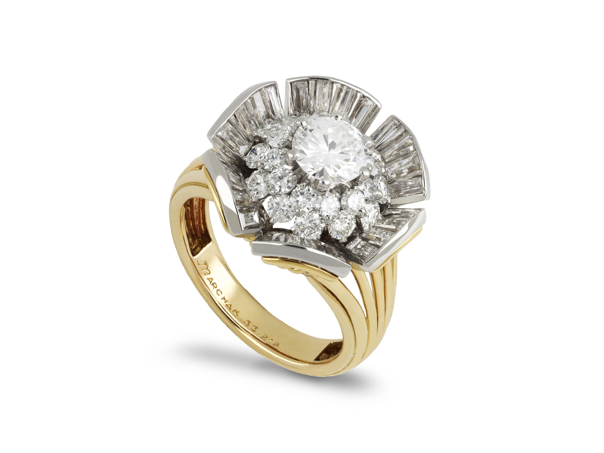 Marchak diamond cocktail ring. Set to centre with a round brilliant cut diamond in an open back claw setting with an approximate weight of 1.14 carats, encircled by twenty-four round brilliant cut diamonds in open back claw settings with a combined weight of 1.32 carats, surrounded further by twenty rectangular baguette cut diamonds in open back rubover settings with a combined weight of 1.80 carats. The total approximate diamond weight is 4.26 carats, to an impressive stylised floral cocktail ring featuring polished edges, a geometric openwork gallery and fancy open backholing, leading to split shoulders which follow through to a solid D-shape shank. Marked 18 carat yellow gold and platinum, numbered '33.219', makers mark 'FG', signed Marchak, French, circa 1950.