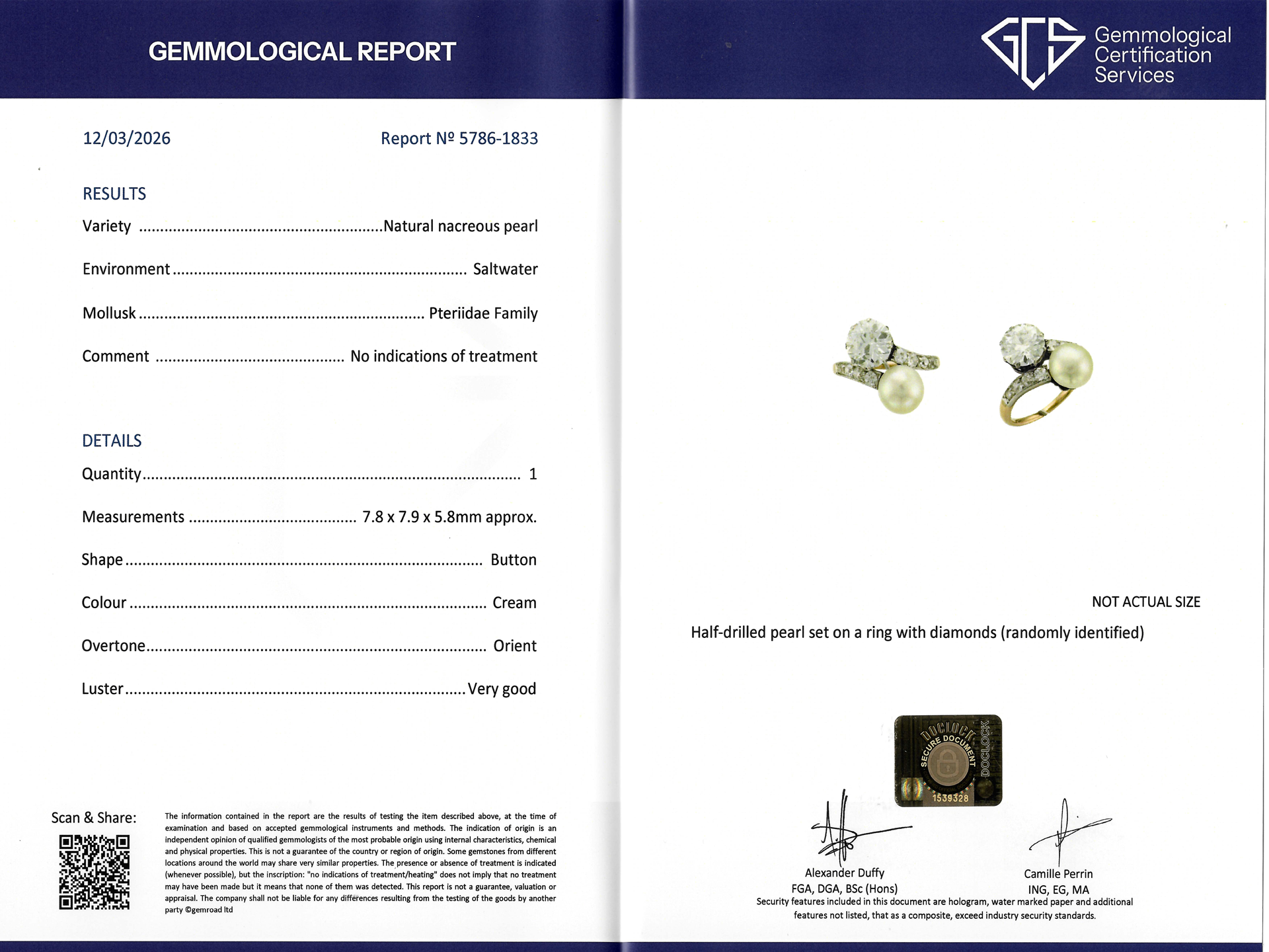 Natural pearl and diamond crossover ring. Set with one natural saltwater pearl measuring approximately 7.8 x 7.9 x 5.8mm in a half drilled setting, further set with one round old cut diamond, J colour, SI1 clarity with a weight of 1.74 carats in open back claw settings, interspersed by eight cushion shape old mine diamonds in open back grain settings with an approximate weight of 0.40 carats. The total approximate diamond weight is 1.14 carats to an elegant crossover design featuring polishged edges, a intricately pierced gallery, and geometric open backholing, flanked by sinuous shoulders and flowing through to a solid D-shape shank. Tested rose gold and platinum, indistinct maker's mark, engraved '553', accompanied by Gemological Institute of America report #6233531260 and Gemmology Certification Services report #5786-1833, circa 1910.