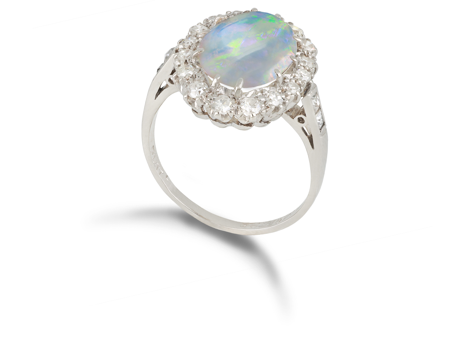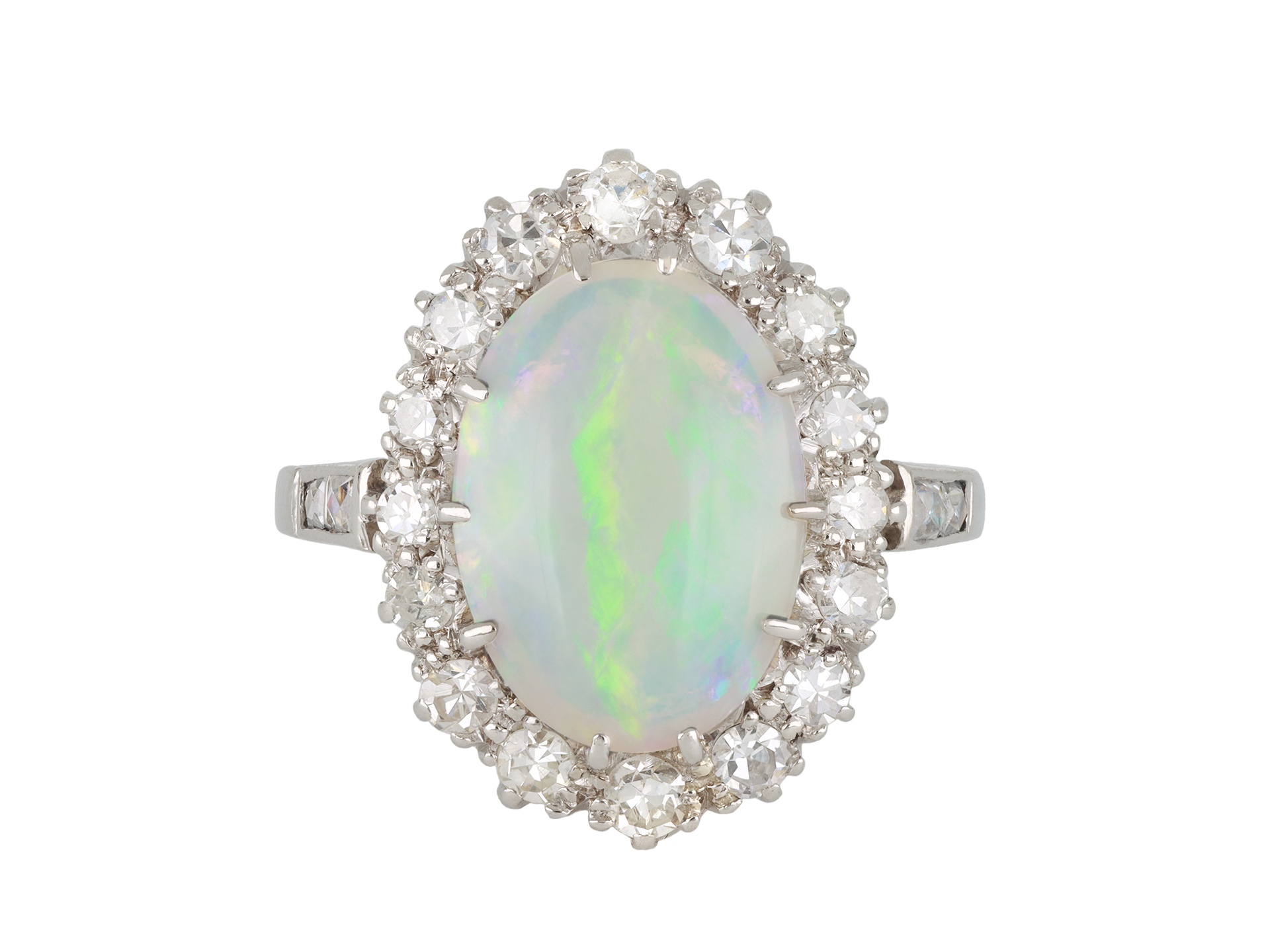 Opal and diamond cluster ring. Set to centre with an oval cabochon natural opal in an open back claw setting, with an approximate weight of 2.30 carats, encircled by sixteen round single cut diamonds in open back grain and claw settings with a combined approximate weight of 0.75 carats, further flanked by four square french cut diamonds in open back rubover settings with a weight of 0.20 carats. The combined approximate diamond weight is 0.95 carats, to an elegant coronet cluster design featuring curving claws, a decorative open gallery and open backholing, the shoulders feature chenier details and flow through to a solid D-shape shank. Marked platinum, engraved 'F.E.P - M.Mc.L', circa 1920.