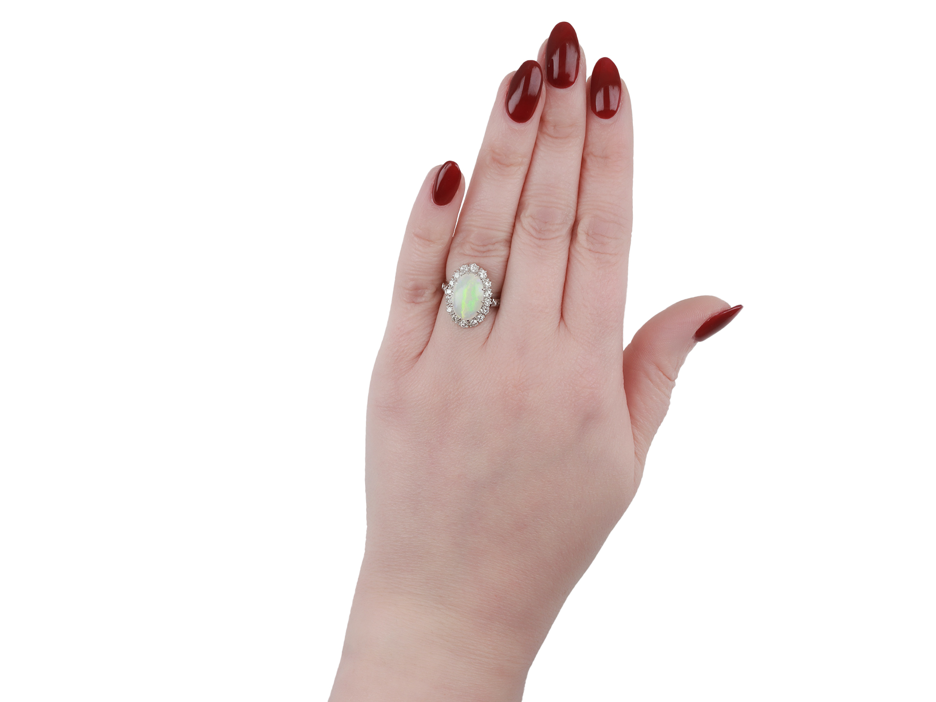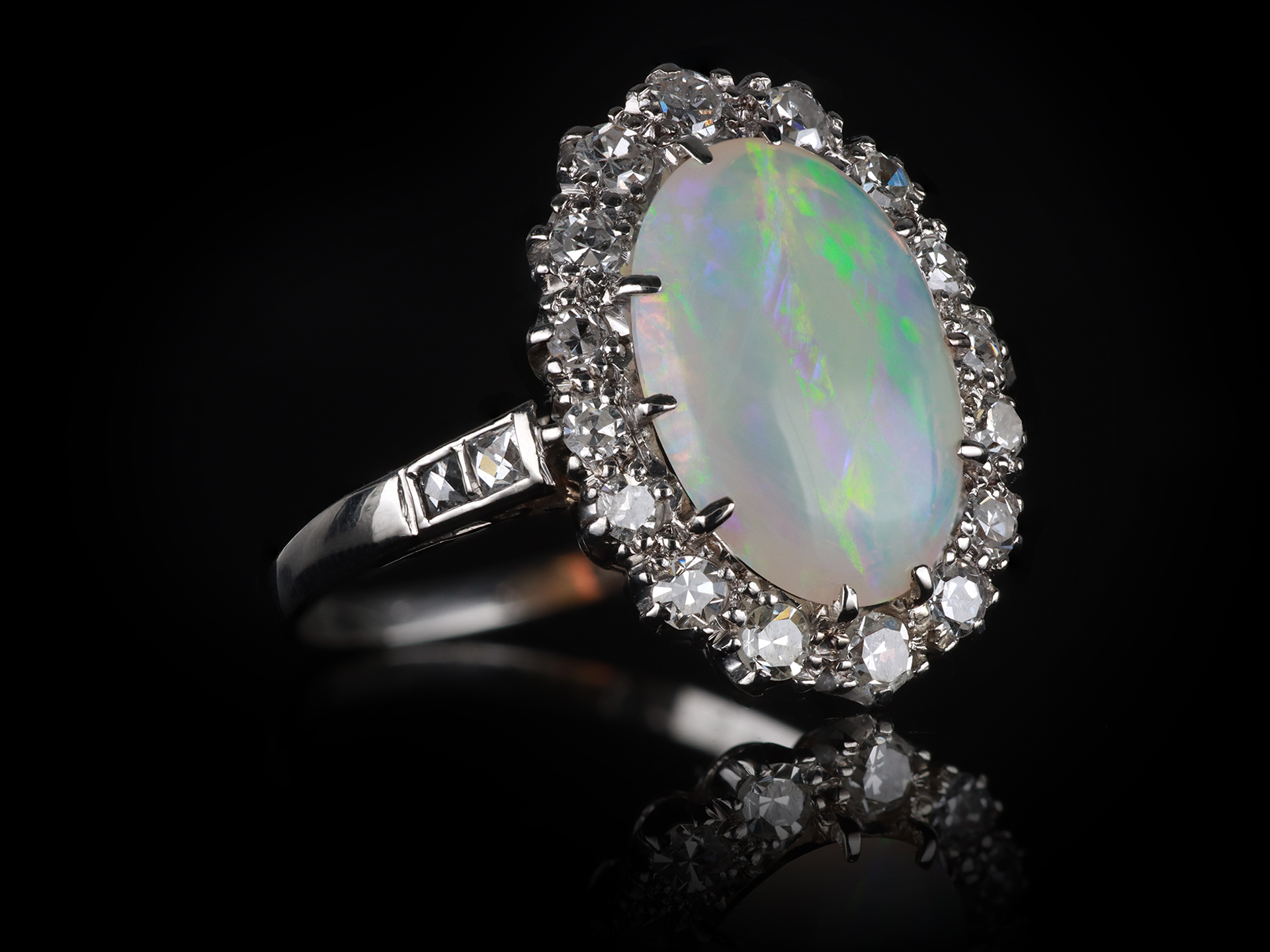 Gemstone Opal, Cabochon, approximately 2.3ct 16 x Diamonds, Eight Cut, approximately 0.75ct total 4 x Diamonds, French Cut, approximately 0.2ct total