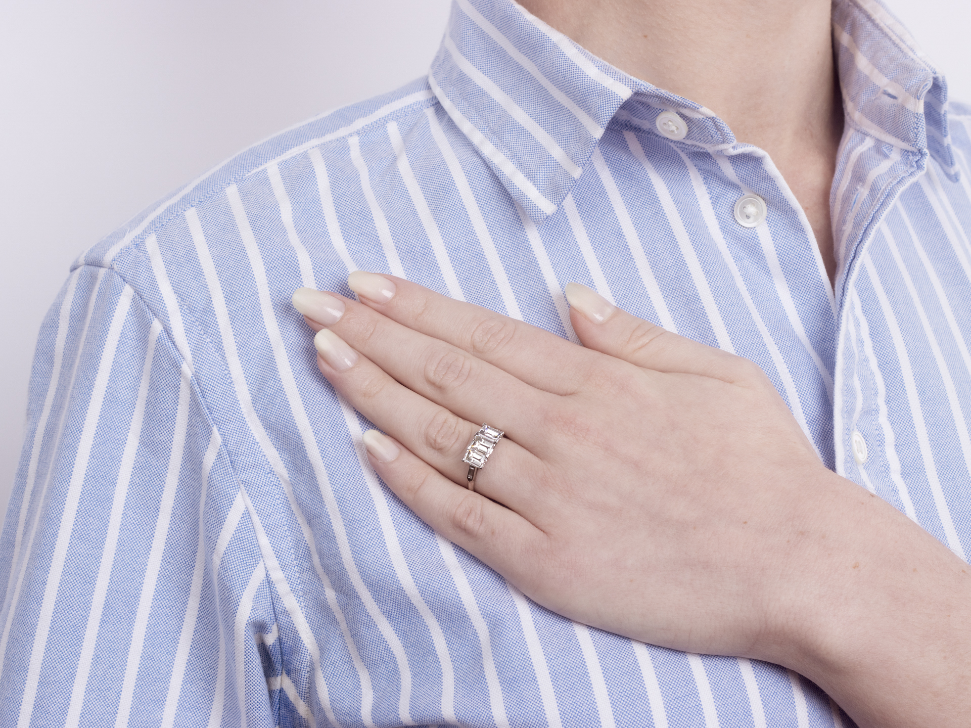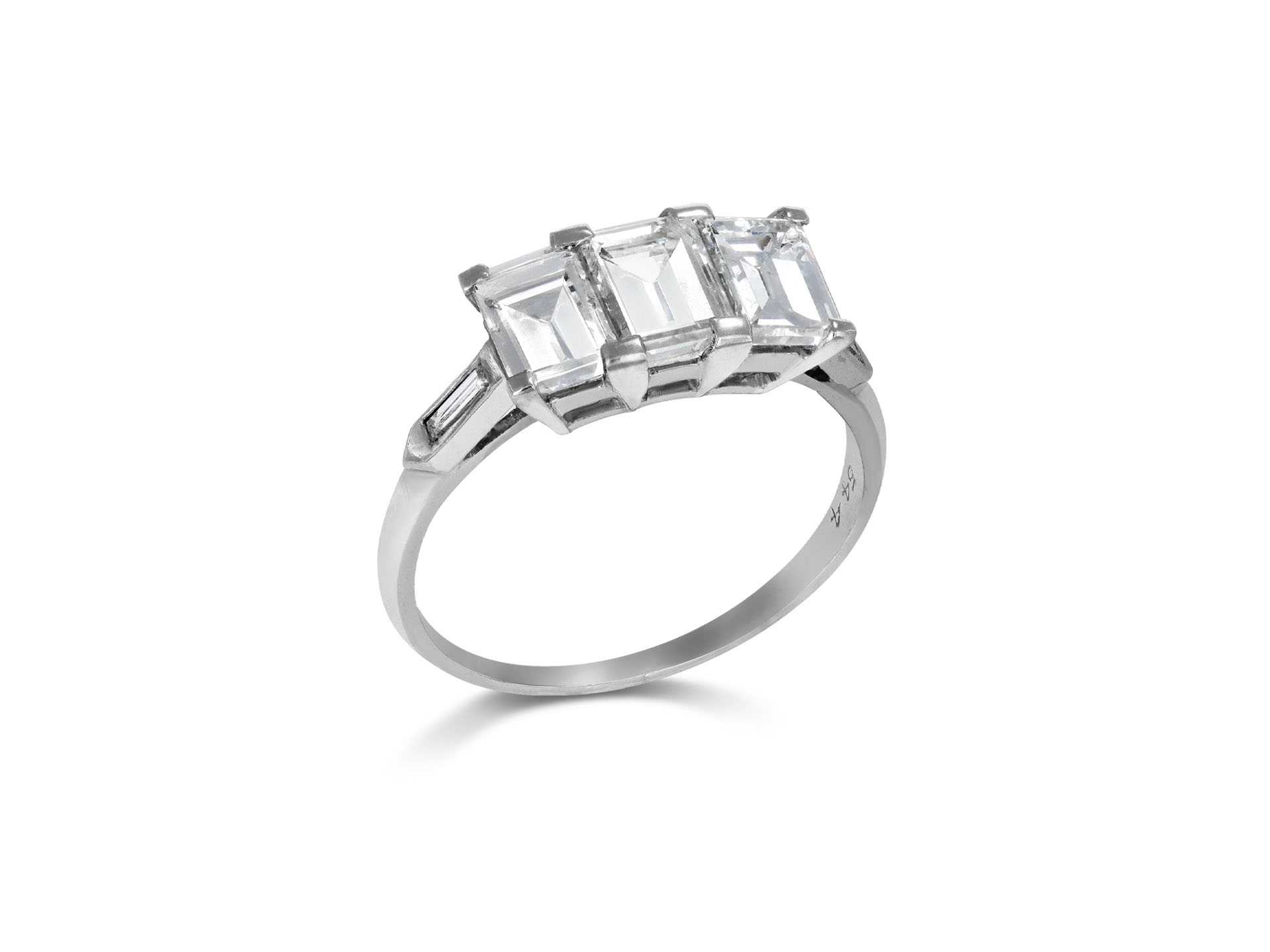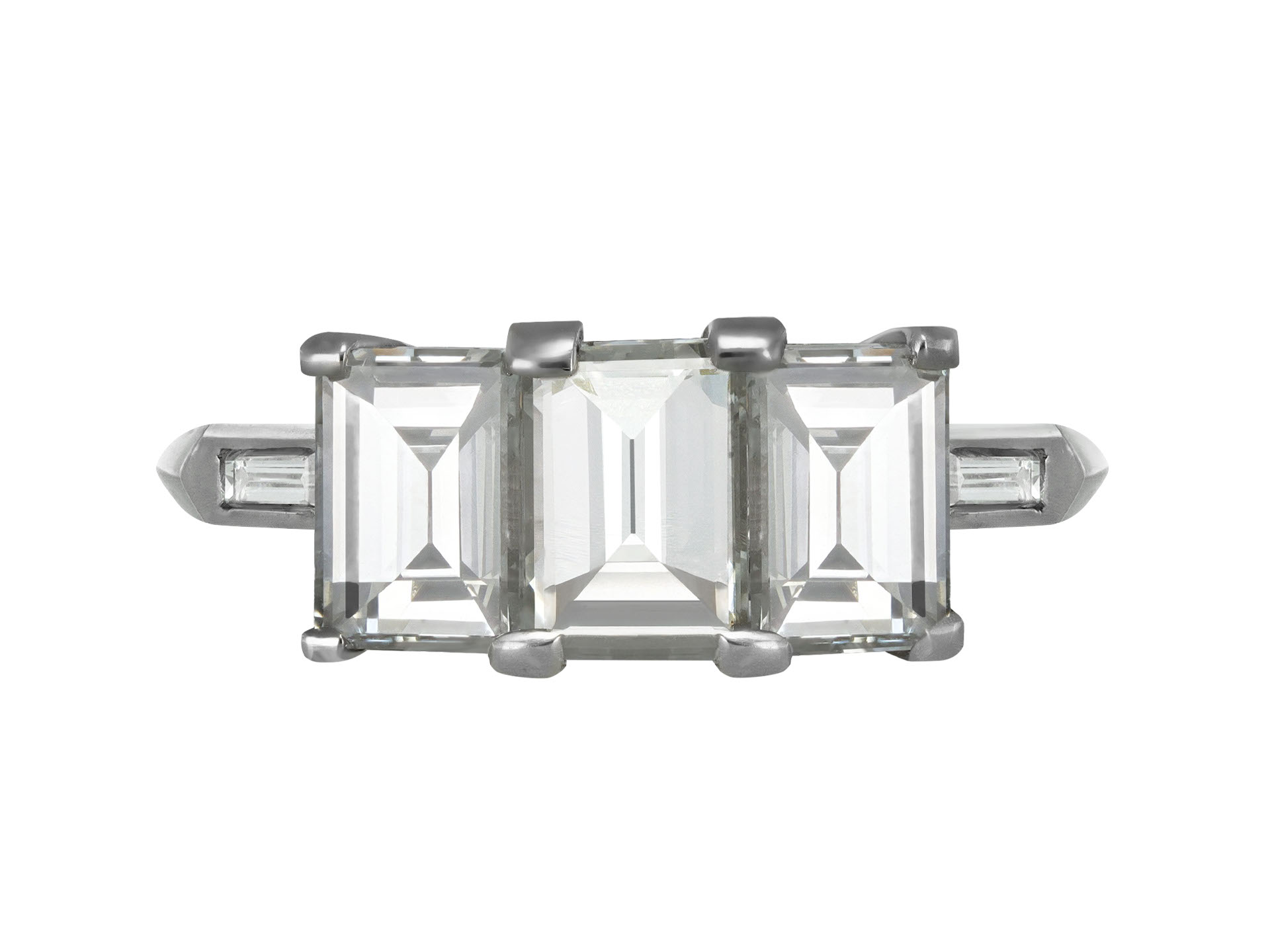 Oscar Heyman Three stone diamond ring. Set to center with a rectangular step-cut diamond in an open back claw setting with an approximate weight of 0.90 carats, flanked with two rectangular step cut diamonds in open back claw settings with a combined weight of 1.50 carats and decorated with two baguette cut diamonds in rubbover settings with a combined weight of 0.10 carats. The total approximate diamond weight is 2.50 carats, to a striking three stone design featuring geometric corner claws, a structurally pierced gallery and square open backholing flowing through to a solid D-shape shank. Marked "10% irid plat", circa 1930.