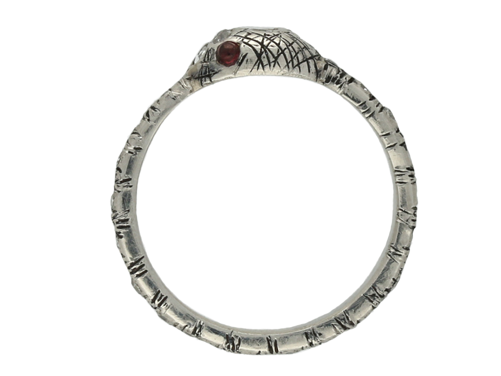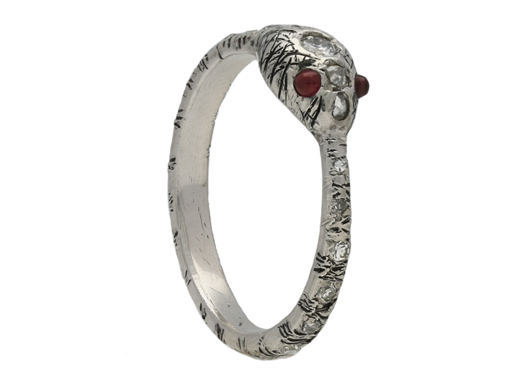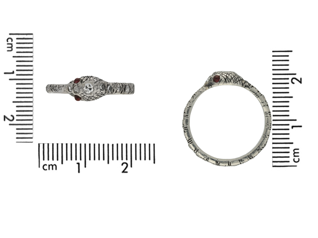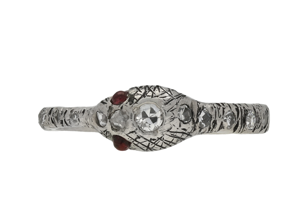 Vintage diamond and ruby snake eternity ring. Set to the centre of the head with one round old cut diamond in a closed back rubover setting with an approximate weight of 0.07 carats, further set with two round rose cut diamonds in closed back rubover settings with a combined weight of 0.05 carats, further adorned with nineteen round eight cut diamonds in closed back rubover settings with a combined weight of 0.19 carats. The total approximate diamond weight is 0.31 carats, to an eternity ring in the form of a snake with round cabochon natural and unenhanced ruby eyes, intricate engraved detailing around the circumference with a tapering band and polished closed back. Tested platinum, circa 1950. Snakes are one of the earliest motifs used in jewellery and throughout history were thought to represent the unending circle of life and everlasting love.