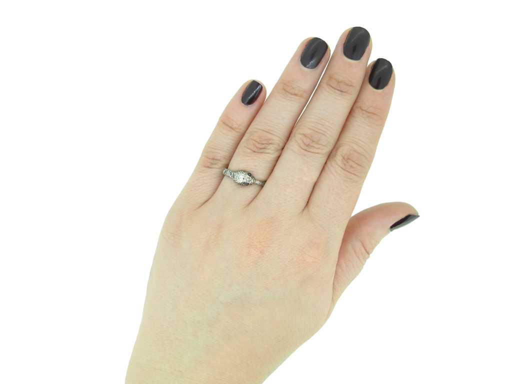 Vintage diamond and ruby snake eternity ring. Set to the centre of the head with one round old cut diamond in a closed back rubover setting with an approximate weight of 0.07 carats, further set with two round rose cut diamonds in closed back rubover settings with a combined weight of 0.05 carats, further adorned with nineteen round eight cut diamonds in closed back rubover settings with a combined weight of 0.19 carats. The total approximate diamond weight is 0.31 carats, to an eternity ring in the form of a snake with round cabochon natural and unenhanced ruby eyes, intricate engraved detailing around the circumference with a tapering band and polished closed back. Tested platinum, circa 1950.