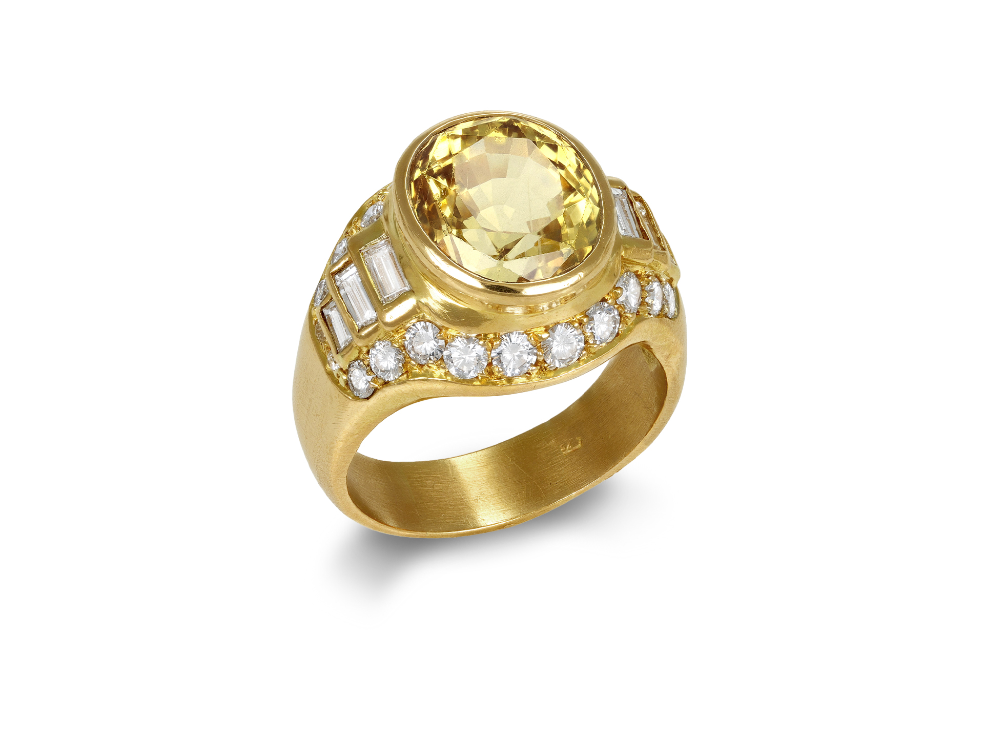 Yellow Ceylon sapphire and diamond cluster ring. Set to centre with one oval mixed cut natural no heat Yellow Ceylon sapphire in an open back rubover setting with a weight of 9.00 carats, flanked to either side with six rectangular step cut diamonds in open back rubover settings with a combined approximate weight of 0.55 carats, further adorned by twenty-four round brilliant cut diamonds in open back grain settings with a combined weight of 1.30 carats. The total approximate diamond weight is 1.85 carats to an impressive cluster design with polished edges, a smooth gallery, and fancy shape open back holing, the broad integrated shoulders tapering through to a solid D-shape shank. Tested yellow gold, circa 1970, accompanied by The Gem & Pearl Laboratory report #27028.