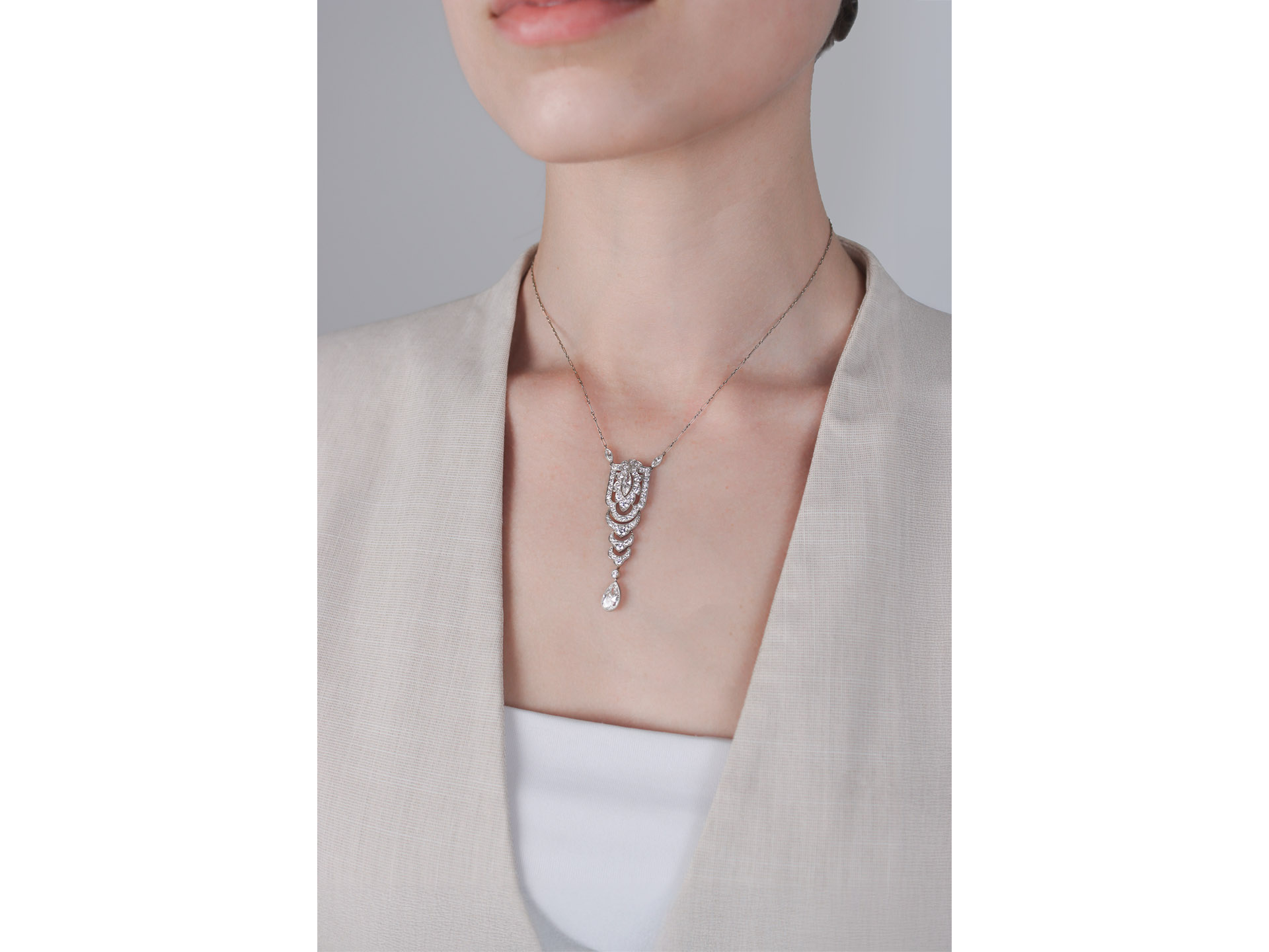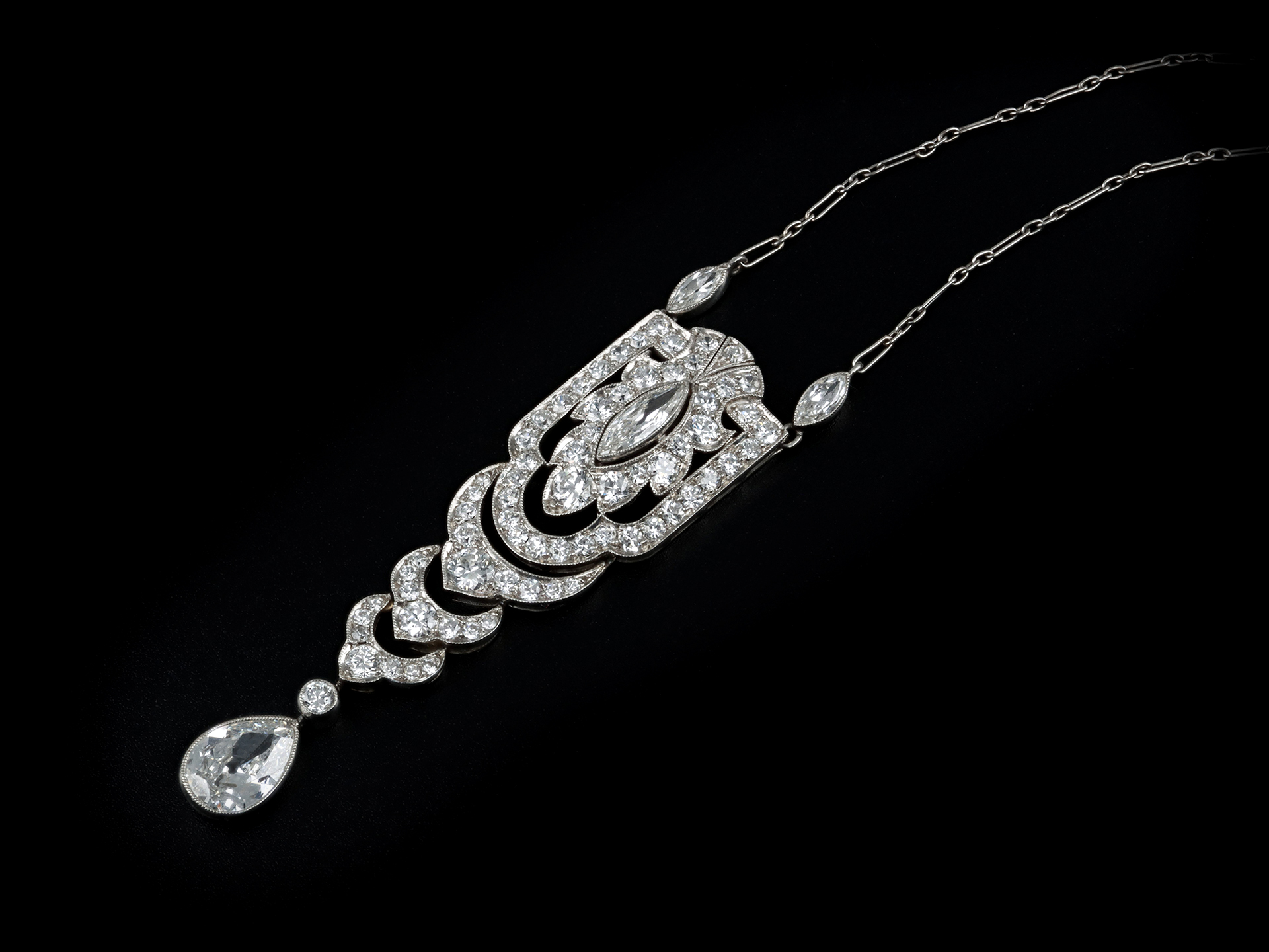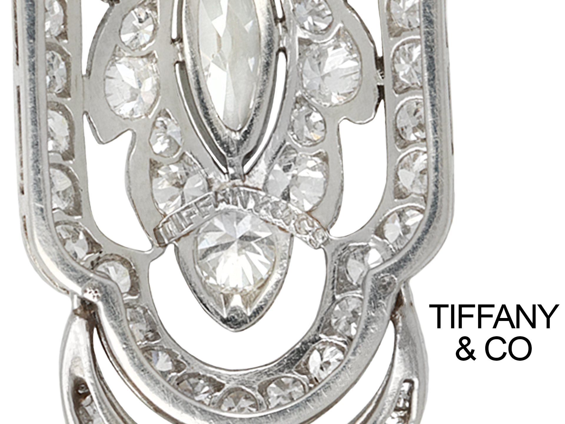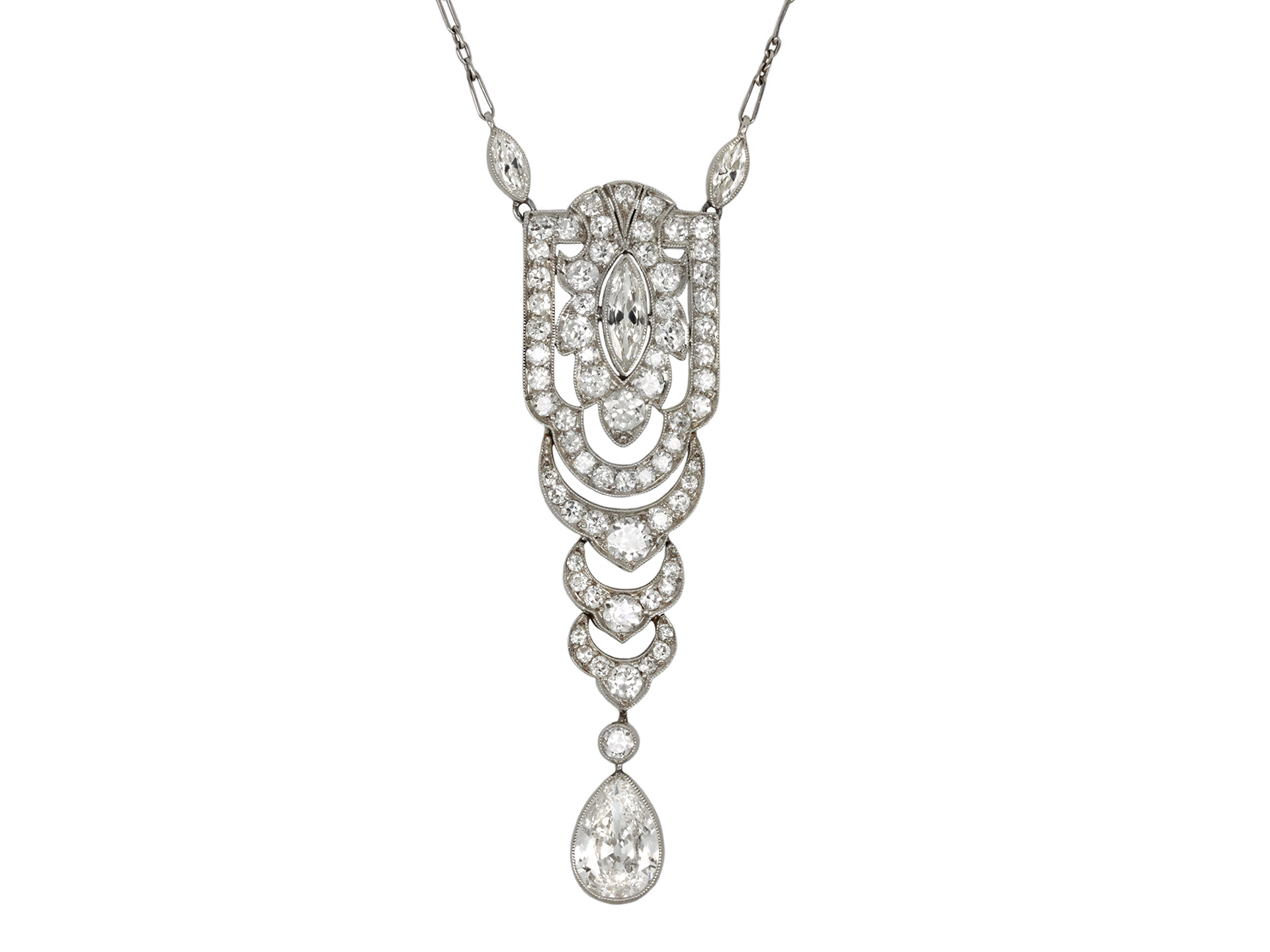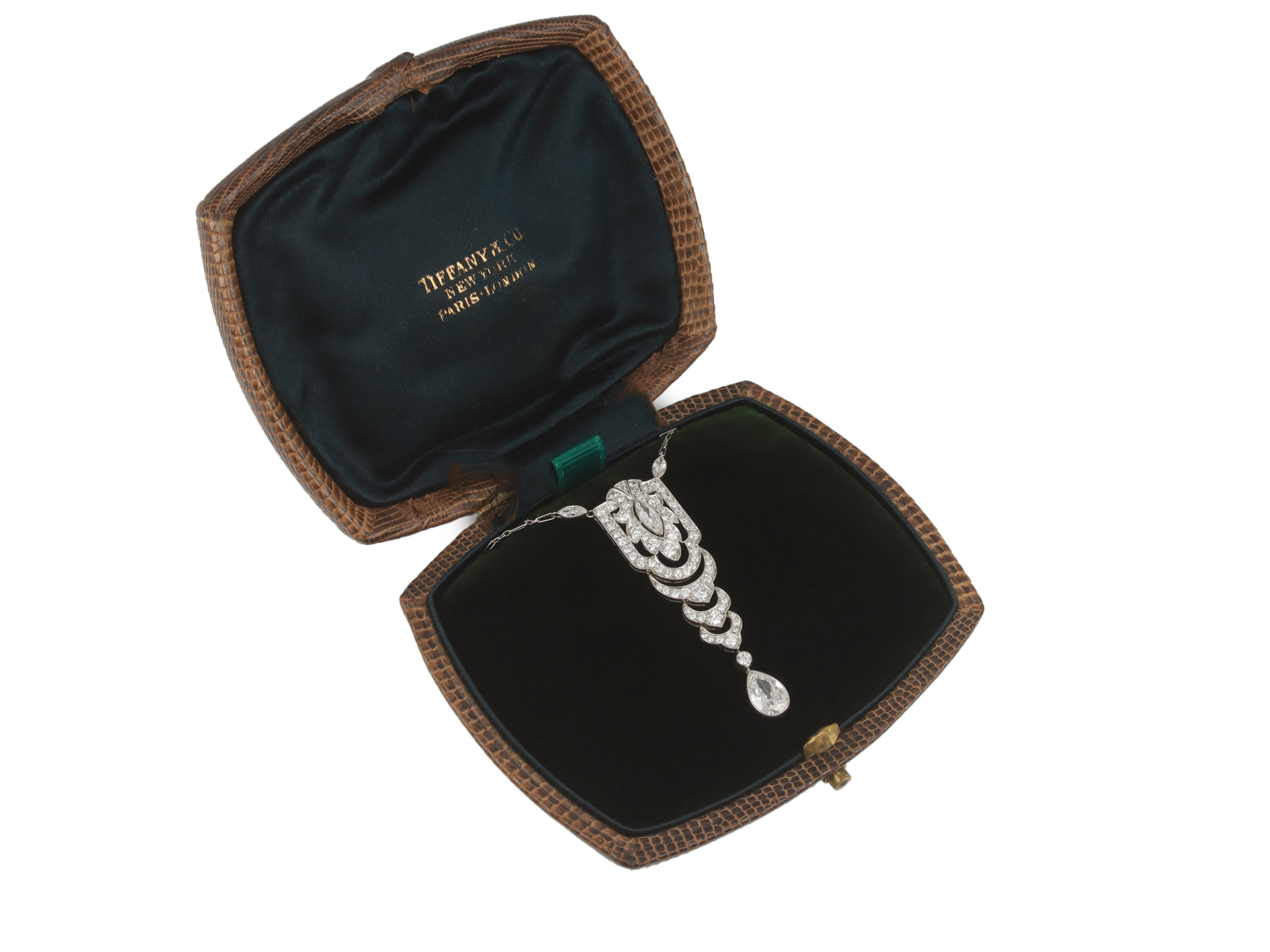 Tiffany & Co. diamond necklace. Set with a drop shape old cut diamond in an open back rubover setting with an approximate weight of 1.10 carats, further set with a marquise shape old cut diamond in an open back rubover setting with a weight of 0.20 carats, suspended from two marquise shape old cut diamonds in open back rubover settings with a combined weight of 0.20 carats, beautifully adorned by sixty-nine round old cut diamonds with a weight of 1.75 carats. The combined approximate diamond weight comes to 3.25 carats to an impressive and elegantly articulated necklace with millegrain borders, intricate open work, fancy open back holing and a pierced gallery, fitted to top with a fine fancy link chain with a secure C-clasp, pendent approximate 5m in length, chain approximately 16" in length. Pendant and chain tested platinum and iridium, signed Tiffany & Co., American, circa 1920, accompanied by Tiffany box.