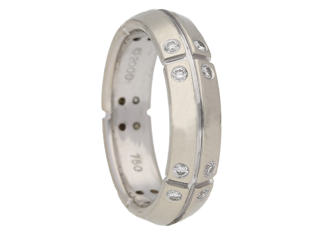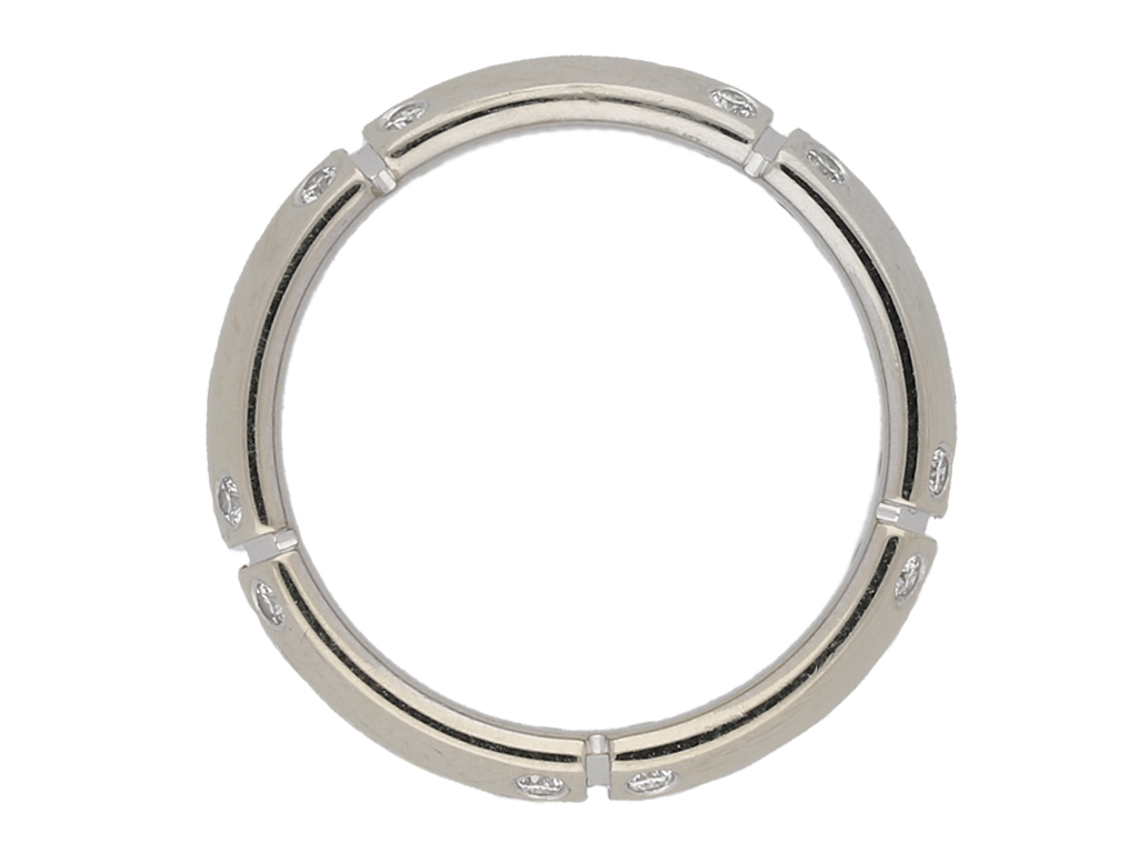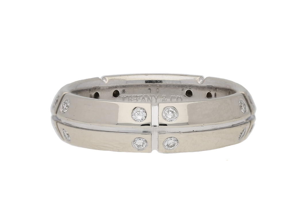 Tiffany & Co. Streamerica ring. Set with twenty round brilliant cut diamonds in open back rubover gypsy settings with an approximate combined weight of 0.40 carats, to a solid D-shaped band enhanced by a central horizontal ridge and several vertical ridges, with circular pierced backholing, approximately 4.5mm in width. Marked 18 carat white gold, approximately 6.48 gramsn in weight, signed 'TIFFANY & CO.', American, circa 2000.
