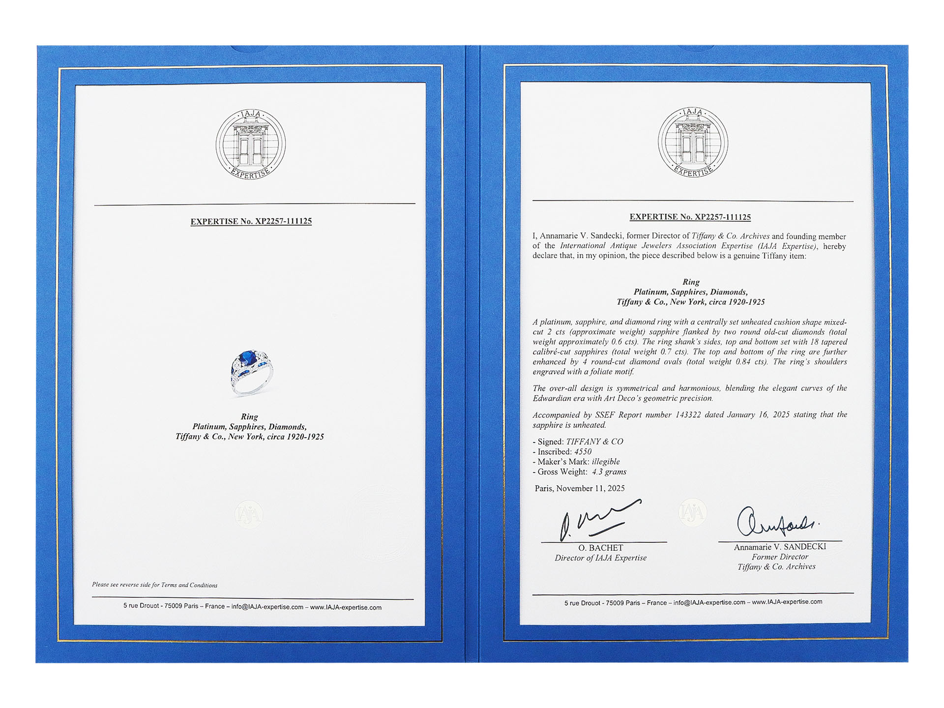 Art Deco Tiffany & Co. sapphire and diamond cluster ring. Set to centre with a cushion shape mixed cut natural no heat sapphire in an open back claw setting with an approximate weight of 2.00 carats, flanked by two round old cut diamonds in open back claw settings with a combined approximate weight of 0.60 carats, further set with eighteen tapered calibre cut sapphires in open back channel settings with a combined weight of 0.70 carats, and further enhanced by eighty-four round eight-cut diamonds in open back grain settings with a combined weight of 0.84 carats. The total approximate sapphire weight is 2.70 carats and the total approximate diamond weight is 1.44 carats, all to an ornate cluster design featuring intricate openwork with millegrain edging, a decorative gallery and finely pierced open backholing, leading to engraved foliate shoulders and terminating in a solid D-shape shank. Tested platinum, lightly engraved '4550', signed 'Tiffany & Co', circa 1925, accompanied by SSEF report #143322, IAJA Expertise report #XP2257-111125 and a Tiffany & Co. box.