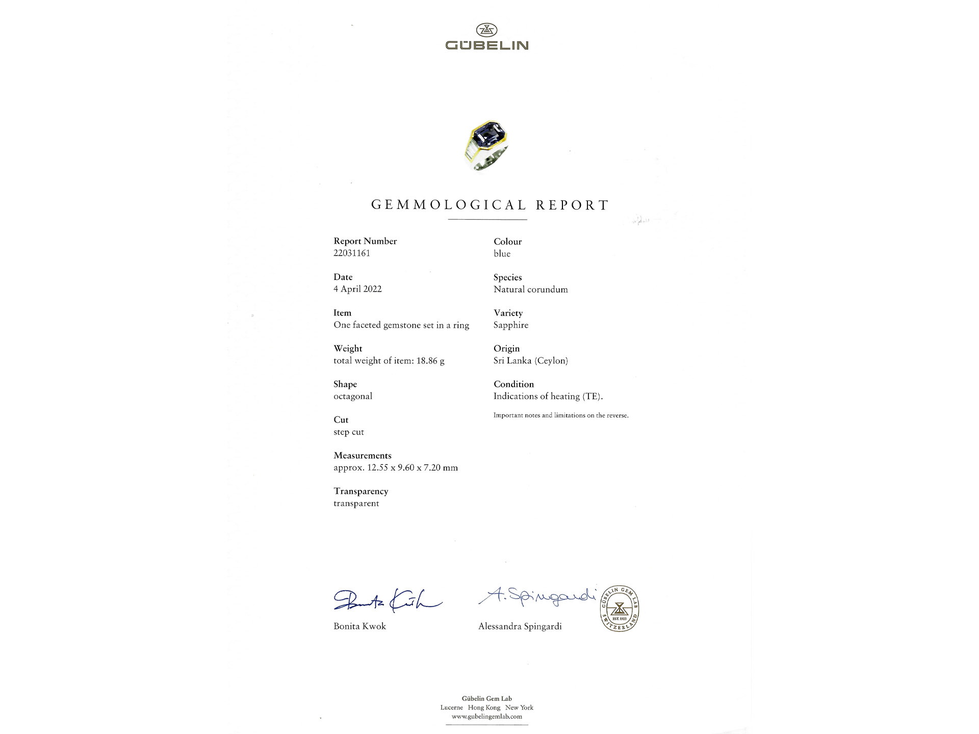 Bulgari Ceylon sapphire and diamond trombino ring. Set to centre horizontally with an octagonal emerald cut natural Ceylon sapphire in an open back rubover setting with a weight of 9.65 carats, flanked by ten graduating rectangular baguette cut diamonds in open back channel settings with a combined approximate weight of 1.35 carats, to an impressive trombino design featuring yellow gold polished borders, a smooth gallery and fancy open back holing, flanked by heavy shoulders tapering down to a solid flat shaped shank. Marked platinum and 18 carat yellow gold, numbered 'CM 9.65', signed 'BVLGARI', assay mark for Rome, Italian, French import marks, circa 1970s, accompanied by Gubelin report #22031161 and letter of authentication from Bulgari Specialist Amanda Triossi.