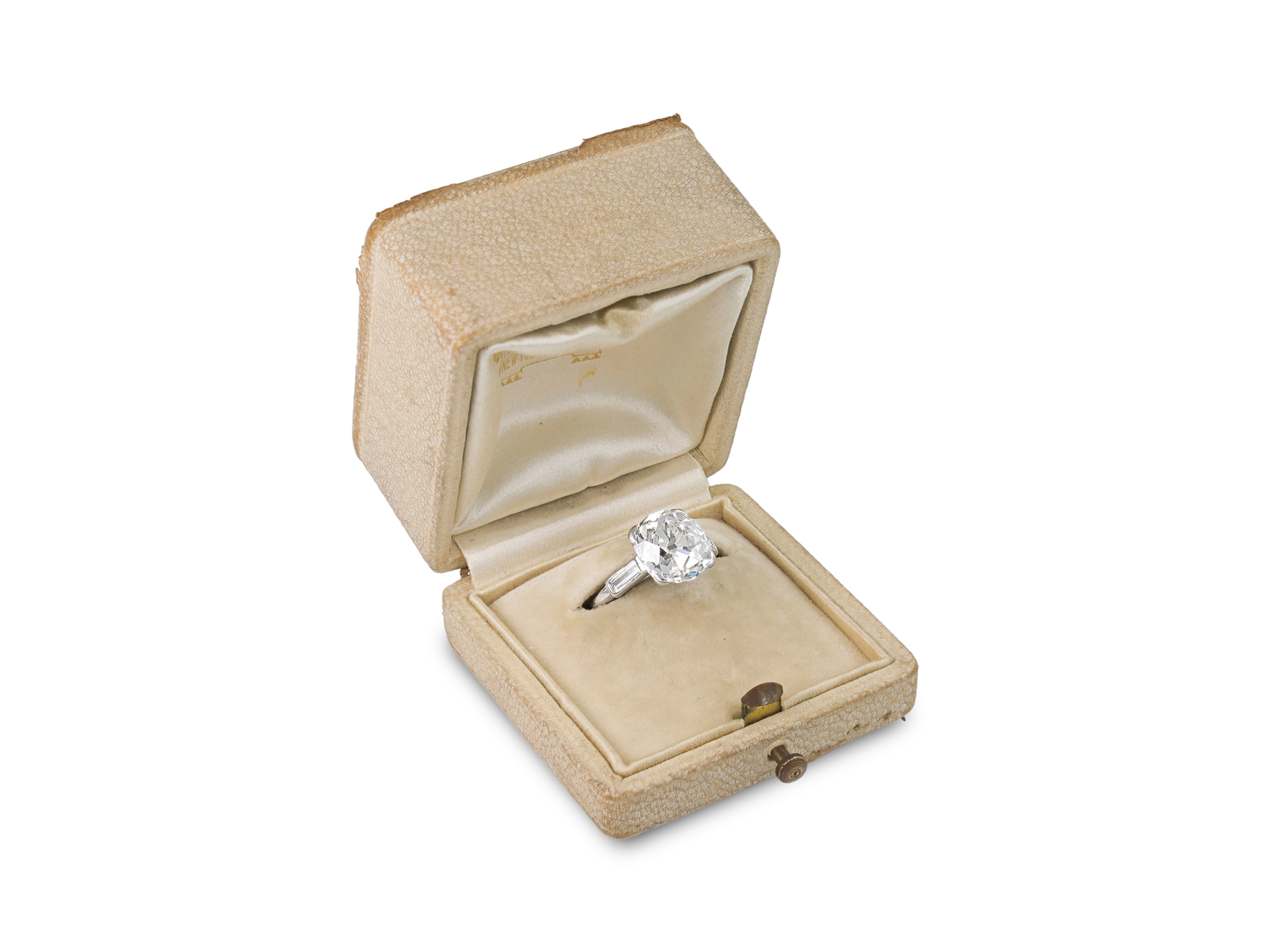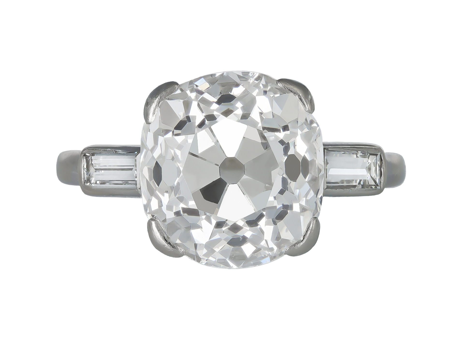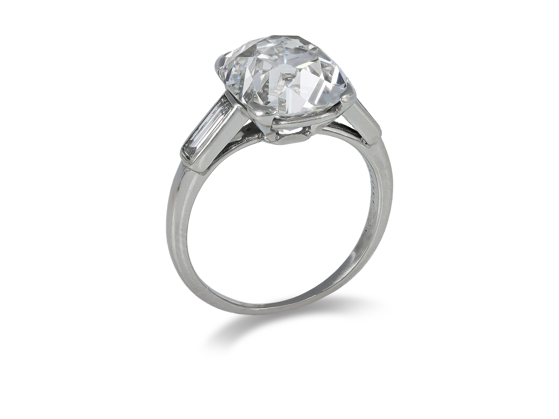 Cartier Paris 4.37 carat diamond flanked solitaire. Set to centre with a cushion shape old mine diamond in an open back claw setting with a weight of 4.37 carats, flanked by two rectangular baguette cut diamonds in open back rubover settings with a combined approximate weight of 0.40 carats. The total approximate diamond weight is 4.77 carats, to an exception flanked solitaire design featuring broad stylised claws, an open gallery and fancy shape open backholing, leading to raised shoulders which flow through to a D-shape shank. Marked platinum, signed 'Cartier Paris', accompanied by original receipt dated to the 28th June 1937, and original Cartier box.